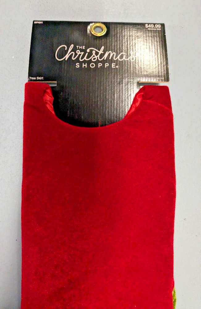 Add a festive touch to your Christmas tree with this beautiful red velvet tree skirt from The Christmas Shoppe. The skirt features a solid pattern with green leaves, adding a pop of color to your holiday decor. Measuring 52 inches in length, it's perfect for large trees and will cover the tree stand, making it a great addition to your Christmas decorations. Made of high-quality polyester and velvet materials, this tree skirt is not only stylish but also durable. It's designed with a textured feature and comes in a set of one piece. Please contact me with any questions. Thank you for looking.