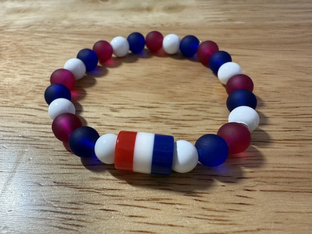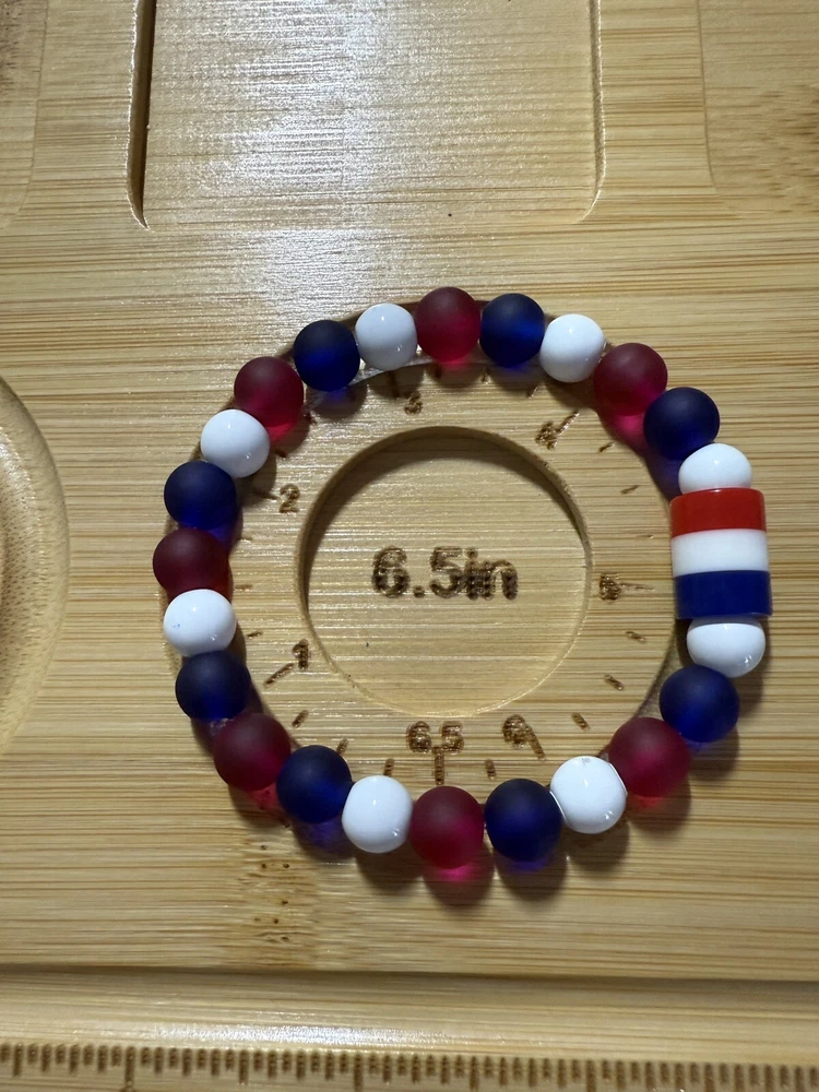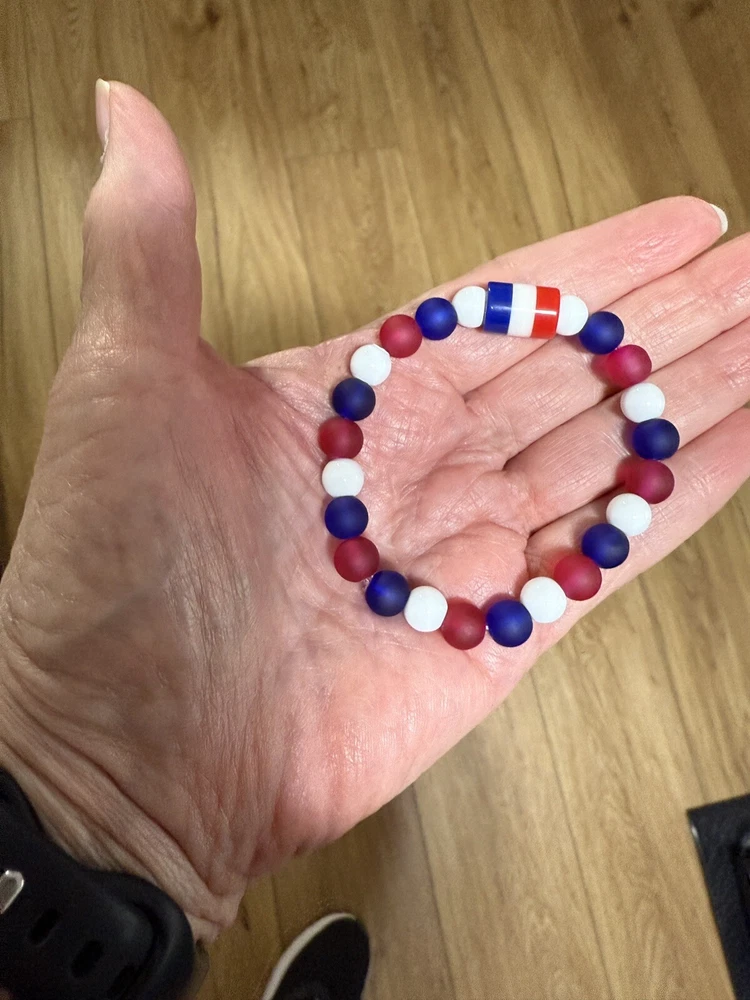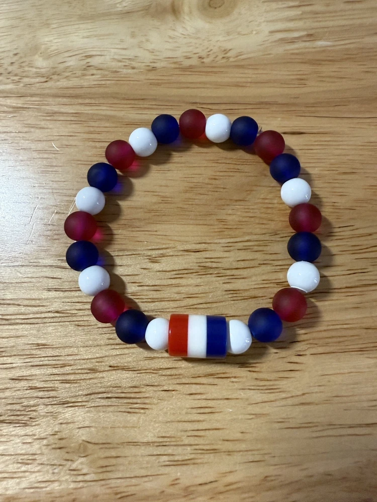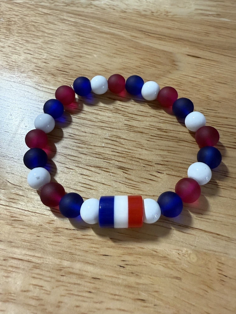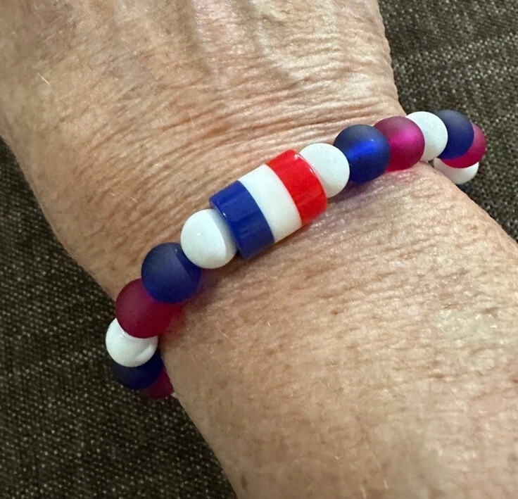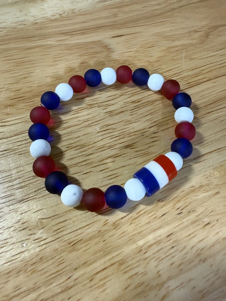 Add a touch of patriotism to your wrist with this beautiful handmade beaded bracelet. The round glass and resin beads in red, white, and blue give a stunning representation of the American flag. Measuring 6.5 inches in length, this bracelet is perfect for any woman who loves unique and meaningful jewelry. Notice the noodle shape red, white and blue resin focal bead. Reversible, stackable, and organza gift bag included, this bracelet is a perfect addition to any jewelry collection. The bracelet is not only stylish but also a great way to show your patriotism. Made in the United States, this bracelet is a must-have for any patriotic occasion.