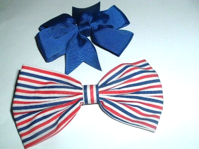 Two hair clips, one of a patriotic red white and blue cotton 3-1/2" bow and the other a 3" navy bow and both have clip backs. Perfect for a bun or ponytail. Condition is excellent, never worn. We combine ship.