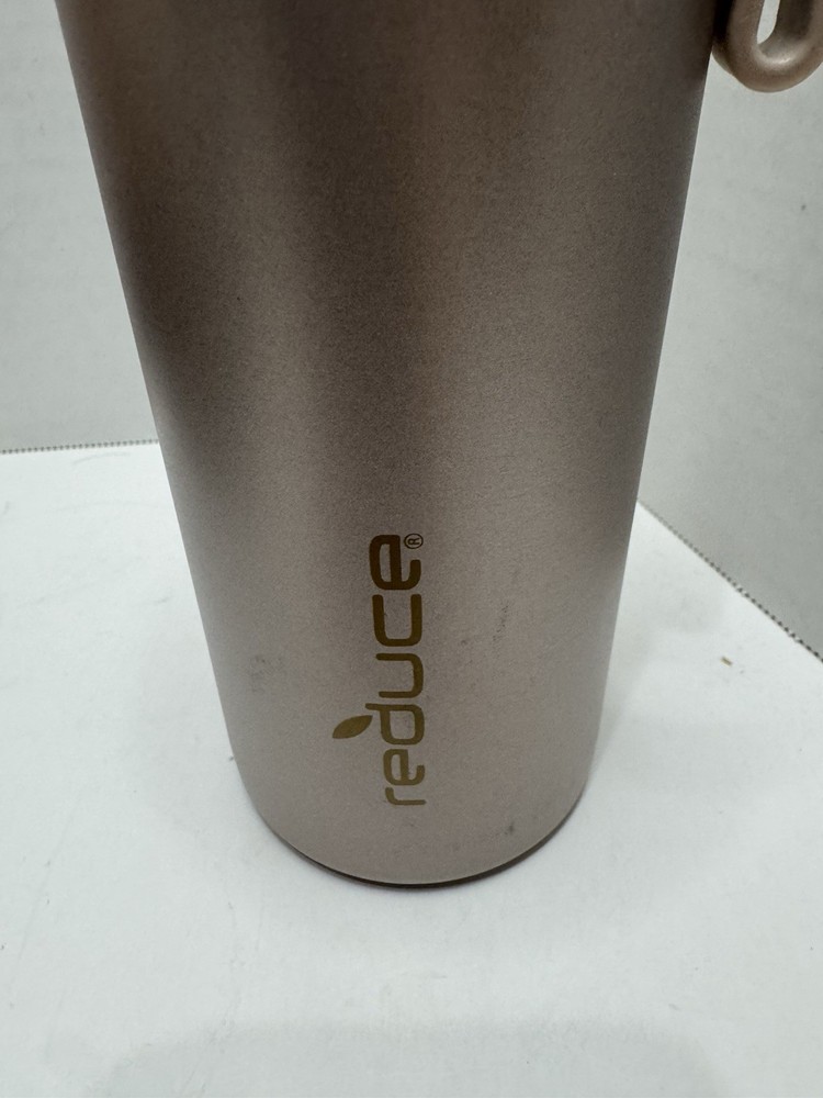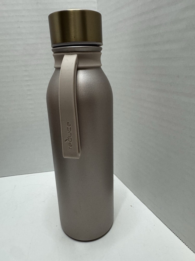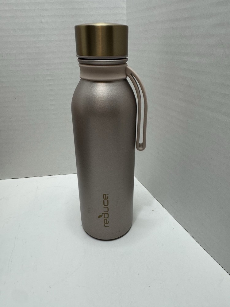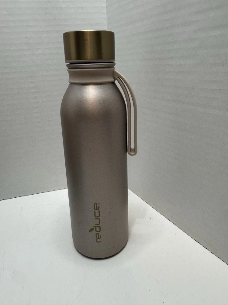 The Reduce Tumbler 20 oz Copper Gold with strap is a stylish stainless steel water bottle with a screw-on lid and a turquoise color. This insulated tumbler features a sporty theme and comes with a 3-piece set that includes the bottle with a strap for easy carrying. With a 20 fl oz capacity and a sleek design, it is the perfect choice for camping, hiking, or other outdoor activities to stay hydrated in style.