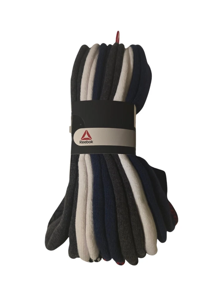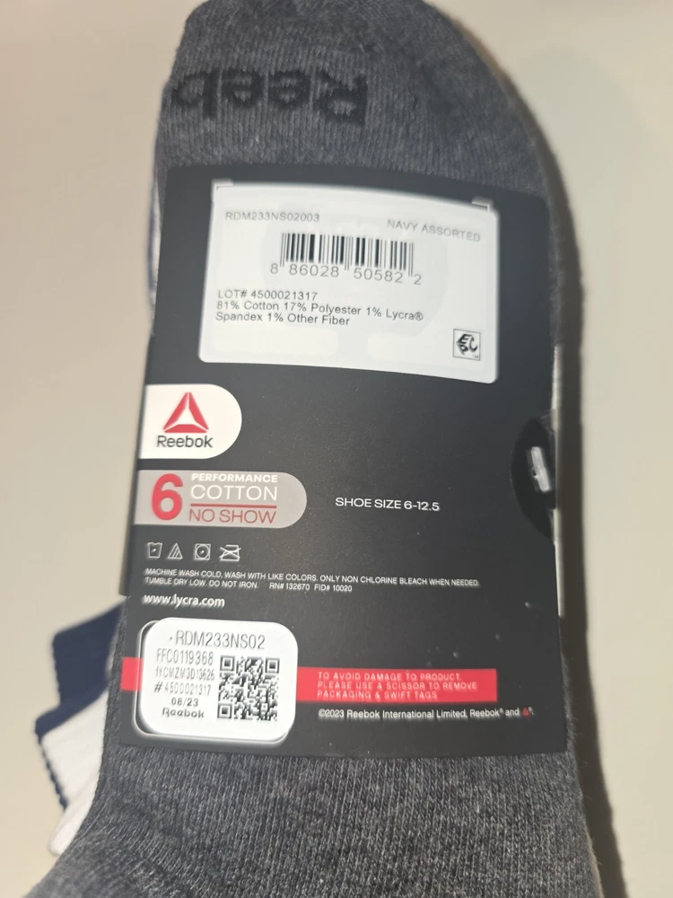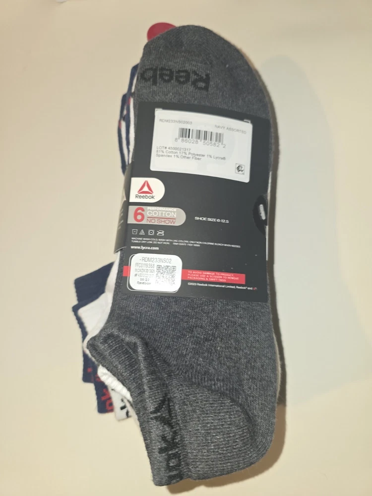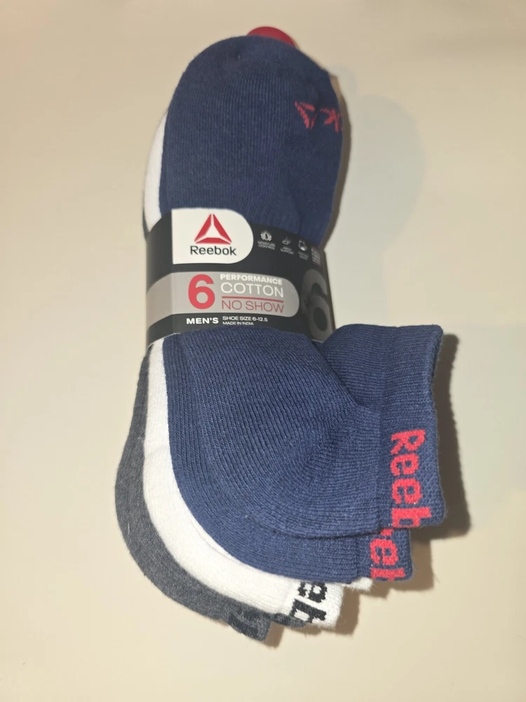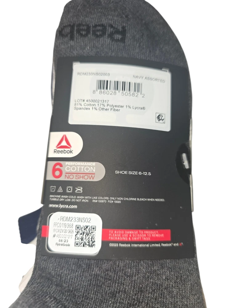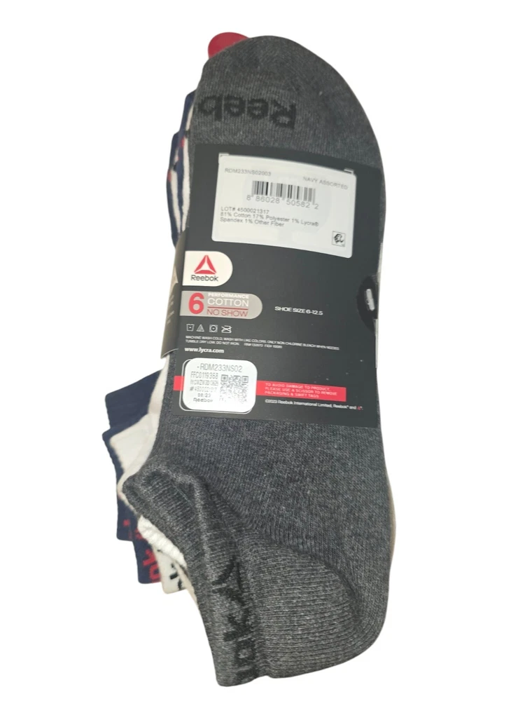 The Reebok 6-Pack Performance Cotton No Show Socks for men come in sizes 6-12.5 with a navy assorted color scheme. Made of polyester, spandex, and cotton, these athletic socks feature cushioning and moisture-wicking properties. Suitable for casual, formal, or business occasions, they are ideal for activities like gym training, walking, cycling, cross-training, and hiking in summer, fall, and spring seasons.