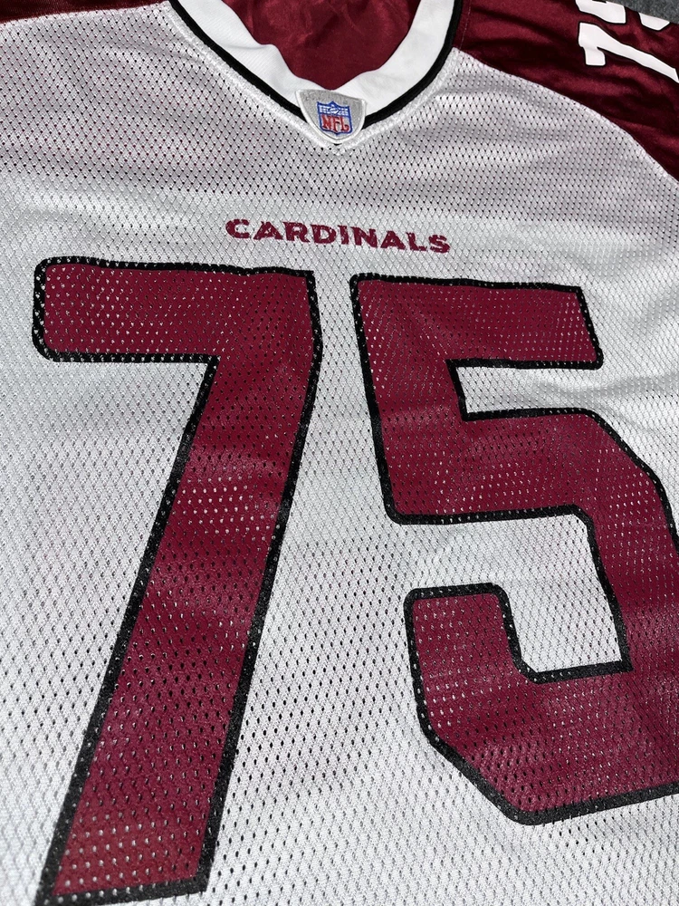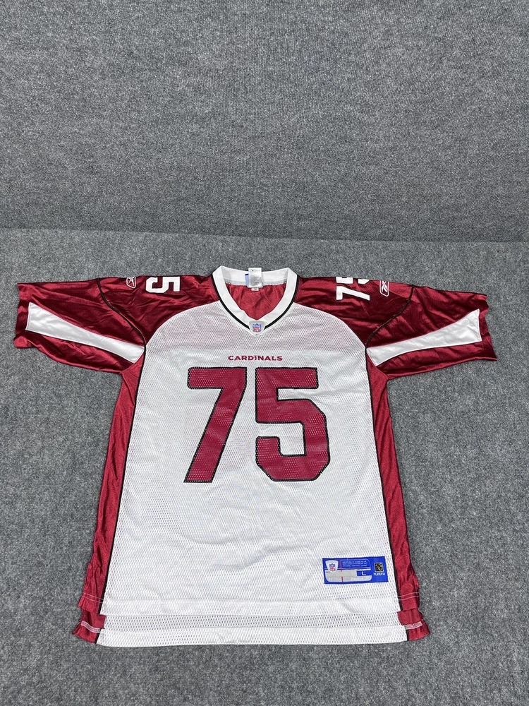 Show your support for the Arizona Cardinals with this Reebok football jersey featuring #75 Levi Brown's name and number. Made for men and available in size L, this jersey is perfect for any fan of the National Football League (NFL). The brown color and Arizona Cardinals team logo make it a great addition to your fan apparel and souvenirs collection. Whether you're cheering on the Cardinals during the regular season or just showing your love for the sport of football, this jersey is a must-have.