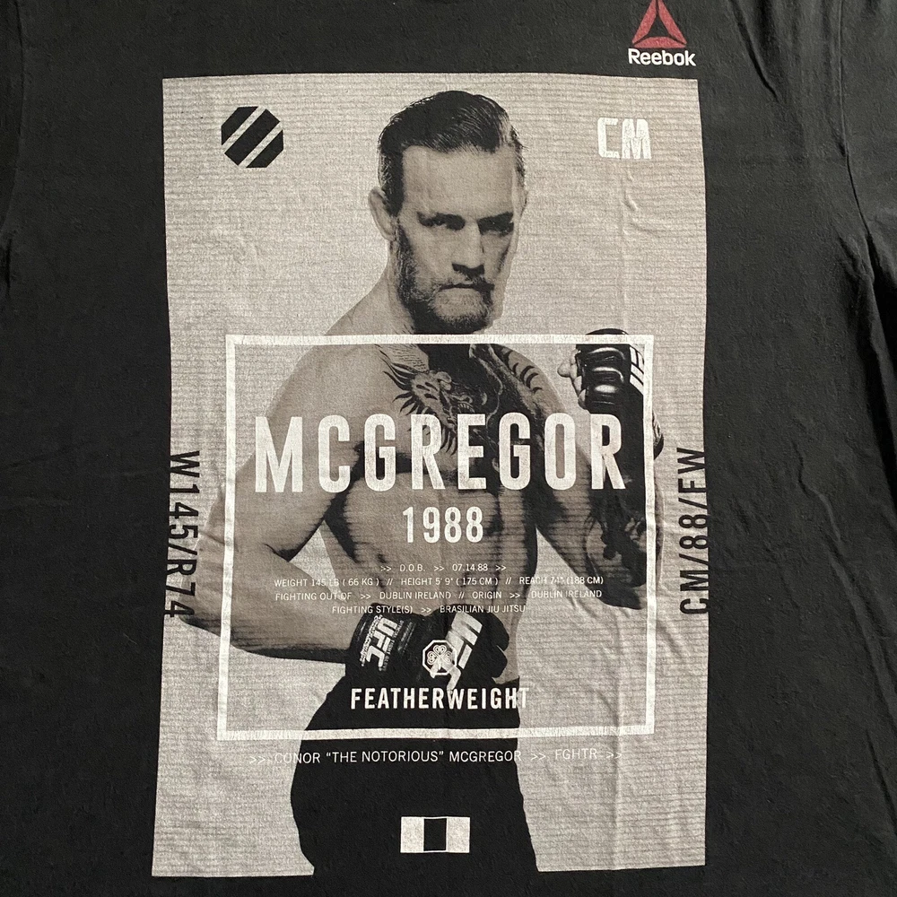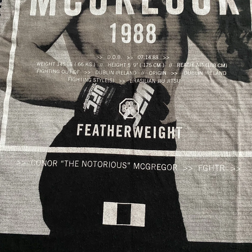 Length/Pit to Pit: 30”/25” Excellent used condition. No stains or tears. Colors are bright and vivid. All graphic prints are in flawless condition with no signs of distress. Great Connor McGregor shirt with the old school young graphic print from 1998. This is a reprint, but a great piece for any fan. Item is sold As Is; Item in pictures is the item you’ll receive. Thanks for looking and be sure to check my store as I list items daily. Please see photos for condition and measurements. Items are cleaned per eBay requirements, no fresheners or scents used. Stored in a smoke free environment.