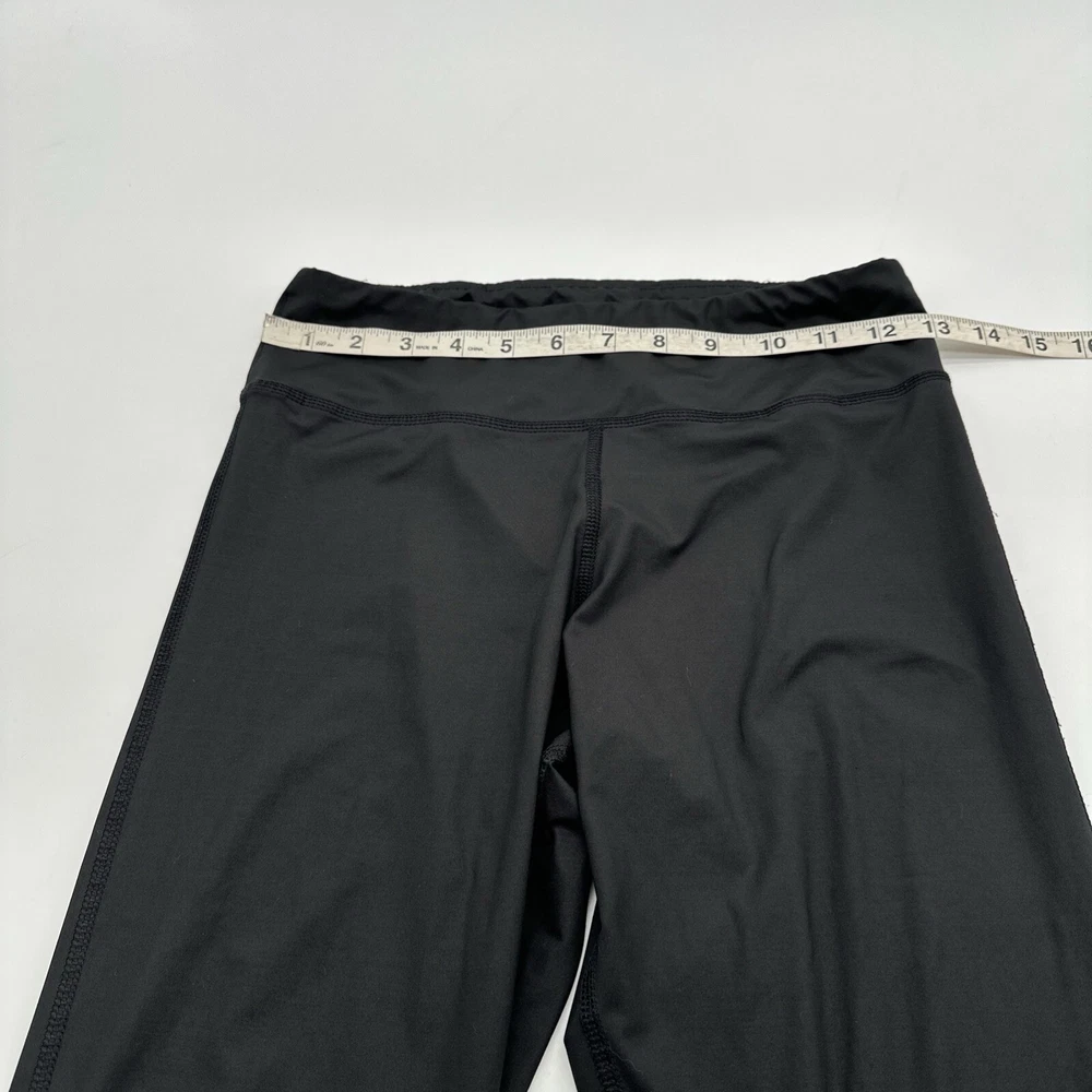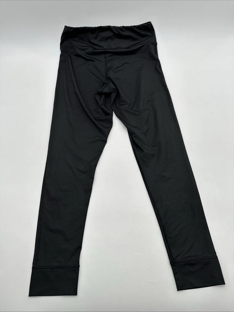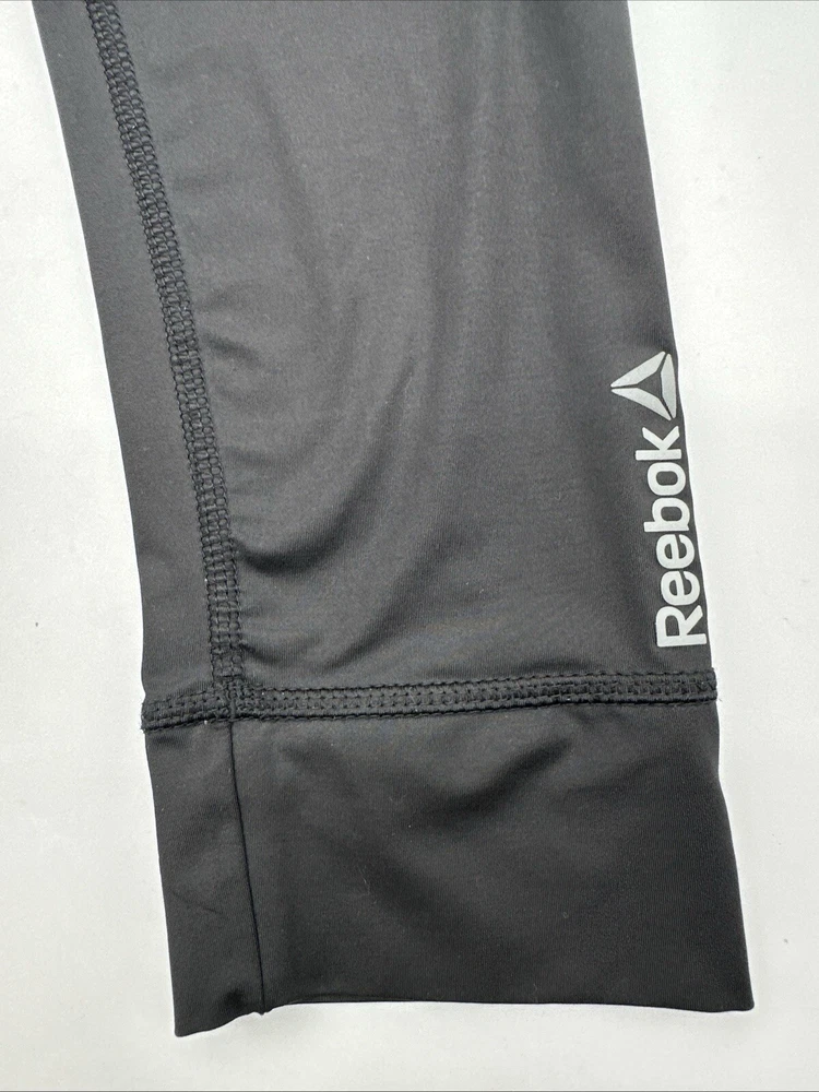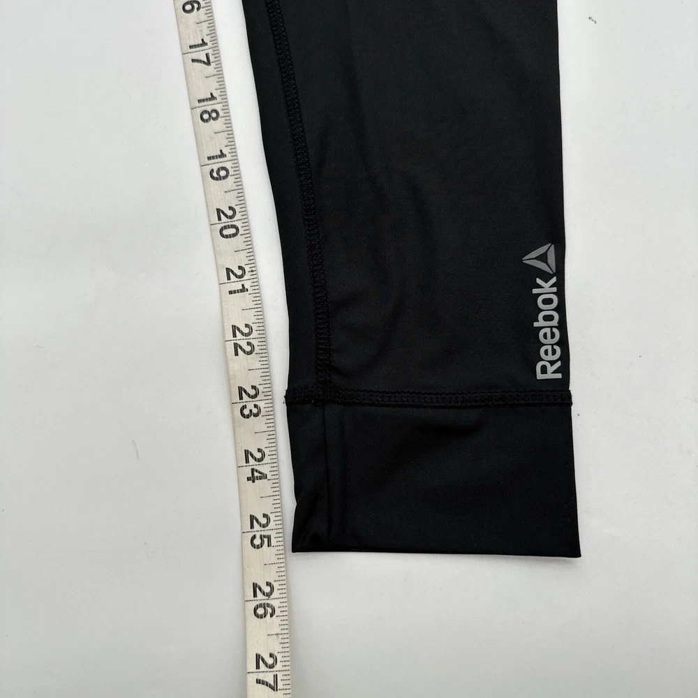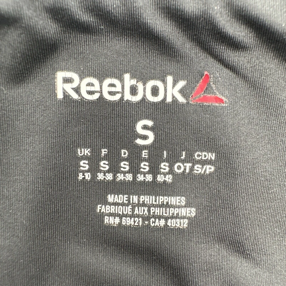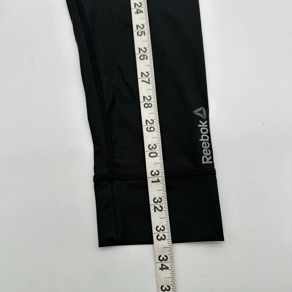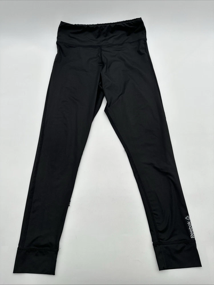 These are women's Reebok leggings in size small, featuring a solid black color with the Reebok logo. They are pull-on style, made of a polyester and spandex blend with an elastic waist for comfort and stretch. The leggings have an ankle length and a skinny fit, suitable for activities like CrossFit, yoga, and running. Made in the Philippines, these leggings are perfect for activewear and athleisure occasions. Check pictures for flaws and measurements