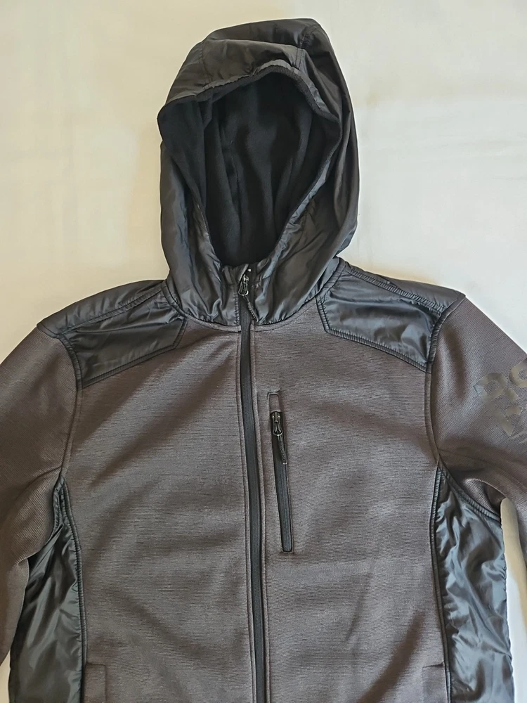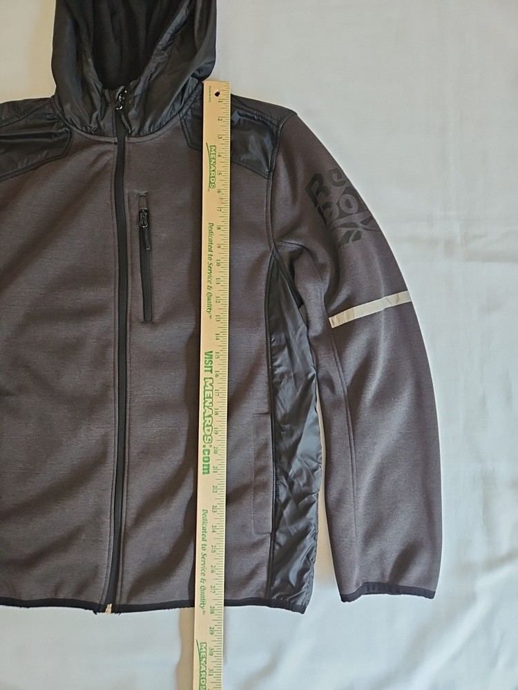 The Reebok Men's Hybrid Softshell Fleece Hooded Jacket in Black is a versatile and stylish outerwear piece perfect for casual occasions. Made with polyester outer shell material and featuring a softshell fabric type, this jacket offers both comfort and protection. The full zip closure, stand-up collar, and hood make it convenient for layering in various seasons. With accents like zippers and logos, this jacket also includes elastic waist, pockets, and a stretch fit for added functionality. The mid-length design and long sleeves make it a practical choice for activities like walking, cycling, or running. Pre-owned Excellent Condition Logo on the left side of chest is completely gone.