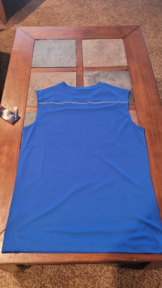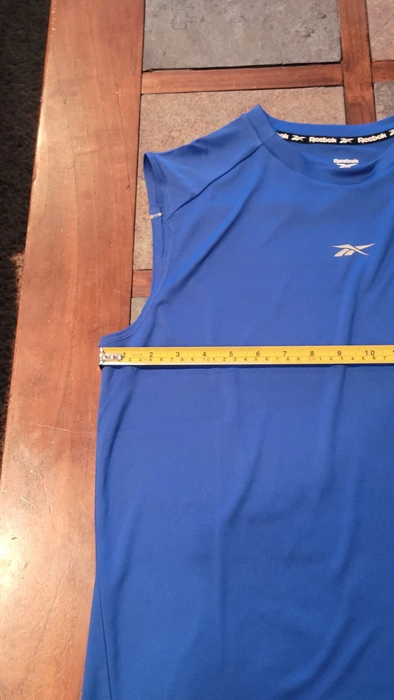 This is a Reebok Men's Performance Workout Tank Top in size Small, designed for activewear. It is sleeveless and comes in a blue color. Perfect for workouts and exercise, this tank top is a regular fit and suitable for men looking for comfortable and stylish activewear options.
