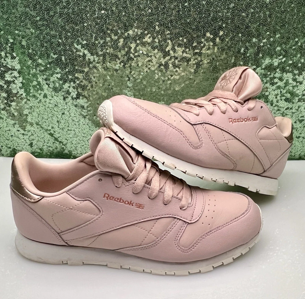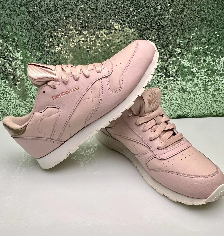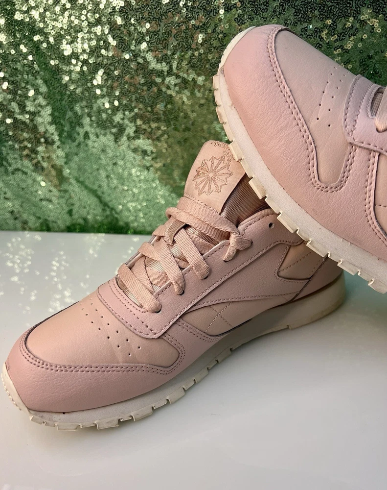 Reebok Women Athletic Shoes in Chalk Pink, size 6. These Classic Leather sneakers feature a lace-up closure and are crafted from leather. They offer cushioning, comfort, and breathability, making them ideal for activities like gym training, walking, and running. With a standard shoe width and a classic theme, these Reebok Classics Leather shoes are perfect for casual or activewear in the summer, fall, and spring seasons.