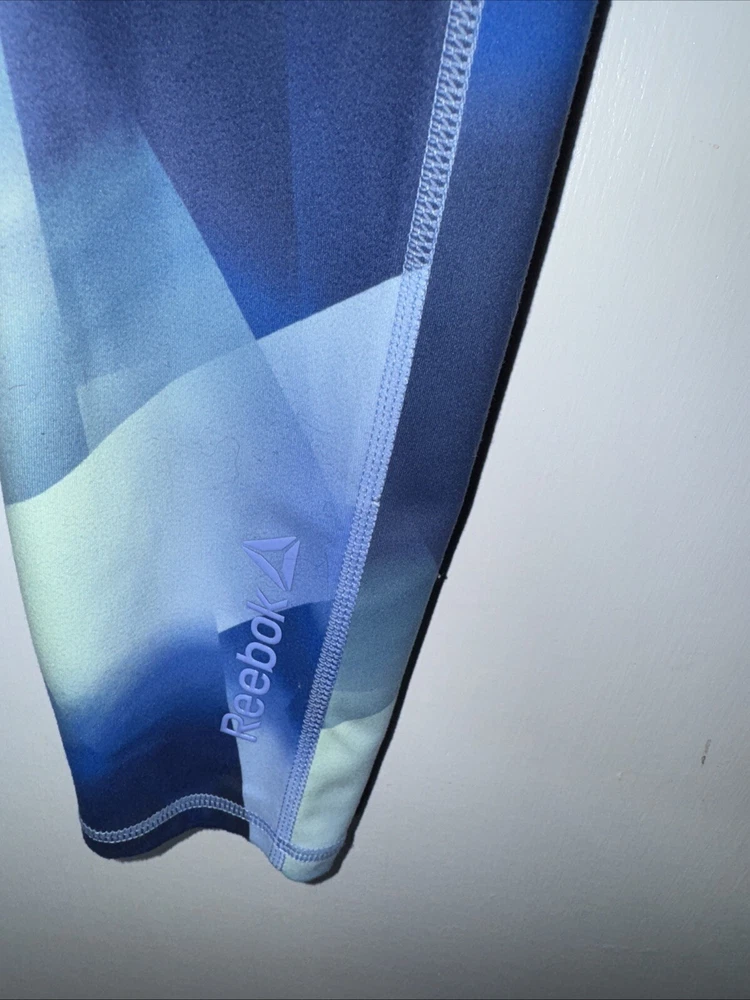 These are Reebok Women's Printed Evolution Mid Rise Leggings in size Small, featuring a blue geometric pattern. Made from a polyester blend fabric, these compression leggings have a 24-inch inseam and a 26-inch waist size. They are designed for activewear purposes such as CrossFit, yoga, and running, and include pockets for convenience. The leggings are part of the Reebok CrossFit product line, suitable for athleisure wear in summer, fall, and spring.