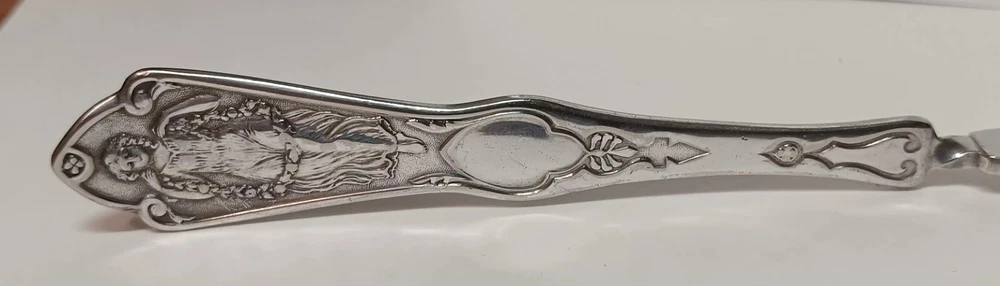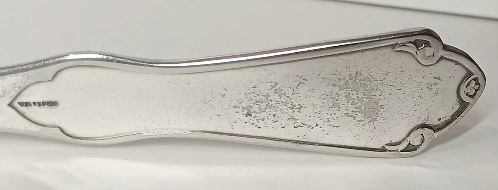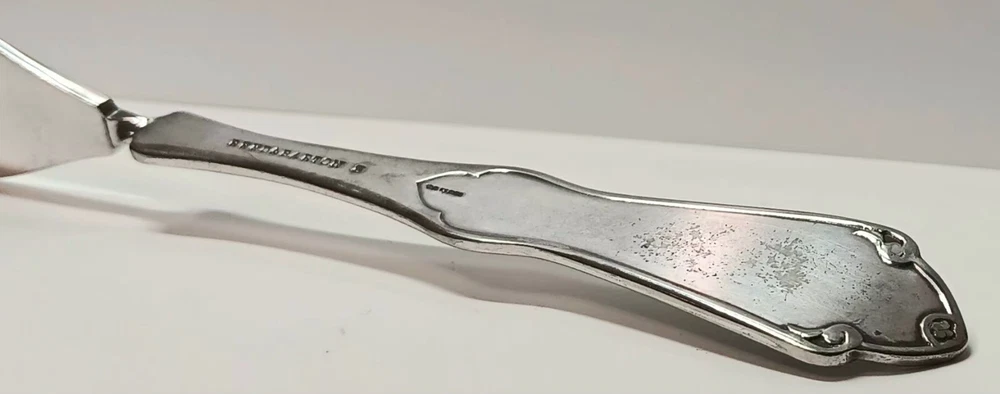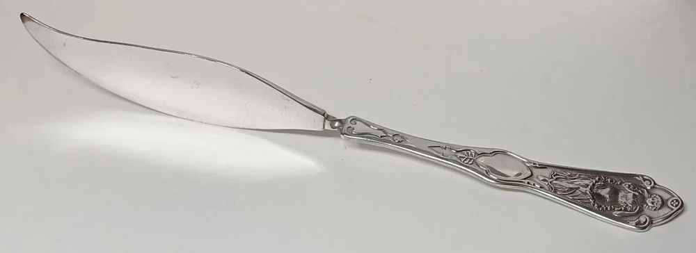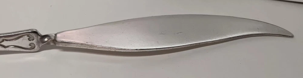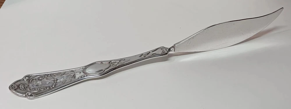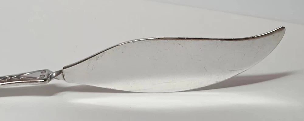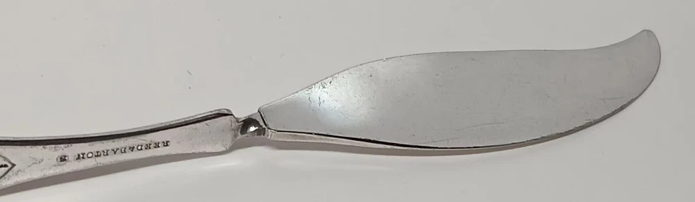 This is an antique Reed & Barton silver plated, 7 7/8" twist handle fish knife. It is in good used condition with light exposure or brassing of the back of the handle where it rested on the table. There is also the expected polishing wear, scuffs and scratches on a used piece that is likely over a century old. It has never been monogrammed. Please examine the photos for further details about design and condition.