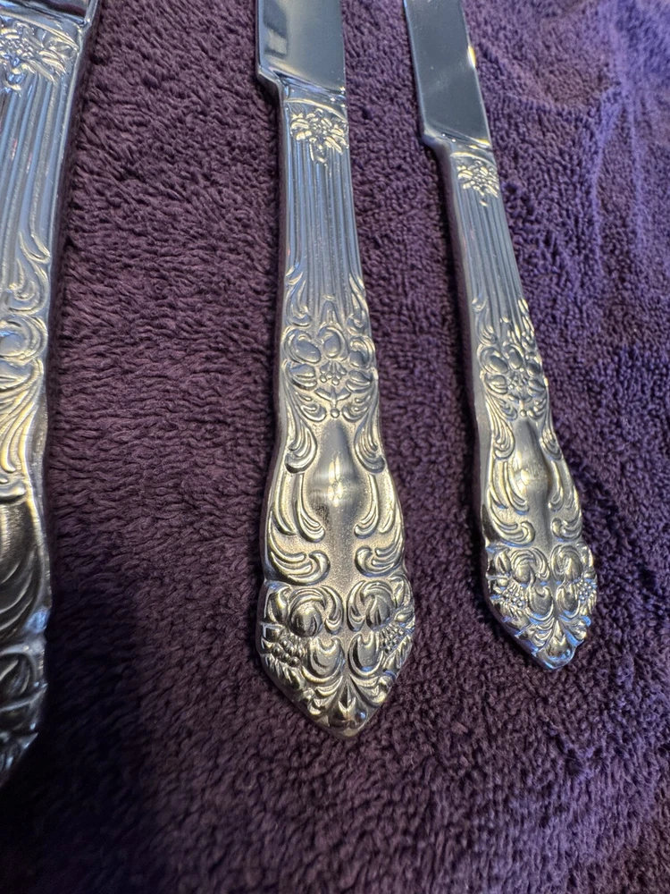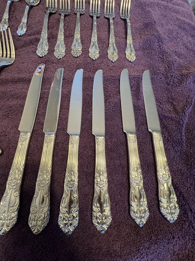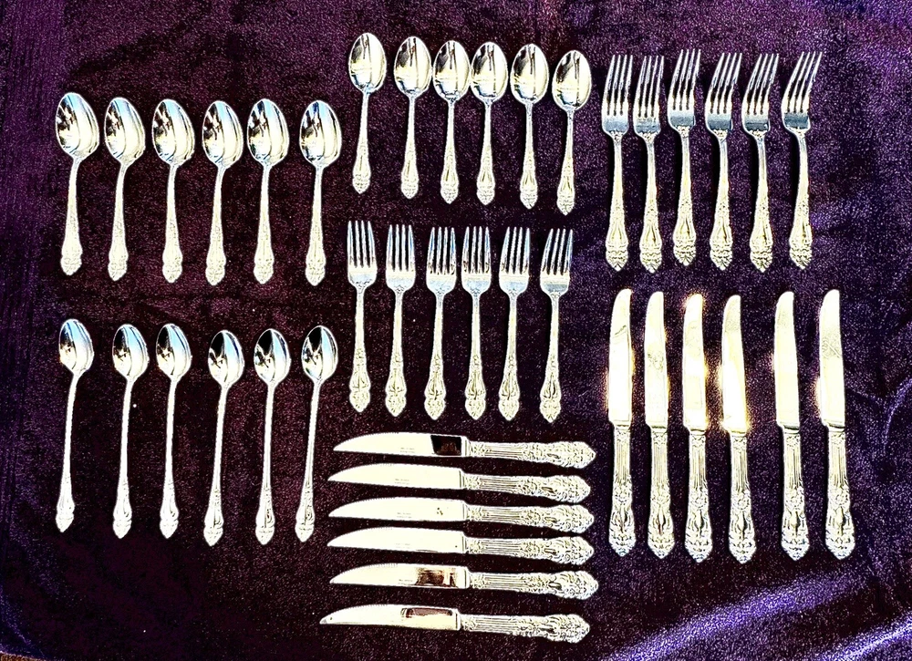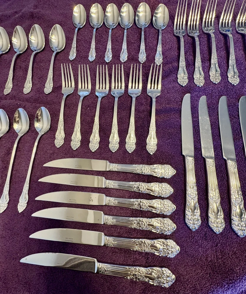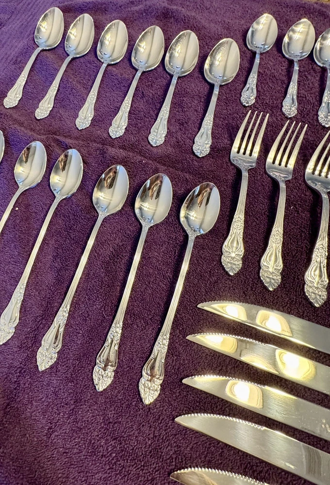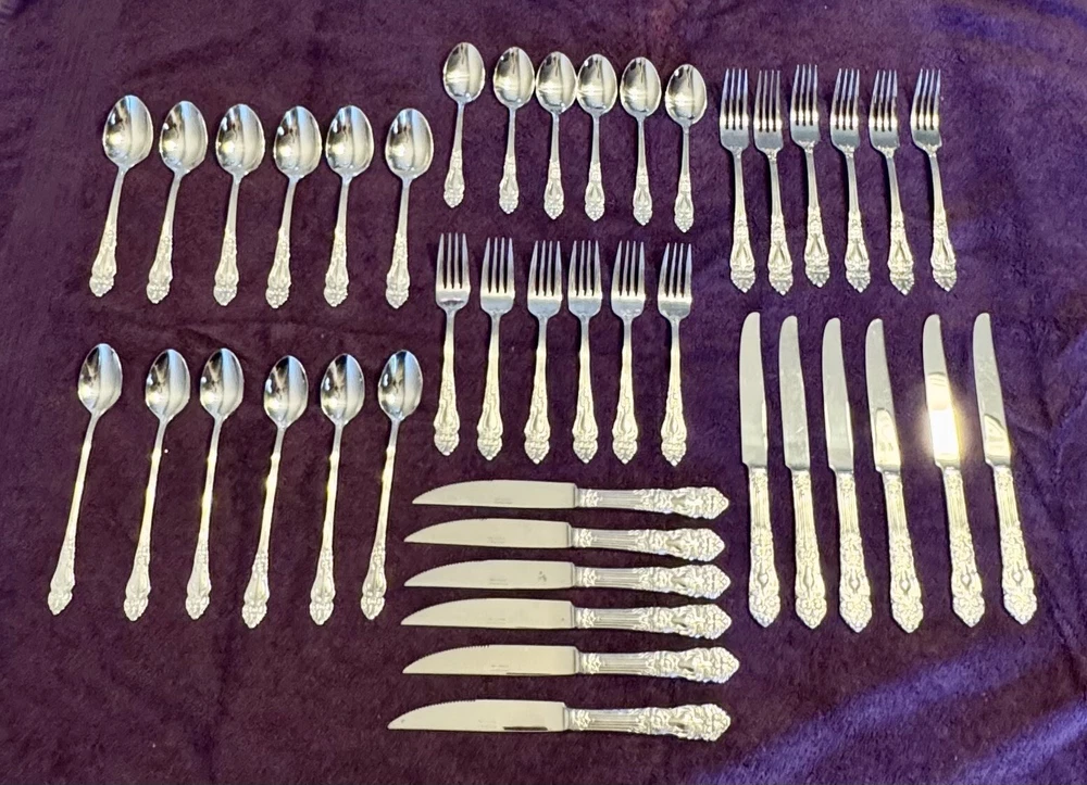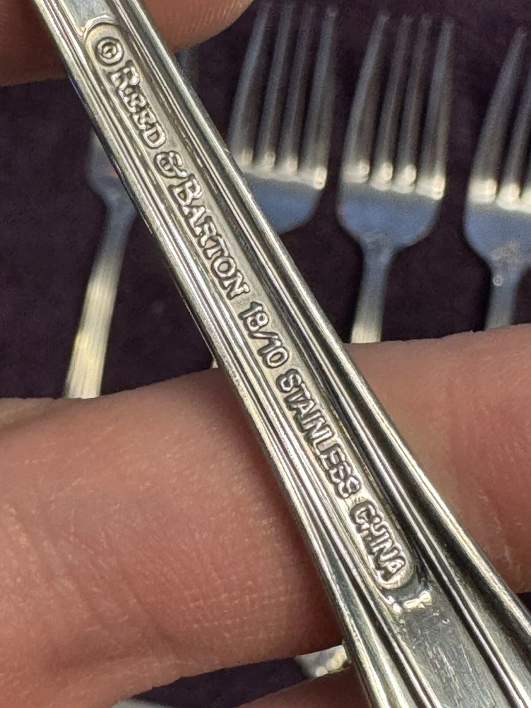 Gorgeous and only SOME have been used. Others are still brand new. So other than a few water spots/surface scratch (very light) these are in excellent and beautiful condition! Includes service for 6 and includes steak knives and long stem tea spoons. **see my other listings for the hostess collection from this same style! Shipping is for weight. This is a 42-piece flatware set made by Reed & Barton, featuring the Haversham pattern with an Art Deco style. The set includes six place settings with a knife, fork, long stem tea spoon, spoon, and steak knife. It is made of 18/10 stainless steel with a glossy finish and is reusable. The handle pattern is Haversham and the handle material is also stainless steel. The set is perfect for any occasion and is suitable for use in the kitchen or dining department.