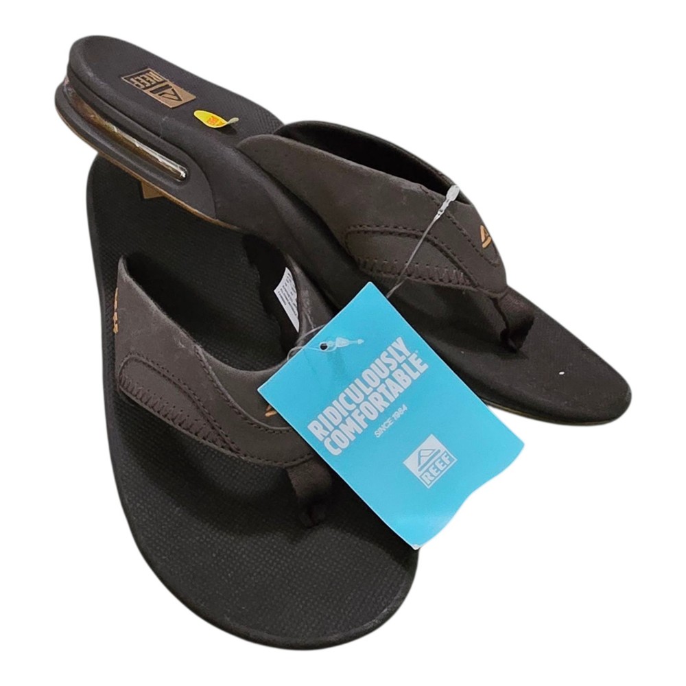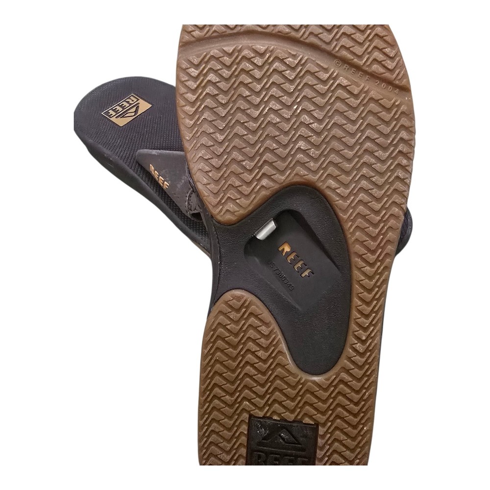 The Reef Fanning Flip Flops in new brown are perfect for beach fun and vacation adventures. These men's sandals feature a unique bottle opener design, making them both stylish and practical. With a synthetic upper material and a comfortable flip flop style, these Reef sandals in size 9 are sure to be a hit on your next beach outing.