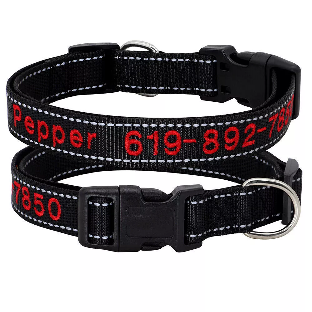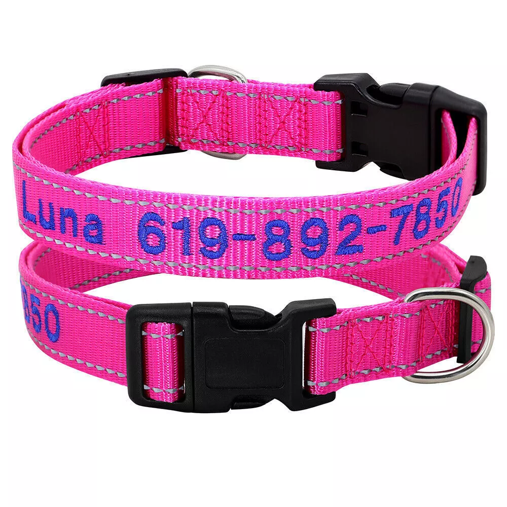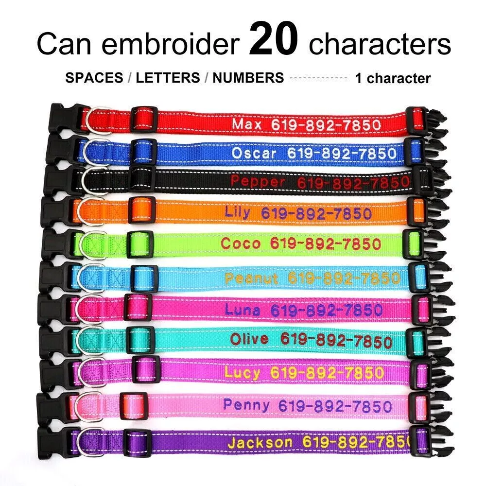 If you need to purchase multiple, You first choose a color to fill in the text you need, then add it to the shopping cart, and the other one will do the same. Finally, you can make the payment together. You can get the discount. Embroidered Dog Collar Type: ReflectiveEmbroidered Personalised Custom Name Phone Collar for Small Medium Dogs Material:Nylon 11 Colours:Black/Dark Blue/Blue/Green/Light Green/Dark Purple/Purple/Hot Pink/Pink/Orange/Red Features: Soft Durable nylon material,it's comfortable for your pet to wear. A great way to know that someone can contact you if something happens and your dog gets away from you. Personalized dog collars are made from the strongest and most durable products Reflective design,safety walking at night. The collar features a secure side-release buckle and a non-corrosive D-ring. Embroidered design will make your dog more cool . The stitching can be done in color as picture shows Different colors and sizes,you can choose a right 1 pcs for your pet. Measurement of current collar. This will make it much easier for me to keep from covering the embroidery. Fit for small to large dogs.e.g.Chihuahua/Yorkie/Pug/Bichon Frise/Dachshund/Schnauzer/French Bulldog/Beagle/Pitbull/Labardor/German Shepherd, Golden Retriever,Rottweiler.etc Package Include:1xDog Collar. If you need to purchase multiple, You first choose a color to fill in the text you need, then add it to the shopping cart, and the other one will do the same. Finally, you can make the payment together.You can get the discount. Sample Text:(Please leave us engrave information at check out,we will embroidery it for you ) Abby*012-345-6789 Size Neck Adjustable Width S 10-16"(25-40cm) 5/8"(1.5cm) M 12-19"(30-47cm) 3/4"(2.0cm) L 15-24"(37-60cm) 1.0"(2.5cm) XL 17-28"(42-70cm) 1.0"(2.5cm) Note: Please measure the neck size of your pet before ordering.That's important! Please allow 0.5-1 inch(1-3cm) error due to manual measurement.