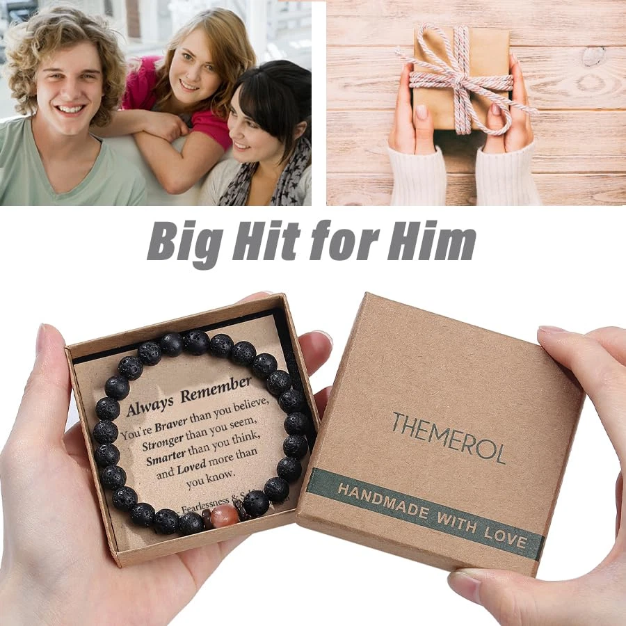 【Gifts for Men Boys】This handmade bracelet comes with a backing card which features the text 'Always remember you are braver than you believe...' This bracelet combined with Strength Volcanic Rock and Fearlessness Sunstone. It brings him powerful strength,courage,self-confidence and protection. It works amazing as gifts for teenage boys, teen boys gift ideas, Valentines Day gifts for him, birthday gift ideas for teen boys men. 【Unique Design & Solid Craftsmanship by Great Artisan】Every bead is high quality and has been carefully selected manually one by one. Original design and coming with meaning card make sure your gift is unique and a big hit to him. Solid Craftsmanship make sure it's super comfortable for daily-wear and will not easily fall off/come apart. This meaningful and cool bracelet can be worn and protect him for a long time. 【Stretchable Design & Fits Most Men/Teens】The attractive bracelet for men/teen boys is stretchable, 7.5 inches inner length, it fits well, nice and tight for most wrists of teenagers and men, so you don't have to deal with sizes. It's really convenient, cool and very easy to put on and take off. 【Packaged with Care & Giftable】The beaded bracelet has been packaged with care by nature friendly materials. It is great as stocking stuffers for men,stocking stuffers for boys, gifts for teenage boys,teen boys gift ideas,Christmas gifts for him, birthday gift ideas for boys, Valentines day gifts for teen boys, Easter gifts, Confirmation gifts for teenage boys, graduation gifts for him, unique gifts for son grandson boyfriend nephew brother. 【Buy with Confidence】We take great care to ensure that each and every piece of jewelry or gift leaves our workshop looking fabulous, and each order is sent out carefully wrapped and presented in a cute gift box ready to gift. In case you have any problem or query please contact us at any time, and your problem will be solved within 24 hours. Product Description Unique Trendy Gifts for Teens/Kids - Inspirational, Masculine & Meaningful Gifts for Him Every Bead is High Quality and has been carefully Selected Manually One By One. The Natural Sunstone symbolises Fearlessness, it brings him powerful strength, courage and self-confidence . Original Designed with Love The meaningful bracelets are Cool , Unique and Attractive . They're Versatile and Easy to Match the Outfits . High-quality and Solid Craftsmanship Every Bead is High-quality and Different . Solid Craftsmanship make sure it's super comfortable for dailywear and will not easily fall off/come apart. This meaningful and cool bracelet can be worn for a long time. Put a big smile on his face with the handsome bracelets The Meaningful Design and the Double-side informative card that came with the bracelet makes your gift MORE Thoughtful, Unique and Surprised . A Special Way to Express Your Love and Encouragement The Meaningful Bracelet and Thoughtful Package is Special and a Nice Little Keepsake . He can take the meaningful bracelet with him as a Reminder of your Love and Encouragement everyday. This handmade bracelet will make a nice gift as Christmas gifts for teens, stocking stuffers for teen boys, stocking stuffers for kids, gifts for teenage boys, teen boys gift ideas, Valentines Day gifts for him, birthday gift ideas for teen boys men. Stretchable Design & 2 Sizes Fit Most Kids/Teens/Adults The attractive bracelet for men/teens/kids is stretchable . 7.5 inches inner length, it fits well, nice and tight for most wrists of Teenagers with LARGE wrist sizes or Adults . 6.3 inches inner length, it fits well, nice and tight for most wrists of Teenagers with SMALL wrist sizes or Kids . It's really convenient, cool and very easy to put on and take off. Packaged with Care & Giftable The handmade bracelet has been packaged with care in an elegant gift box . The informative card that came with it makes your gift more thoughtful. It's great as stocking stuffers for men, stocking stuffers for boys, gifts for teenage boys, teen boys gift ideas, Christmas gifts for him, birthday gift ideas for boys, Valentines day gifts for teen boys, Easter gifts, Confirmation gifts for teenage boys, graduation gifts for him, unique gifts for son grandson boyfriend nephew brother. Thank you for visiting THEMEROL Gift Store . May Your Family Have A Holiday Season that is Full of Wonderful Surprises, Treats and Nonstop Laughter.