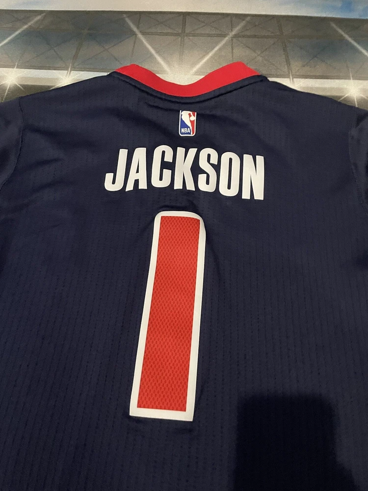 Show your love for the Detroit Pistons with this Reggie Jackson #1 Motor City Adidas Swingman Jersey. Made for basketball fans, this original and authentic jersey is perfect for anyone who wants to support their favorite team. The jersey features the Adidas logo, as well as the Detroit Pistons emblem, making it a must-have for any true fan. This jersey is size XL and has been previously worn, adding character and style to your wardrobe. It's perfect for game day or everyday wear, and is sure to make a statement wherever you go. Get your hands on this unique piece of fan apparel and show your love for the Pistons today!