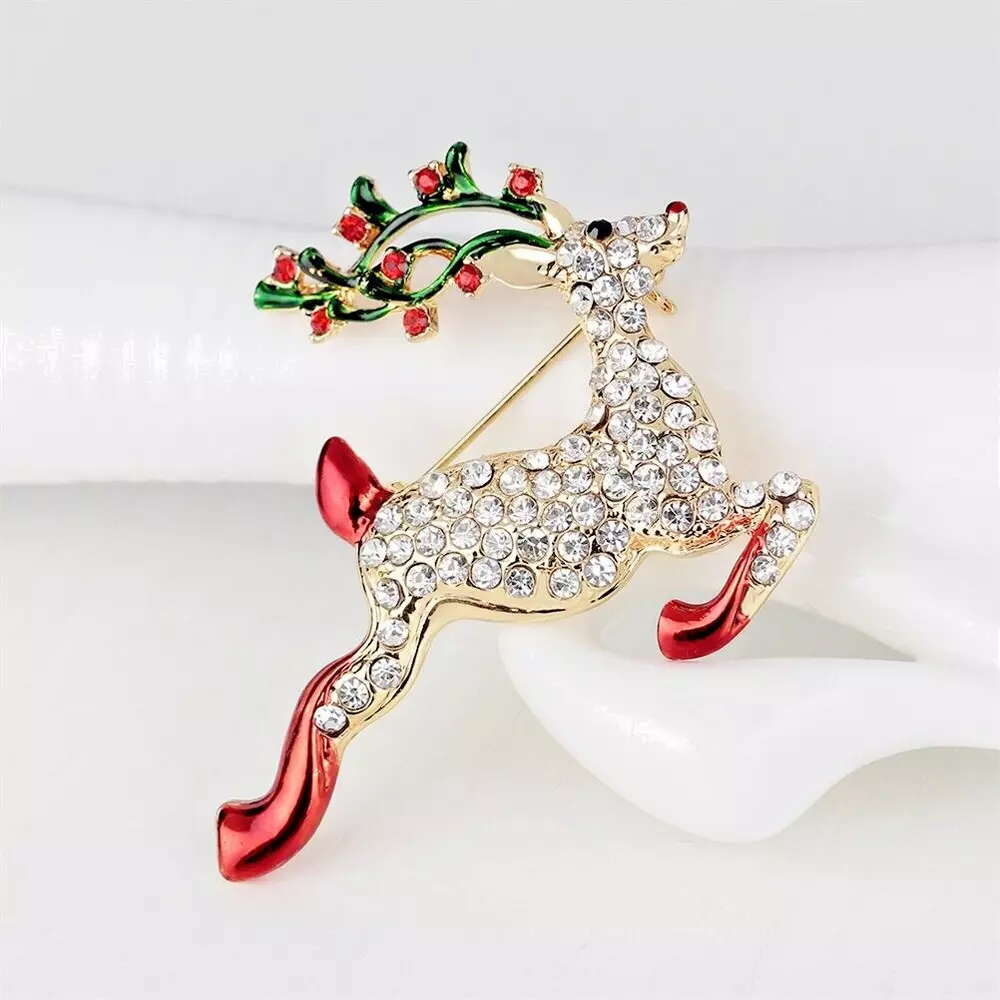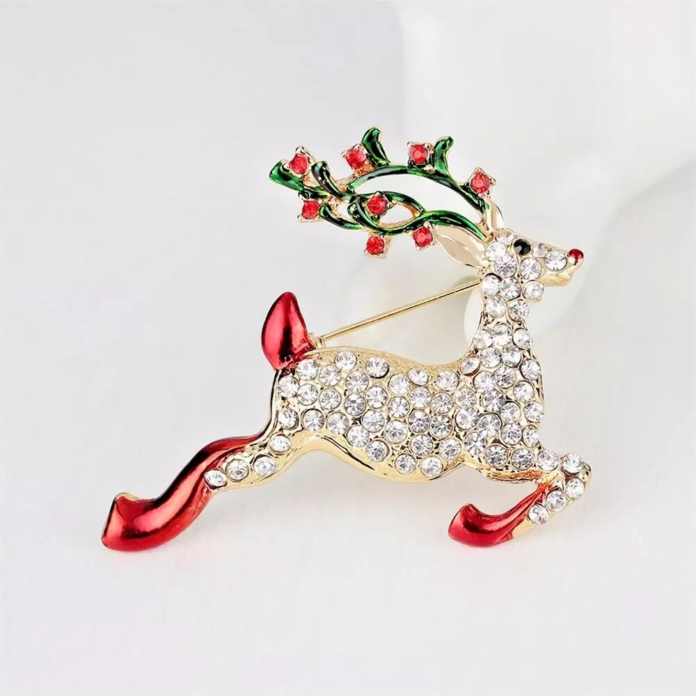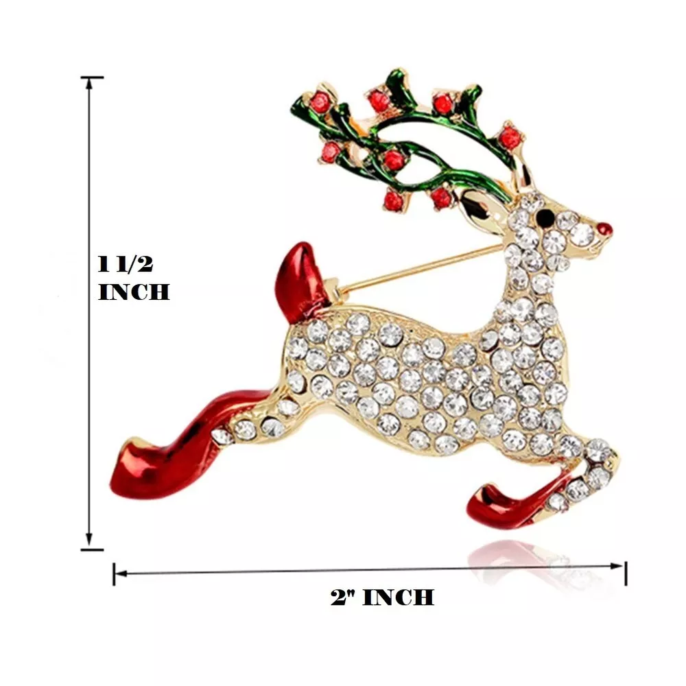 Reindeer Christmas Crystal Rhinestone & Enamel Brooch Pin with Gold Bag Brooch is 1 1/2" x 2 " Free Gold Foil and Cloth Bag Come see all of our other Brooches, Bracelets, Earrings, Necklaces, Pendants, , Rings, and Glow in the Dark jewelry today.