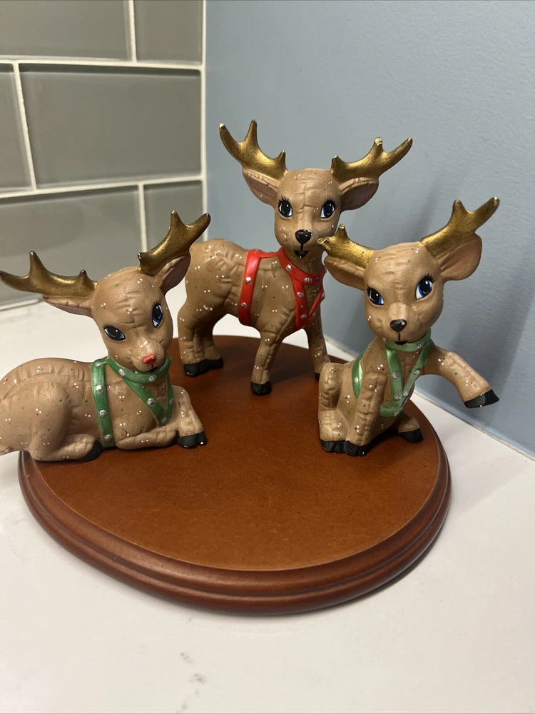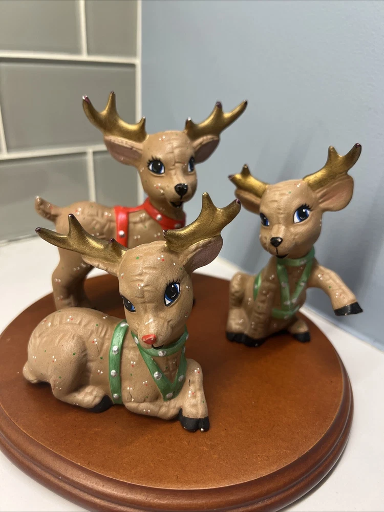 This set of three Reindeer Christmas Figurines are medium-sized ceramic figurines. Hand-painted with polka dots and featuring a brown matte finish, the figurines depicts a festive reindeer characters in different poses. Please see all photos for condition. Older set. I see touch ups on antlers