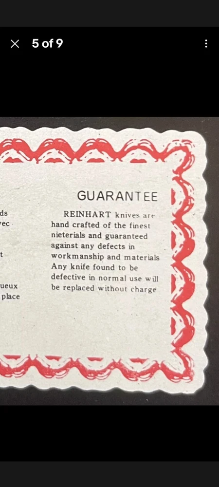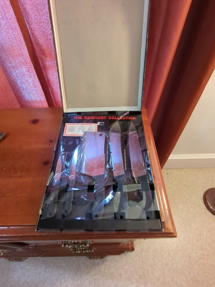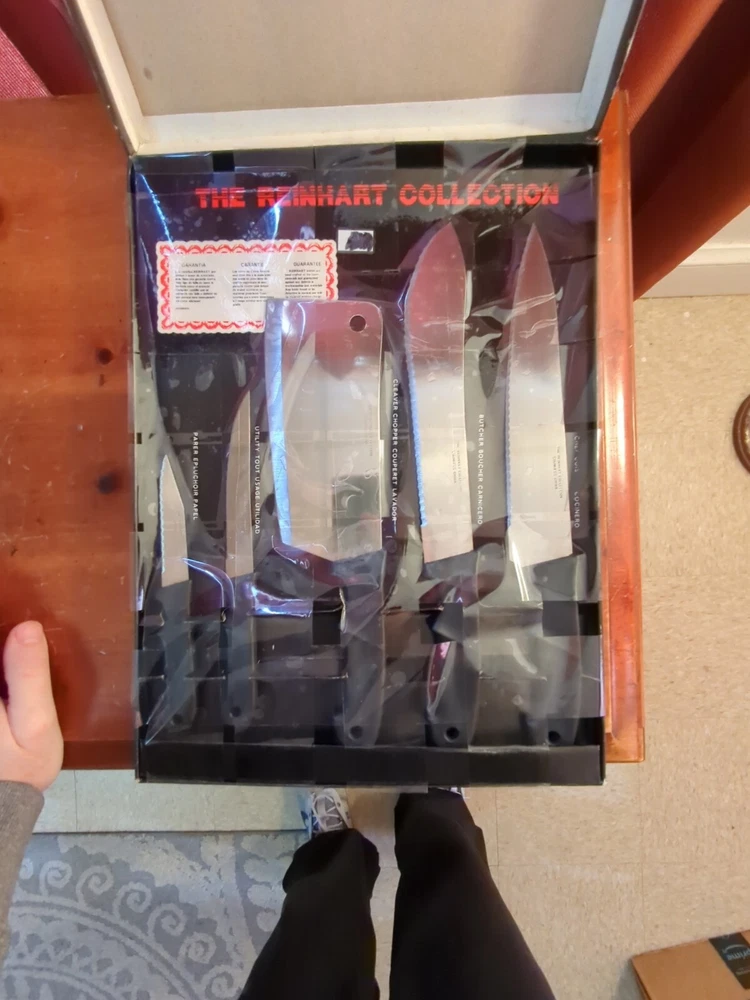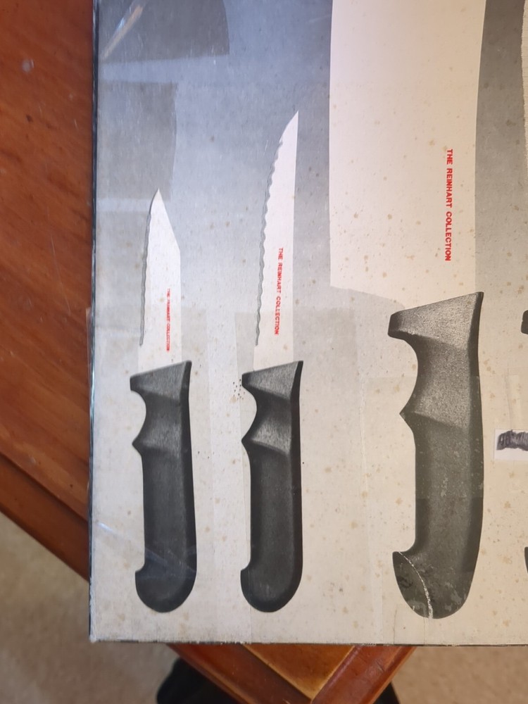 BRAND NEW OPEN BOX SET OF 5 KNIVES NEVER NEEDS SHARPENED SHIPPED WITH CARE The Reinhart Collection Set of 5 knives features stainless steel construction in a sleek black color. These knives are designed to never need sharpening, ensuring lasting sharpness and durability. The set includes a variety of knives for different kitchen tasks, all brand new in box.