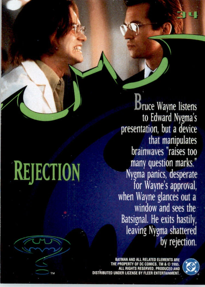 Graded: No Autographed: No Season: 1995 Set: 1995 Ultra Batman Forever Type: Non-Sport Trading Card Card Number: 34 Year Manufactured: 1995 Player/Athlete: Rejection Franchise: NON_SPORT