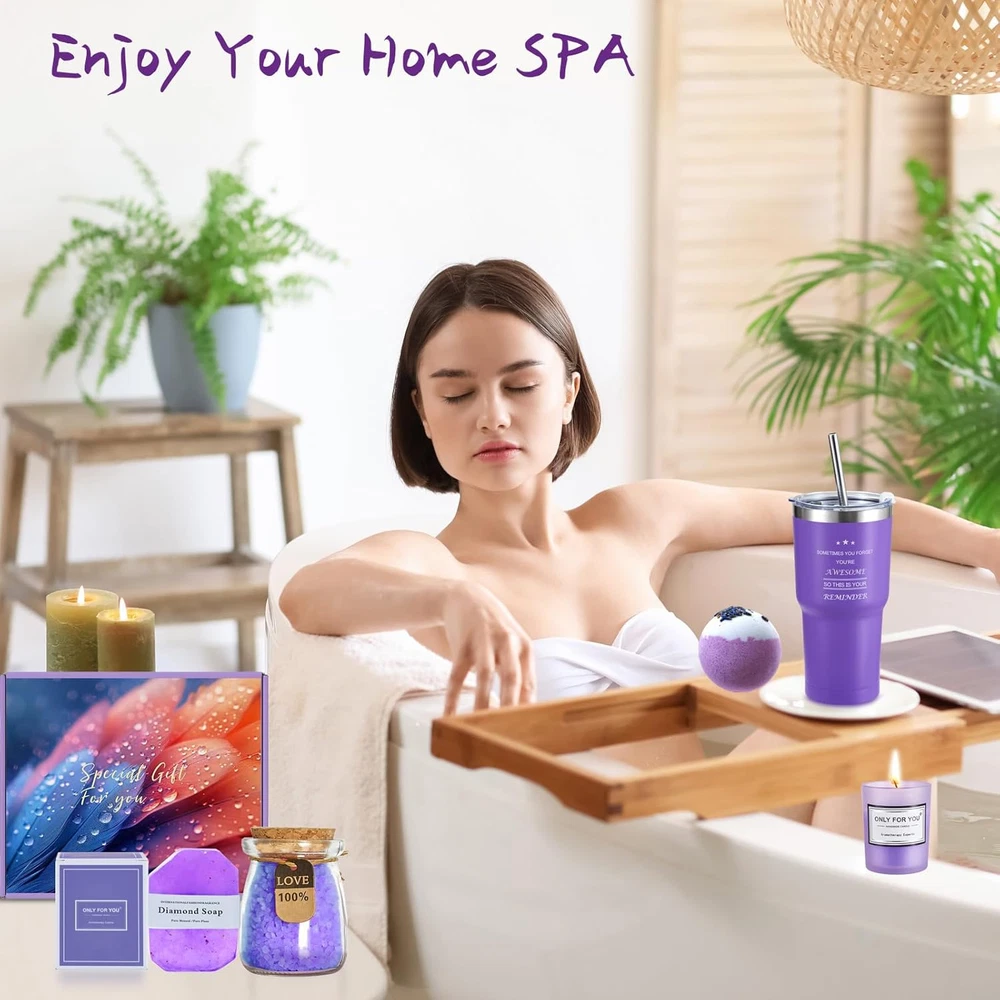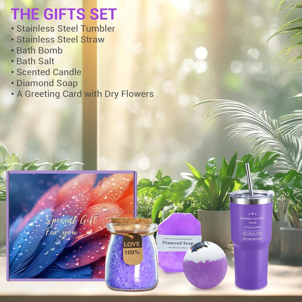 Store New Arrivals Add to Favorite View Feedback Contact Relaxing Spa Gift Basket, Valentines Day Gifts for Women, Birthday Gifts for Women, Tumbler Unique Self Care Gifts Set for Her Mom Best Friends Wife Girlfriend Sister Teacher Bestie Female Coworker Description Item model number Giftsets-Purple Item Form Liquid Country of Origin China Product Benefits Moisturizing Use for Whole Body Scent Lavender Package Dimensions 8.15 x 5.91 x 3.74 inches; 2.07 Pounds Spa Gift Basket Set for Women: The exquisite gift basket includes: 20oz stainless steel tumbler, stainless steel straw, bath bomb, bath salt, scented candle, diamond soap, and a greeting card with dry flowers. This elegant spa gift set will bring relaxation, sweetness and romance to your day, allowing her senses to fully enjoy it. 20 oz Tumbler with Straw: Adopting a double insulation design, the lid is well sealed and will not overflow, allowing the beverage to remain hot and cold for several hours. If you love her, give her this gift set and let your love accompany her through a perfect day. Elegant and Relaxing Gifts for Women Who Have Everything - This ideal gift set is a way to express your gratitude and love to important women in your life, whether they are your Girlfriend, Mom, Best Friends, Wife, Sister, Teacher, Bestie, Female, Coworker, Auntie. This will definitely make her feel loved, appreciated, and truly special. Exquisite gift set:This unique and creative gift is perfect for birthdays, Christmas, Valentine's Day, Mother's Day, Teacher's Day, housewarming, and anniversaries. There is a dried flower greeting card in the gift box, and you can leave your most sincere wishes. Surprise Gift Box: Each item in the set is carefully selected to provide a pampering experience that promotes relaxation and self-care. Don't miss out on this unique and thoughtful gift set that is bound to impress your friends, family, or anyone deserving of a special treat. Product Description Spa gift baskets for women Birthday gifts for women ABOUT US We offer the best prices around on high quality products. Our E-store includes media such as books, movies, music and games while offering electronics, toys, sporting apparel, clothing, tools, general home, garden items and more. SHIPPING We are always working hard to ensure your package arrives as soon as possible. Please understand that some factors like weather, high postal traffic, and the performance of shipping companies are outside of our control. We offer free shipping to the lower 48 states and ship within 1 business day of payment, usually sooner. P.O. Boxes are accepted, so please feel free to provide either a physical address or a P.O. Box. We do not offer shipping outside of the continental USA. We only ship to states within the continental United States. RETURNS We offer a 30-Day Return Policy on items which you are not completely satisfied with. You have the option for a full-refund or an exchange of the item. No returns are available on items shipped outside of the USA. PAYMENT We accept PayPal. CONTACT US This page content is yet to come Please ad us to your favorite seller and visit again later Thank You CUSTOMER SATISFACTION We try our very best to make sure every customer is completely satisfied. If there's a problem, message us! We're happy to help.