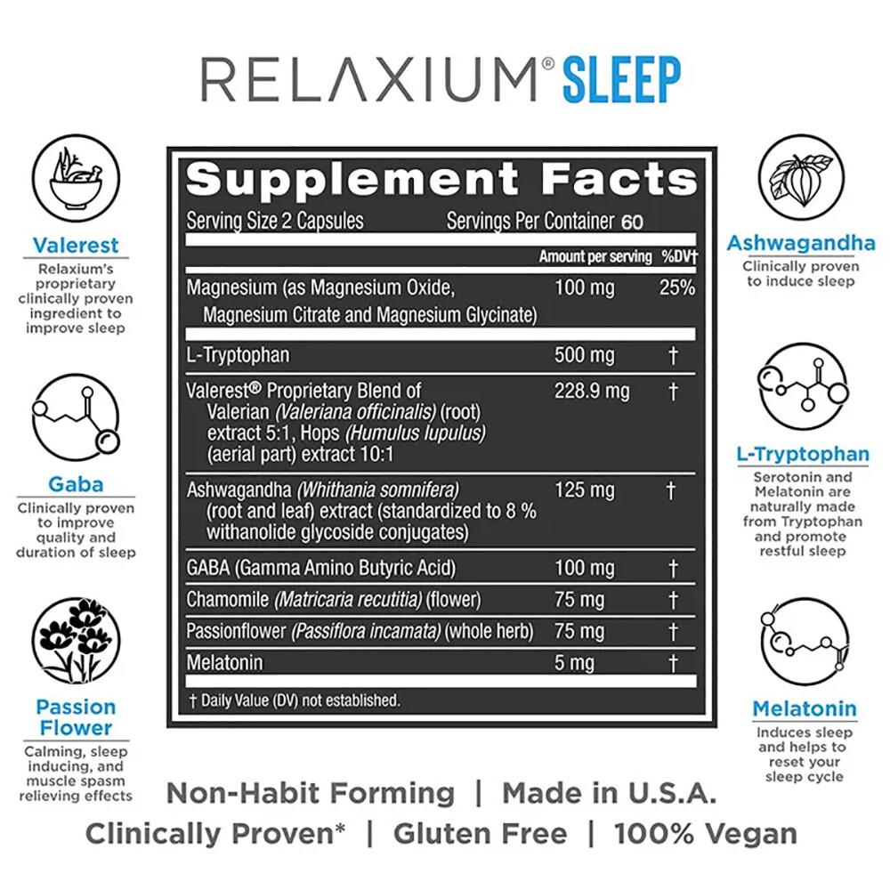 eBay 60 Capsules Relaxium Sleep -Helps Relax and Promote Natural Sleep, Sleep Best Main functions: Reduce stress/healthy sleep Description: FALL SLEEP, STAY SLEEP:Relaxiur's triple-action formula helps you wake up less gro9gy every morning by restoringyour natural sleep cycle, relaxing your body , and calming your mind; this sleep supplement has been researched andcrafted to not Habit-forming and easy to swallow; it's your worry-free answer to better sleep. This natural sleep aid contains magnesium, L-color A perfect synergistic blend of Anino Acid,GABAPassionflower and Chamomile.Helps you sleep safely. PROMOTES IMMUNE HEALTH AND BETTER SLEEP: Lack of sleep is known to suppress our body's natural immunefunction, better sleep helps support a stronger inmmune system; make Relaxium Sleep a part of your daily routine toensure deep, healthy sleep. Stay awake longer and wake up energized:Relaxium's triple-action formula is guaranteed to help you wake up everymnorning feeling refreshed , not stuffy, restoring your natural sleep cycle, relaxing your body and calming your mind. How to take: See accompanying bottle label recommendations Specifications: 60 Capsules Notice: Please read the portable label carefully. The production date is on the bottle cap or label. Document