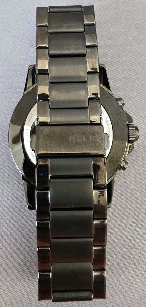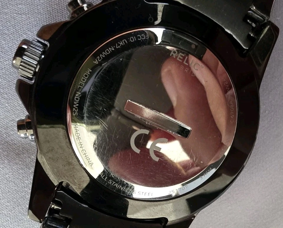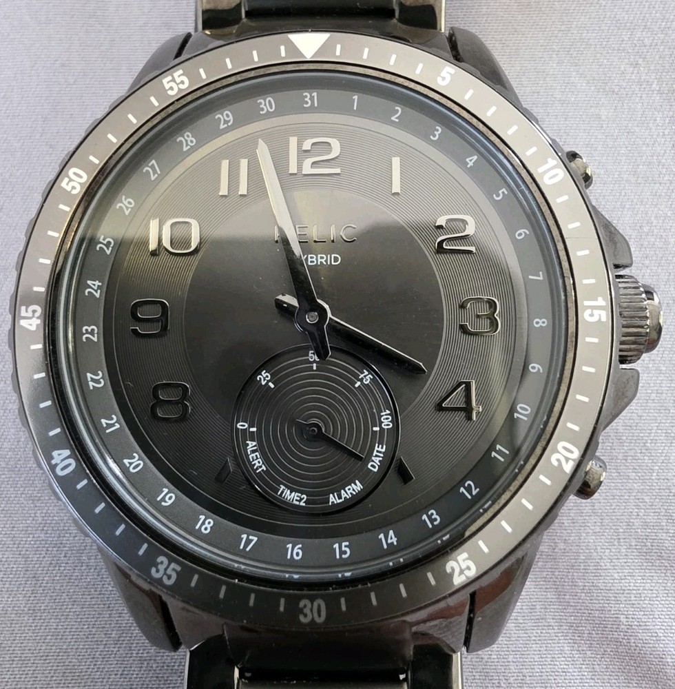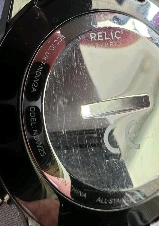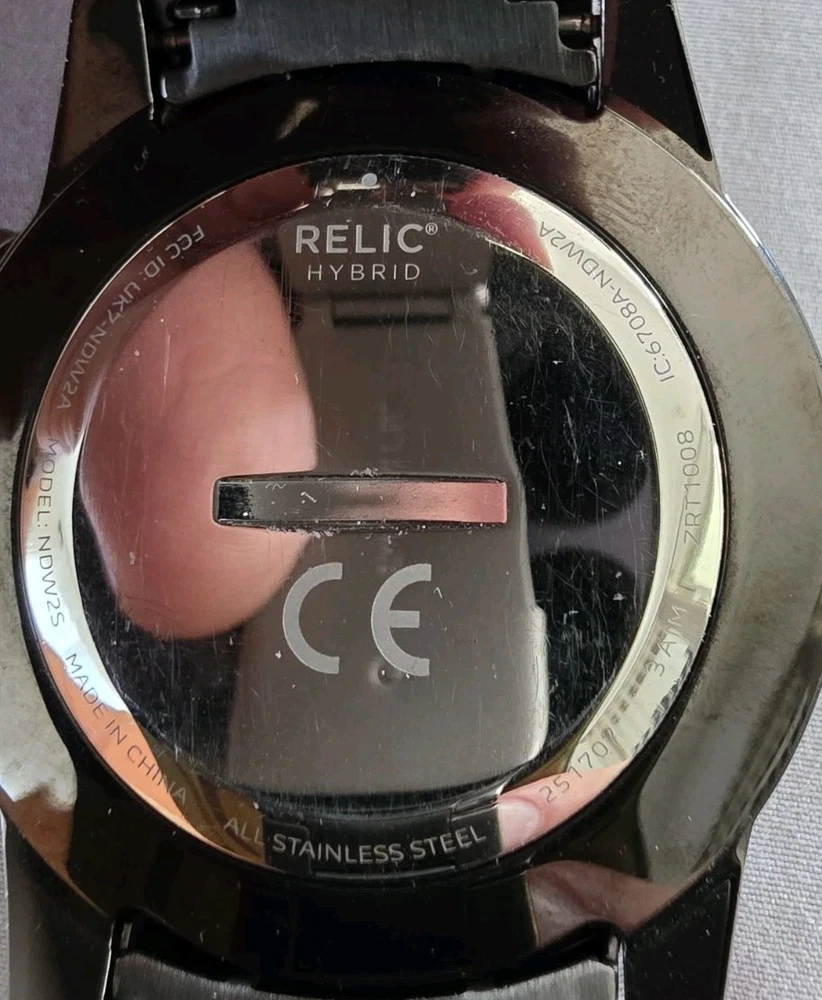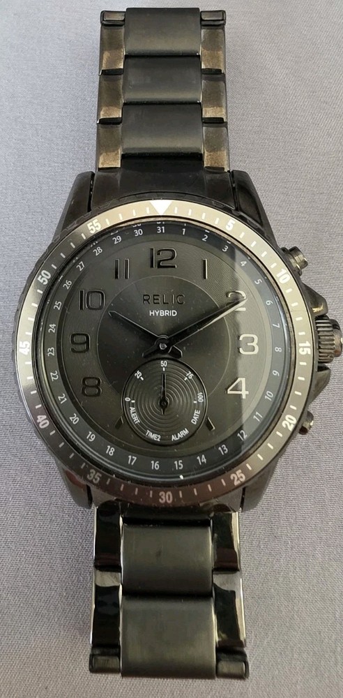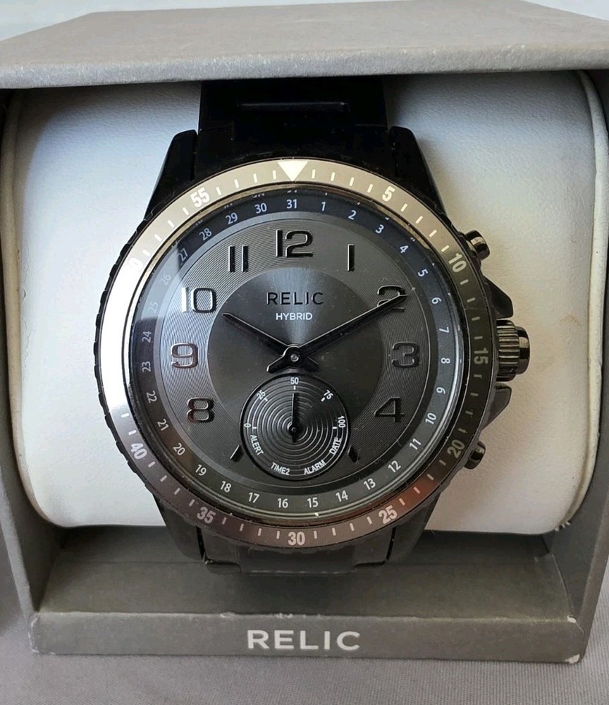 This watch is a Relic Hybrid Smartwatch by Fossil. These watches combine traditional analog style with smart functionality, connecting via Bluetooth to an app on your phone. Features Design: The watch maintains a classic analog appearance with physical hands but includes digital smart features managed through a connected app. Connectivity: It uses Bluetooth to sync with a smartphone application on both Android and iOS devices. Activity Tracking: The watch tracks activity data such as steps, calories burned, and distance, utilizing an accelerometer sensor. Notifications: Users receive discrete notifications for calls, texts, and apps directly on the watch. Other functions: The smart functions also include features like alarms, timers, and the ability to track sleep. Water Resistance: This model is water-resistant, typically rated for 3 or 5 ATM, making it suitable for everyday use like hand washing and rain exposure.