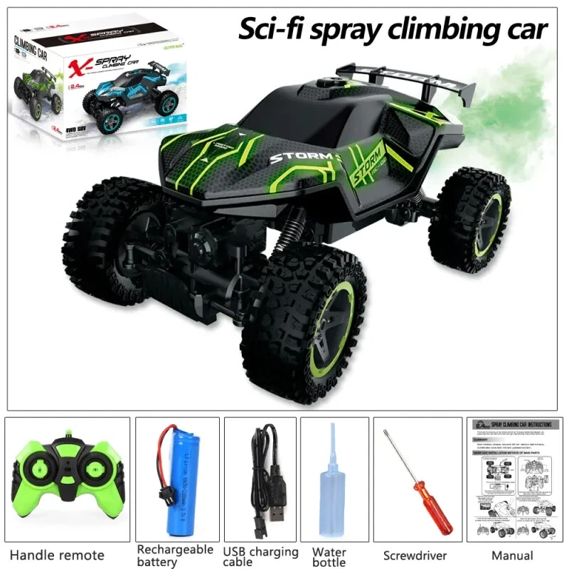 Remote Control Car 1:16 scale Kids RC Car All Terrain 4WD Off-Road RC Truck 2.4G free shipping!!! Product Description: This 1:16 scale wireless remote control car is designed for boys and offers hours of fun both indoors and outdoors. Featuring a cool style and bright colors , the car is perfect for various play environments, including smooth indoor surfaces and rugged outdoor terrain. The car is equipped with a 2.4GHz wireless control system , which ensures interference-free operation, similar to a gaming experience. It offers smooth, responsive control for forward, backward, left, and right movement , as well as exciting features like a one-button spray function and five light modes . The car’s design allows it to perform both horizontal rides and off-road mountain climbing , making it versatile for different types of play. Whether you're navigating flat surfaces or taking on rocky paths, this RC car delivers an exciting and dynamic experience, while the light spray function adds an extra layer of fun. Key Features: 1:16 Scale: Perfect size for both indoor and outdoor play. 2.4GHz Wireless Control: Provides interference-free, long-range control for smooth operation. Light Spray Feature: One-button spray function for added visual effects during play. Five Light Modes: Switch between different light settings for a customizable look. All-Terrain Capabilities: Suitable for both horizontal riding and off-road mountain climbing . Bright Colors & Cool Style: Eye-catching design that adds to the excitement of play. Durable Plastic Material: Built to withstand rough play, both indoors and outdoors. Specifications: Material: Plastic Size: 1:16 scale Control System: 2.4GHz wireless remote control Battery: Rechargeable lithium battery (included) Charging Method: USB cable (included) Functions: Forward, backward, left, right, spray function, and light modes Remote Control Range: Long-distance, interference-free signal Package Size: 285 190 175 mm Package Includes: 1 x Remote control car 1 x Remote control 1 x USB charging cable 1 x Lithium battery 1 x Screwdriver 1 x Manual 1 x Irrigation equipment (for spray function) Perfect For: Boys and Young Enthusiasts: Engaging and fun for kids who love RC cars and outdoor adventures. Indoor and Outdoor Play: Great for various environments, including smooth floors and rugged outdoor paths. Developing Hand-Eye Coordination: Helps improve motor skills while enjoying exciting gameplay. The 1:16 Wireless RC Car is perfect for off-road adventures, providing hours of entertainment with its light spray effects, all-terrain capabilities, and cool design