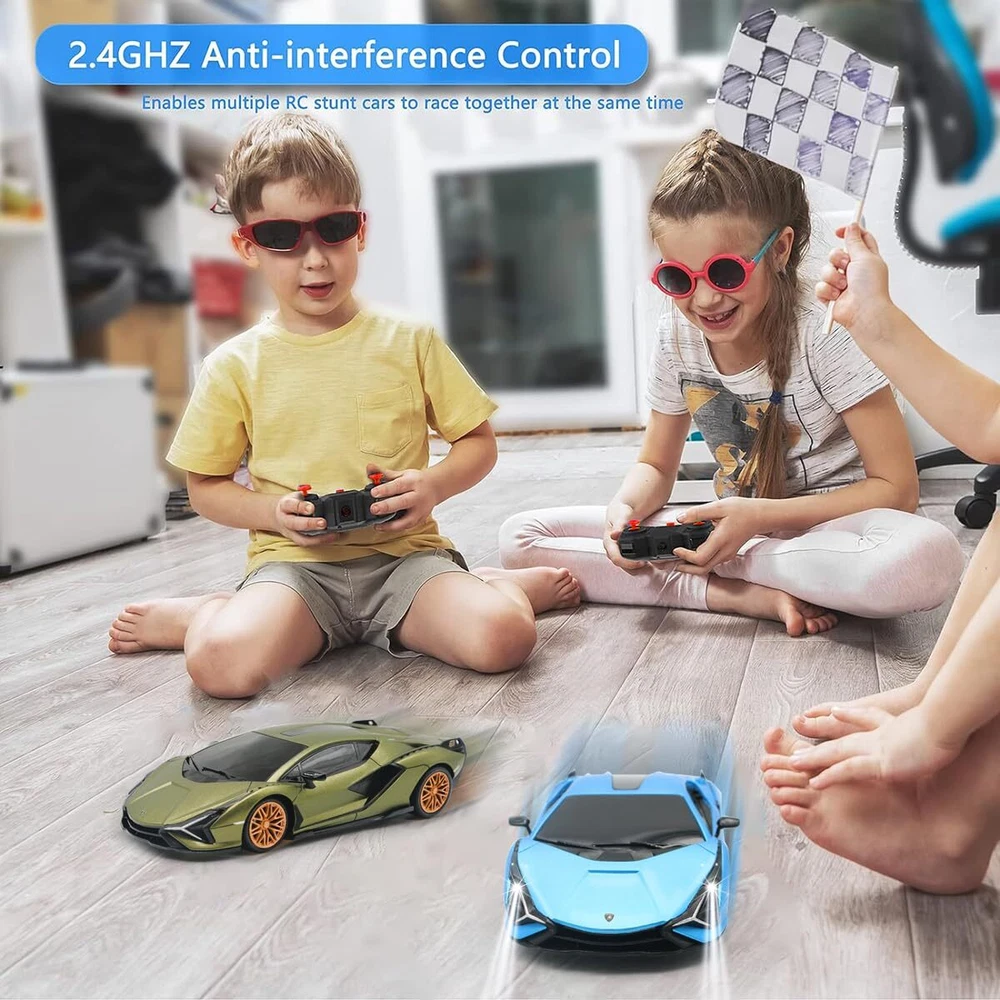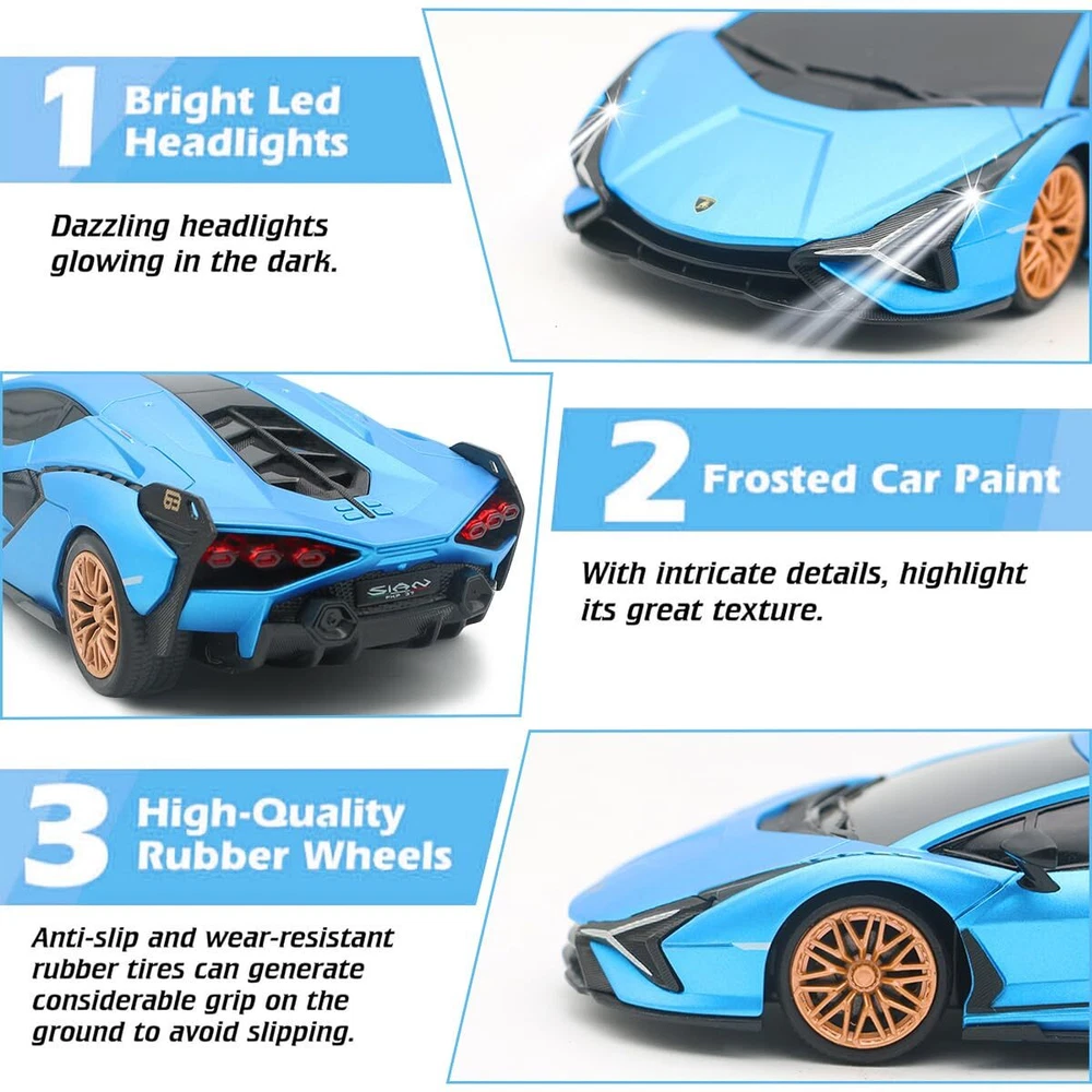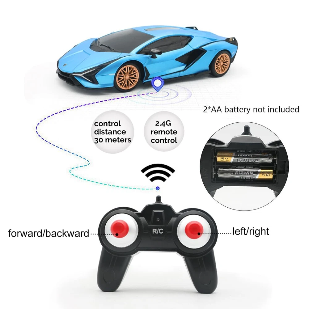 【OFFICIALLY LICENSED】Our remote control cars get officially licensed by, 1:24 true replica of sian. Small size, 8.1 inch long. A cool remote control car for 5,6 year old boy birthday gift. 【FULLY FUNCTIONAL RC CAR】 Boasting a sleek design and a remote controller with functions such as forward, reverse, left, and right turns. The user-friendly dual-grip remote control and a top speed of 4 miles per hour provide endless fun. 【2.4G REMOTE CONTROL CAR】The car built in 2.4G frequency. Two or more cars can run in the same time! Requires 3 * AA Batteries for the car and 2 * AA Batteries for the remote controller (NOT INCLUDED); Package includes 1 * 1/24 remote control car,1 * dual-grip remote-controller. 【High performance material】Our remote control cars has these super cool matte metal-like colors. 3 colors for you to choose. Non-toxic ABS material and odorless spray paint are used to protect the parts inside the car. 【IDEAL RC CAR FOR BOYS/KIDS/ADULTS】The Lamborghini Sian model works well on smooth surfaces, making it suitable for indoor and outdoor play. Not only play with it using the remote control, but also place it as a exhibit on display shelf as a model car. It's an ideal gift for birthdays, remote control car for boys 8-12,stocking fillers, or rewards.