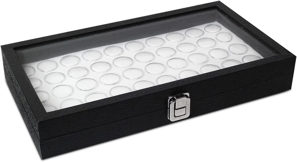 GLASS TOP JEWELRY DISPLAY CASE - Ideal for display your ring, earring, gems painting diamond, gem collection or any of your compact collection. ORGANIZER BOX FOR COLLECTION - Glass top display case with 50 pieces gem jar tray liner. JEWELRY DISPLAY TRAY BOX - Great for trade show or retail store, the case and the latch are sturdy and safe to keep your collection well. The glass top helps you keep your contents from dust and secure while storing them. MATERIAL & SIZE - Leatherette; Overall: 14 7/8"W x 8 1/2"D x 2''H ; The inside diameter of each gem jar measures approximately 30mm dia x 15mm H". Official MOOCA product. Accessories are NOT included. Product Details This display case is made of leatherette-wrapped case with a glass top. It contains 50 pieces of jar topped with white foam. The case is sturdy and the glass is not thin and flimsy, also keep your contents inside dust free and the latch on the lid keep your contents safe. Great for storing your ring, earring, jewelry, gem painting diamond, agates, cufflink, or any collections you want. The case is easily portable while traveling too. FEATURES -The case is made of leatherette-wrapped case with a glass top. -Comes with 50 pieces gem jar tray liner inside. -Box comes with metal clasps in the front to keep your contents safe. -Ideal for storing earring, ring, gemstone, minerals, diamond, cufflink, or any of your collection. -Easily take the inserts and containers out for storing your contents. Size Overall: 14 7/8"W x 8 1/2"D x 2''H"; The inside diameter of each gem jar measures approximately 30mm dia x 15mm H". Accessories are NOT included.