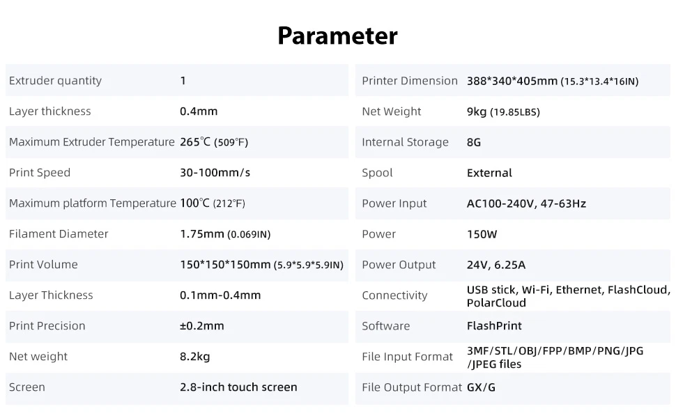 Flashforge Adventurer 3 Pro 3D Printer Out of the box : fully pre-assembled desktop 3d printer, unbox to print 3d models. 240°C & 265°C nozzle bundle : with a 240°C nozzle equipped and a 265°C nozzle included as spare parts. Detachable fast heating nozzle : remove the nozzle from the extruder via one push; Nozzle fast heated to 200°C (392°F) in 60 seconds. Carbon silicon crystal glass build plate : with better flatness than flexible build plate, glass build plate greatly minimal warping issues. Leveling free : build plate is well leveled in the factory. After package unboxing, simply follow touchscreen prompts to start 3d printing. Filament autoloading : enclosed spool holder, put filament end in, then trigger filament loading via the touchscreen for auto & smooth feeding. Filament run-out detection : print stops when the filament is running out; touchscreen prompts a notification to remind you of refills. Print resumes when the filament is refilled. 2.8-inch touchscreen : simplifies 3d print operation, get an intuitive knowledge of machine operation status and printing progress. Cloud printing : manage multiple 3d printers and storage 3d printable files on cloud platforms FlashCloud & PolarCloud. Save, share and download 3d files at any time. Flashprint slicing support : prepare your files for custom and accurate 3d printing. FREE! Remote monitor : built-in HD Camera allows you to remotely view the printing process online. Refurbished machines. No tools and filaments . You can take a look at our 500g spools filament Payment Shipping Returns About us Contact us Payment 1.We accept Paypal,Google Pay,CreditCard,Visa,MasterCard,etc. 2.Payment must be within 8 days after you ordered the item. 3.Make sure you select the correct Postal address when paying for this item. 4.We are not responsible for Import duties, taxes and charges. Shipping Shipping Day are Monday to Friday, excluding Saturday, Sunday and Holiday declared by the carrier. Your order will be ship out within 1-3 business days. Please ensure your shipping address is correct before ordering. We are not responsible for undeliverable address. We reserve the right to charge the shipping fee again for returned items due to wrong address. Returns 1.We offer 30 days return policy. Please contact us within 30 days from the date you receive your order if you have any issues with the product and would like to return. 2.All returned items MUST BE in the original packaging and you MUST PROVIDE us with the shipping tracking number, specific reason for the return, and your eBay ID. 3.We will refund YOUR FULL WINNING BID AMOUNT, upon receipt of the item in its original condition and packaging with all components and accessories included, AFTER BOTH Buyer and Seller cancel the transaction from eBay. OR, you may choose to have a replacement 4.Buyer is responsible for return shipping cost. About us Established in 2011, FLASHFORGE is one of the first professional 3D printing equipment and materials R&D and manufacturing enterprises in China. At present it is the domestic first, ranking third in consumer-level 3D printing brand manufacturers globally. (Data source 3D Hubs). And, Flashforge was awarded the title of "Famous brand in Zhejiang Province" in 2017. As an R&D and manufacturing enterprise providing products and solutions for the whole industrial chain, Flashforge presently owns 10 product categories, extending from 3D printers, 3D printing filament, and 3D designing software to 3D printing services, providing dozens of types of products, covering the complete industrial chain. Products are divided into three levels: industry level, commercial level, and civil level, meeting the needs of different types of users. Meanwhile, Flashforge is at the industry-leading level in technology R&D, channel construction, after-sales service, and other aspects. Contact us All eBay messages will be replied within 24 hours or sooner during working days. Your satisfaction is our priority. If you have any questions about the products, please feel no hesitation to contact us, we will try our best to solve them. Looking forward to your messages!