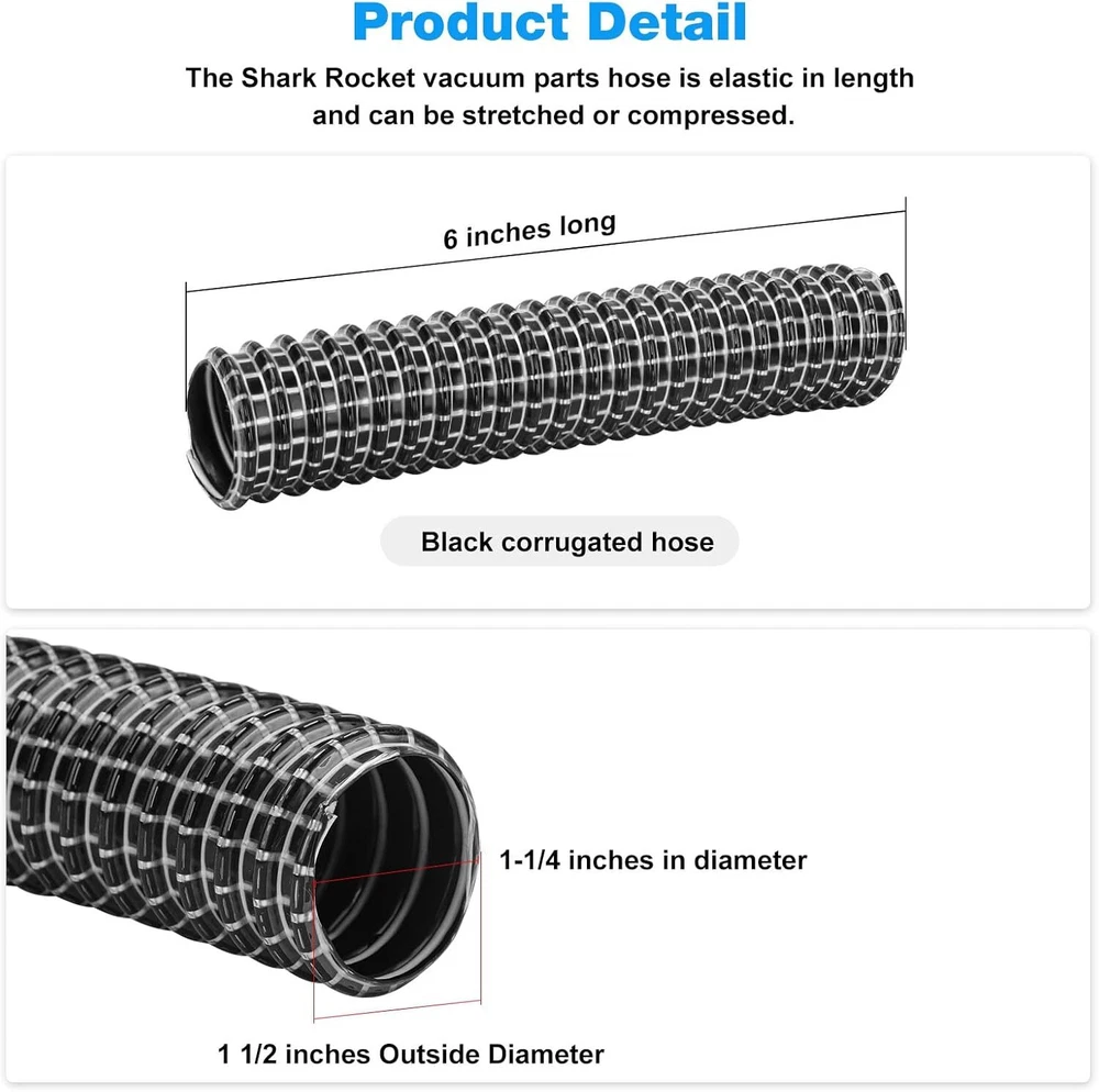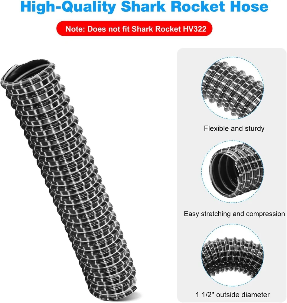 【Flexible Hose for Shark Rocket】Replacement Shark Rocket lower nozzle hose is fully compatible with the Shark Rocket DeluxePro ultralight vacuum cleaner models HV300, HV301, HV302, HV320, and HV321 series. Note: Does not fit Shark Rocket HV322. 【Vacuum Hose Replacement for Shark】The Shark Rocket vacuum parts hose is elastic in length and can be stretched or compressed. The Shark vacuum hose sizes are 1 1/2" outside diameter (1 1/4" inside diameter) x 6" length, suitable for Shark Power nozzle lower suction hose or lower duct hose. 【High-Quality】Our lower duct hoses are made of high-quality materials, soft and freely bendable, flexible, durable, washable and reusable to ensure long service life. 【Easy Installation】Simply remove the old Shark Rocket vacuum parts hose, replace the new lower nozzle hose, clean the inside of the hose regularly, and can effectively absorb dust and purify the air, bringing you a healthier life. 【Tips】It is recommended to replace the Shark Rocket hose for 6 to 12 months, which helps to maintain the suction and service life of the vacuum cleaner. Product Description Shark Rocket Lower Nozzle Hose Compatible with the Shark Rocket DeluxePro ultralight vacuum cleaner models HV300, HV301, HV302, HV320, and HV321 series. For Shark Power nozzle lower suction hose or lower duct hose. Note: Does not fit Shark Rocket HV322. . Replace the new lower nozzle hose,can effectively absorb dust and purify the air, bringing you a healthier life. The Shark Rocket vacuum parts hose is elastic in length and can be stretched or compressed. Tips: It is recommended to replace the Shark Rocket hose for 6 to 12 months, which helps to maintain the suction and service life of the vacuum cleaner. .