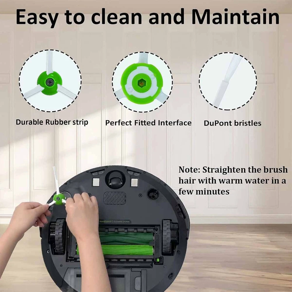 Product Details: Compatible with iRobot Roomba i7 i7+/i7 Plus E5 E6 E7 Vacuum Cleaner Side Brush & Hepa Filters & Bristle Brush. High Performance: Brushes can capture a variety of debris, easy to remove dirt, dust and hair. Ideal for homes with pets. Filter can maintain vacuum 's cleaning performance while reducing infiltration of dust. Features: - Easy to install and disassemble, because our replacement parts are well compatible with your vacuum robot, the installation method is the same as the original, you can easily install and use - Maintenance time, according to your use frequency, replace the consumable supplement kit every 2-3 months, so that your robot can maintain the best performance Package Includes: 1 x Set Rubber Brush 4 x Side Brush 3 x Filters 4 x Screws On Sep 29, 2024 at 19:09:52 PDT, seller added the following information: