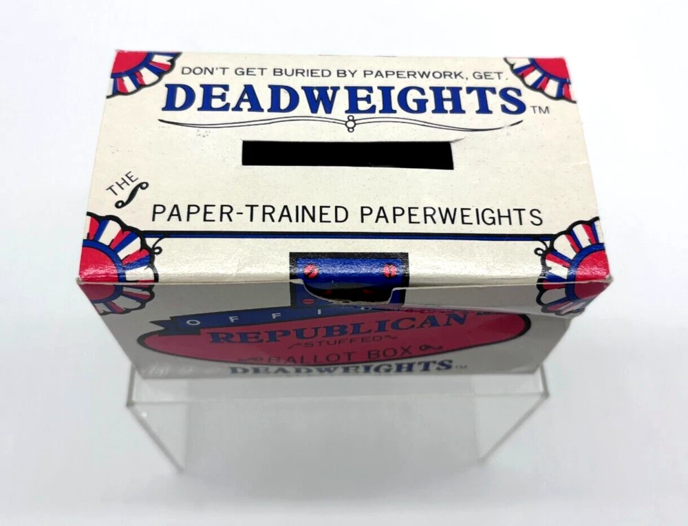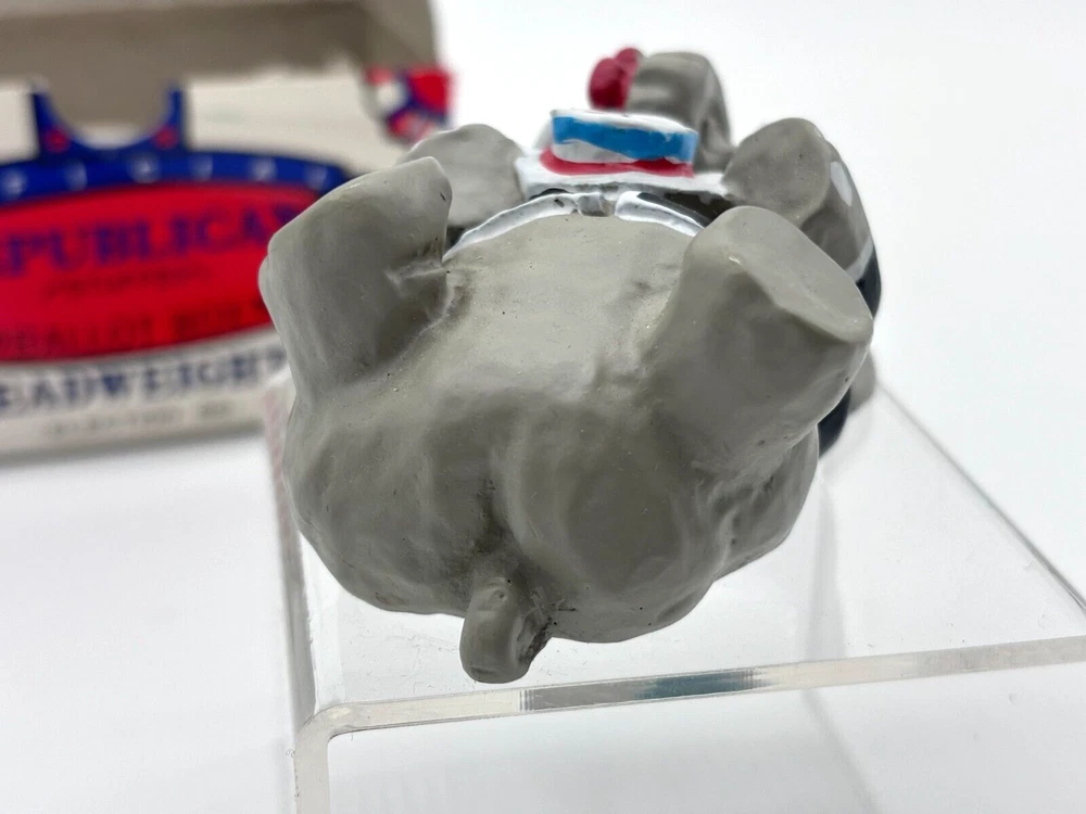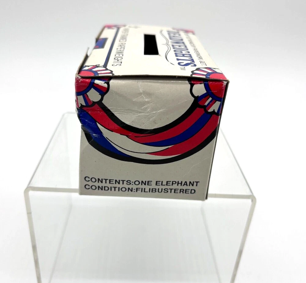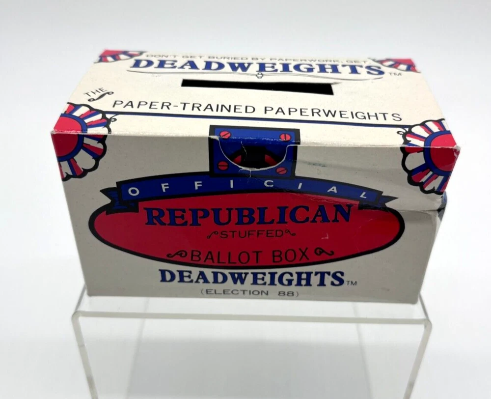 Vintage, Good to Better: Republican Stuffed Ballot Box Deadweights PAPERWEIGHT - 1988 Election Elephant Ships Within 24 Hours. Will Combine Shipping! Vintage. Good to better. You'll Get : as pictured: Republican Stuffed Ballot Box Deadweights PAPERWEIGHT - 1988 Election Elephant Deadweights. Republican gag-gift for your Democratic Liberal friends. Estate sale find. Comes with: original, paper box and cushioned on shredded paper for added effect, with politically triggered wording throughout. Collectible Paperweight: hard to find these days, originally created in 1988. Shipping: Put to a heat-sealed polybag, wrapped repeatedly in bubble-wrap and ships in a sturdy box, reinforced. With an Ebay store full of a variety of items, cooler items coming. Pulling out some of my most treasured finds over the years. Follow, and stay tuned, or miss out! Listing daily... *I don't ever use 'stock' photos in any of my listings -- so you can be confident in your decision to purchase!* Multiple shipping options to choose from. *And combined shipping available! All items are professionally packaged, and handled with loving care. Questions? ASK before your purchase. I'm responsive and will answer your questions. Have an exceptional day, and thank you for your business! :) P.S. I personally package all items. Rest assured, any item shipped (domestic or international), at minimum is heat-sealed in at least one bag, repeatedly wrapped, or shrink-wrapped to remain protected by the elements while in transit, no matter the destination, or how you choose to have it shipped. Shipped right!