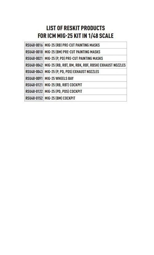 Scale: 1:48 Manufacturer: RESKIT Country/Region of Manufacture: Ukraine High-quality details. Paint: Unpainted, Unassembled, Kit do not contain paints and glue. Condition: New in Box Features: Kit Resin wheel bay set Type of product: Wheel bays Recommended kits: Icm Suitable for models: MIG-25, МИГ-25, MIG25, МИГ25, MIG 25, МИГ 25, FOXBAT Quality set, simple assembly. Suitable for experienced modelers, as well as for beginners. Due to the use of modern production technologies, all the details of the model fit perfectly, thanks to this, you can get an excellent result with minimal effort. ----------- This is a plastic model kit. Assembly and painting is required. Paint and glue is NOT included. Item Type: Scale model kit Commodity Attribute: Assembly The model is a plastic assembly model and needs to be assembled and painted by yourself You need an extra purchase of the glue, paint and so on!