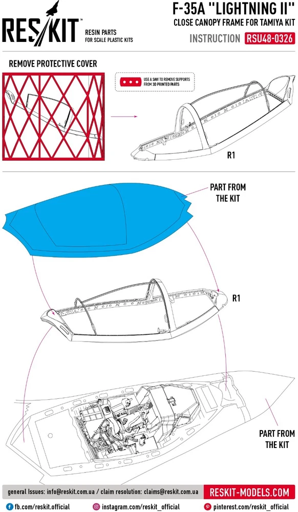 ResKit RSU48-0326 Scale 1:48 F-35A "Lightning II" close canopy frame for Tamiya kit (3D Printing) - for Plastic Model Kit ---------------------------- If you have a desire to procure a GREATER NUMBER OF ITEMS THAN WHAT IS CURRENTLY DISPLAYED, kindly let us know, and we will happily modify our offerings to suit YOUR EXACT QUANTITY NEEDS. ---------------------------- Scale: 1/48 Manufacturer: RESKIT (Accessories for Scale Plastic Kits) Country/Region of Manufacture : Ukraine Features: Kit Condition : New in Box Type of equipment : Aircraft Type of product: EJECTION SEATS Recommended kit: Tamiya F-35A "Lightning II" ---------------------------- Reskit: The Ultimate Upgrade for Your Scale Models Reskit is the leading provider of upgrade sets for scale models, offering a wide range of products to enhance the realism and detail of your models. Our sets include everything from engines and interiors to exterior accessories and weapons. Whether you're a beginner or a seasoned modeler, Reskit has the upgrade sets you need to take your models to the next level. Here are just a few of the benefits of using Reskit upgrade sets: Increased realism and detail: Our sets are made with high-quality materials and components that will add a touch of authenticity to your models. Improved performance: Our sets can help improve the performance of your models, making them more realistic and engaging. Reskit upgrade sets are the perfect way to add realism, detail, and performance to your scale models. With our wide range of products, you can find the perfect upgrade set to transform your models into showpieces.