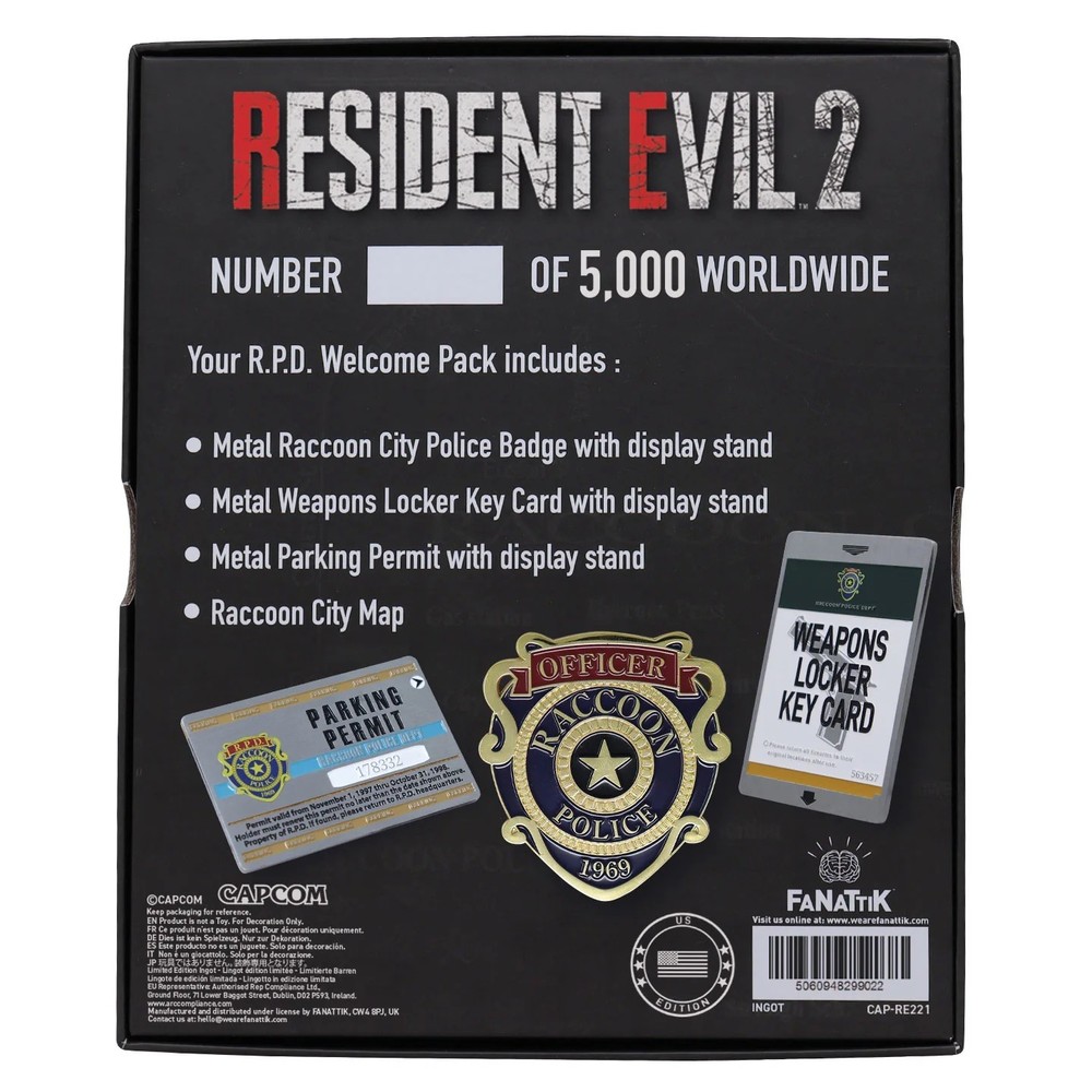 Resident Evil 2 - RPD Welcome Pack (US Variants) PRE ORDER. Expected ship time early May. Welcome recruit! Step into the boots of an R.P.D. officer with this officially licensed Resident Evil 2 Replica R.P.D. Welcome Pack. Inspired by the iconic items found throughout Raccoon City, this limited-edition set equips you with the essentials you’d expect on your first day at the precinct… before everything went horribly wrong. Each of the items included in your pack are made from metal with an antique nickel & imitation gold plating apart from the map which made from paper. Officially licensed Limited to 5,000 Individually numbered to box Keycard: 90 × 57 mm Parking Permit: 90 × 60 mm Badge: 65 × 60 mm Map: 200 × 144.2 mm Box size: 180 × 150 × 25 mm Special US edition