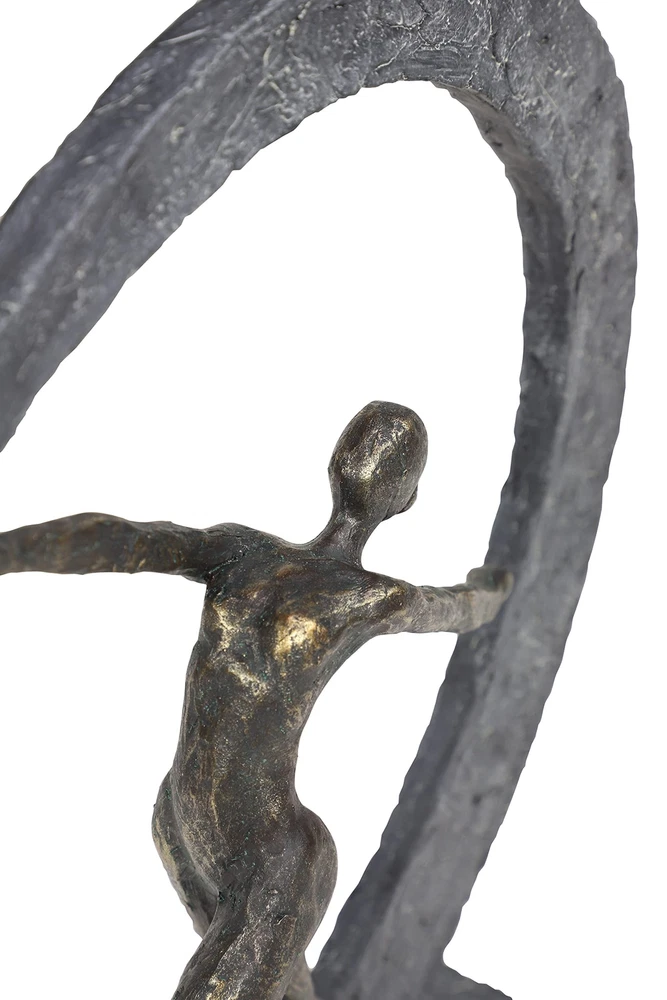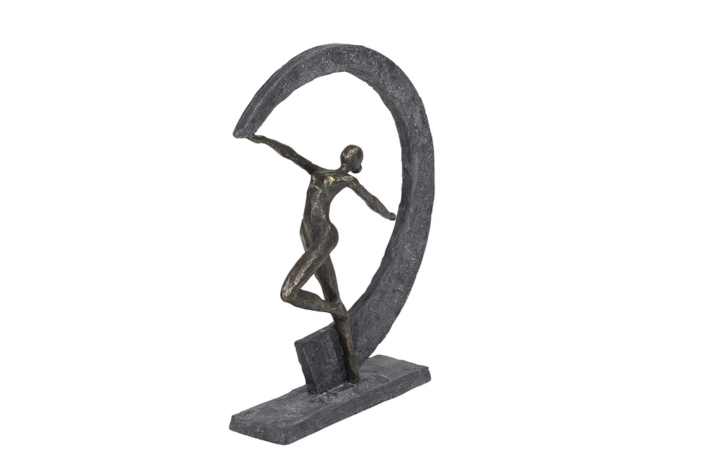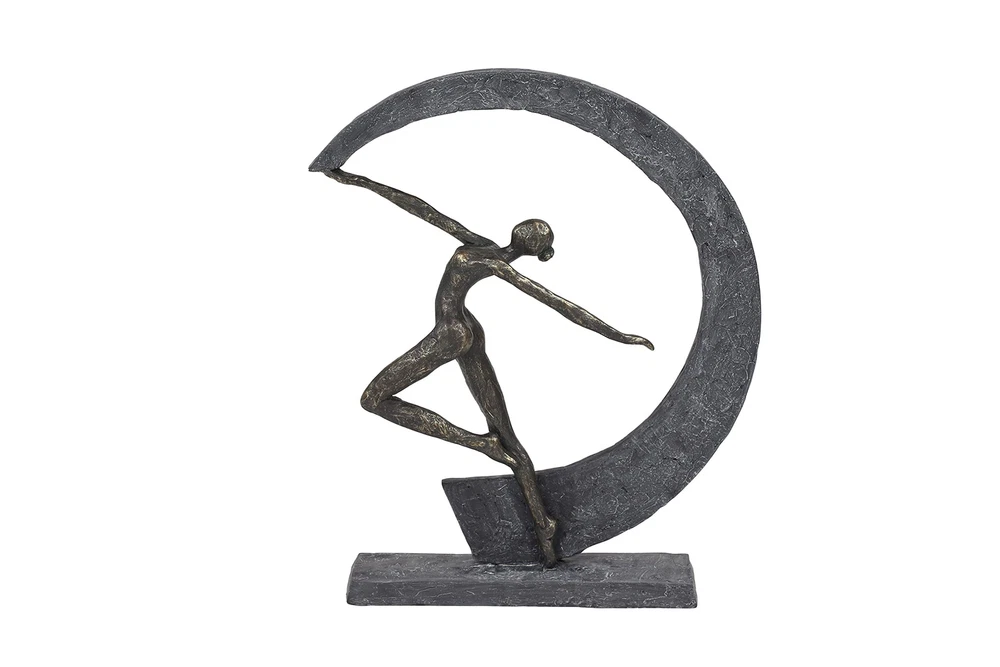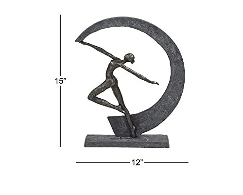 Lightweight, textural, dark gray and gold resin is sculpted into a female figurine dancing with arms outstretched within a crescent moon shape. The ballerina-like figurine has a metallic gold finish, while the crescent shape and base both have a very textural gray hue that looks like stone. Use this as centerpiece in your living room set up to release some modern dance vibes. Wipe clean with a dry cloth. Suitable for indoor use only. Modern design. This item comes shipped in carton. MODERN THEME: Features a modern style inspired by a minimalistic design with clean lines and angular structures MADE WITH RESIN: This awesome sculpture is made from polystone resin materials GRAY MATTE FINISH: Figure is painted dark gray with a metallic gold finish, and distressed stone-like gray hue and texture FEATURES ROUND SCULPTURE: Features a graceful dancer forming a moon-shaped figure from the movement of her hand CONVENIENTLY SIZED: This resin shelf decor statue measures 12”L x 3”W x 15”H and weighs 3 lbs ; base measures 10” x 3” x .5”