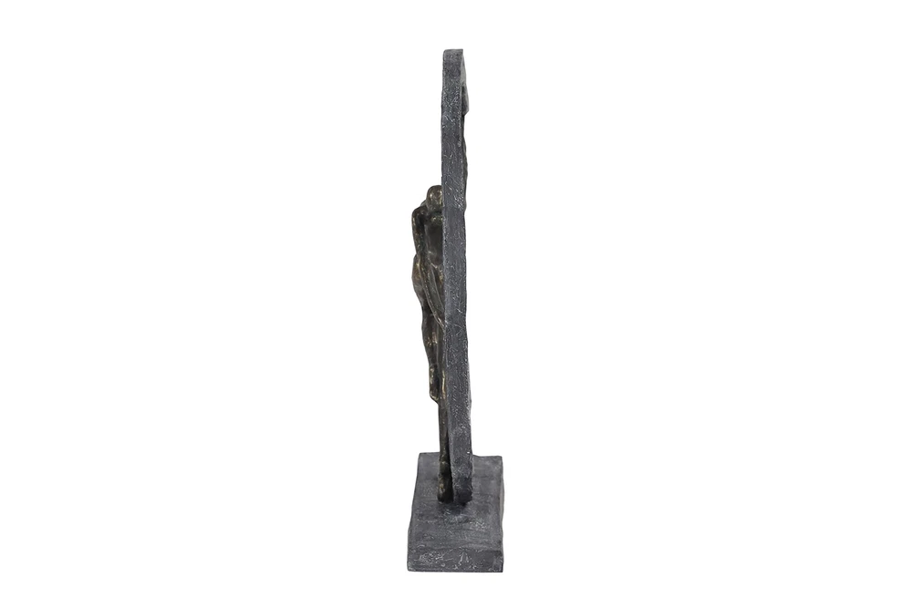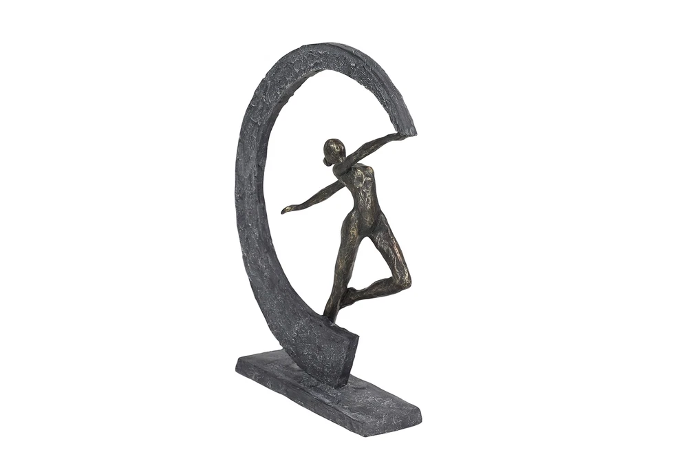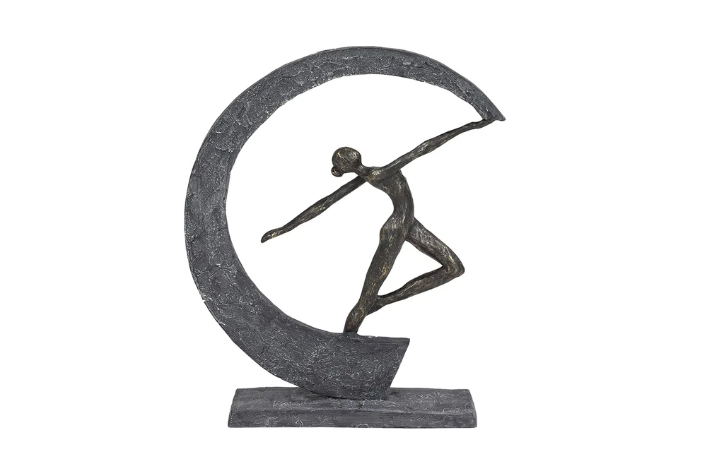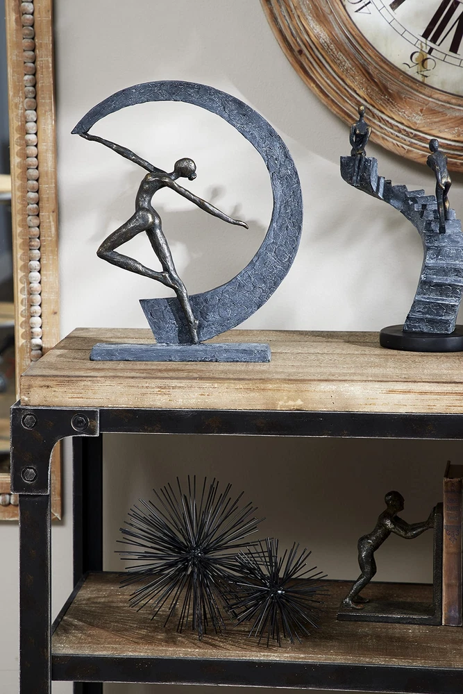 Lightweight, textural, dark gray and gold resin is sculpted into a female figurine dancing with arms outstretched within a crescent moon shape. The ballerina-like figurine has a metallic gold finish, while the crescent shape and base both have a very textural gray hue that looks like stone. Use this as centerpiece in your living room set up to release some modern dance vibes. Wipe clean with a dry cloth. Suitable for indoor use only. Modern design. This item comes shipped in carton. MODERN THEME: Features a modern style inspired by a minimalistic design with clean lines and angular structures MADE WITH RESIN: This awesome sculpture is made from polystone resin materials GRAY MATTE FINISH: Figure is painted dark gray with a metallic gold finish, and distressed stone-like gray hue and texture FEATURES ROUND SCULPTURE: Features a graceful dancer forming a moon-shaped figure from the movement of her hand CONVENIENTLY SIZED: This resin shelf decor statue measures 12”L x 3”W x 15”H and weighs 3 lbs ; base measures 10” x 3” x .5”