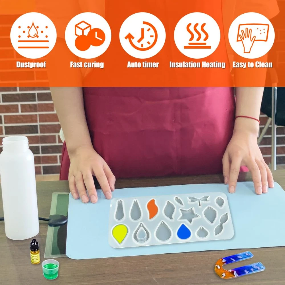 1. Epoxy Resin Molds Kit - Resin heating mat with timer*1, Silicone pad*2, Resin mold*1, Insulation cover*1. 2.Quickly Mold - Compared with traditional resin machine and resin heating pad, our resin heating mat shortens the time of resin demold greatly, saves time and money. NOTICE: Suggest heating resin for a longer time when being in cold situation. Winter and low temperature would make resin slower. 3.Timer Function - The timer can provide you with 2H, 4H, 12H timer function, just press the button to switch, and it will automatically power off at scheduled time. 4.Silicone Mat - Put the silicone mat on heating pad can cast resin directly, and can prevent the resin dripping on the heating mat 5.Instant Heating - Adjust the temperature to the maximum, only need to power on 1-2 minutes to feel the temperature of the resin heating pad. Epoxy Resin Molds Kit - Resin heating mat with timer*1, Silicone pad*2, Resin mold*1, Insulation cover*1. Quickly Mold - Compared with traditional resin machine and resin heating pad, our resin heating mat shortens the time of resin demold greatly, saves time and money. NOTICE: Suggest heating resin for a longer time when being in cold situation. Winter and low temperature would make resin slower. Timer Function - The timer can provide you with 2H, 4H, 12H timer function, just press the button to switch, and it will automatically power off at scheduled time. Silicone Mat - Put the silicone mat on heating pad can cast resin directly, and can prevent the resin dripping on the heating mat 5.Instant Heating - Adjust the temperature to the maximum, only need to power on 1-2 minutes to feel the temperature of the resin heating pad.