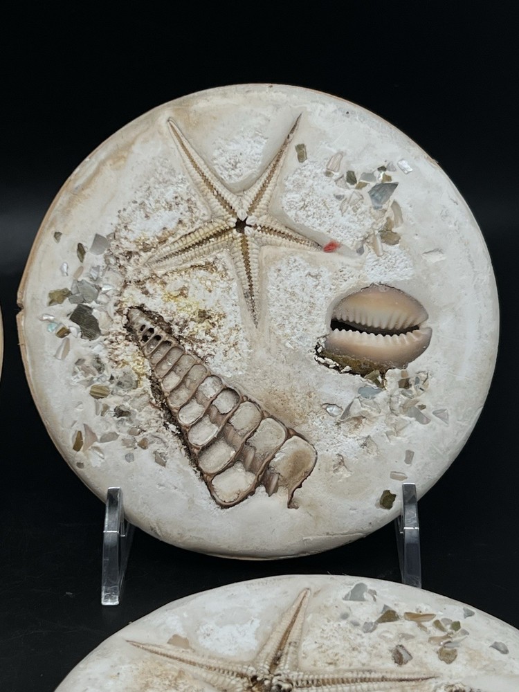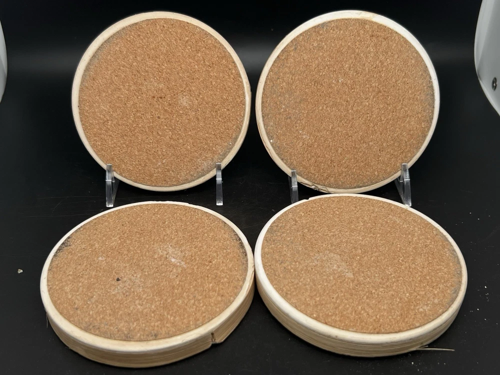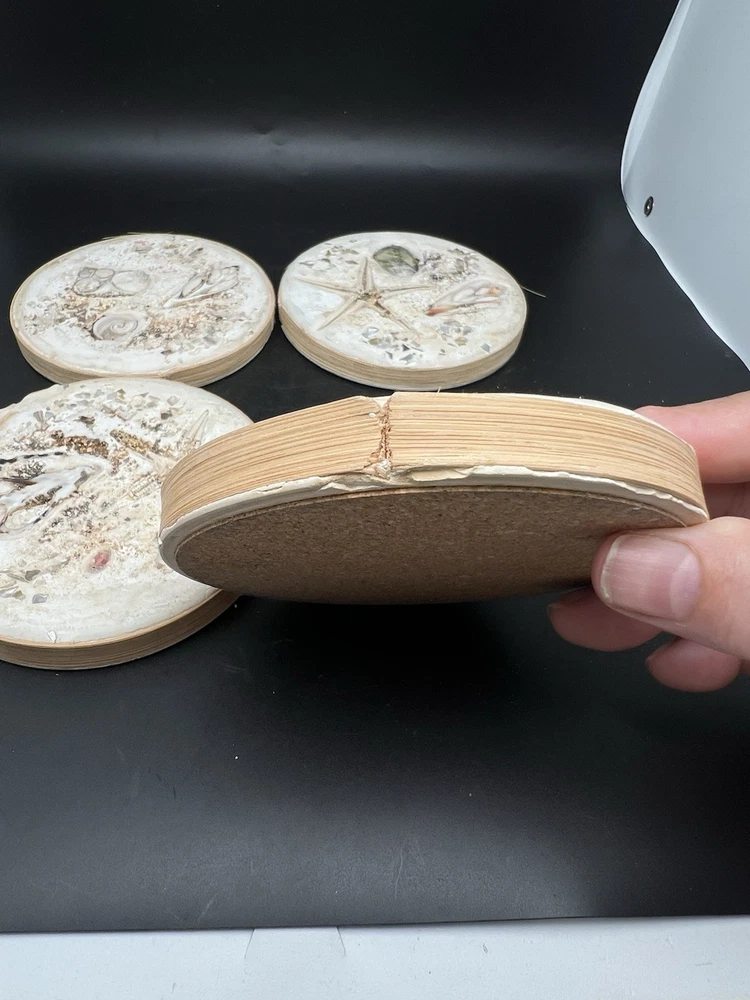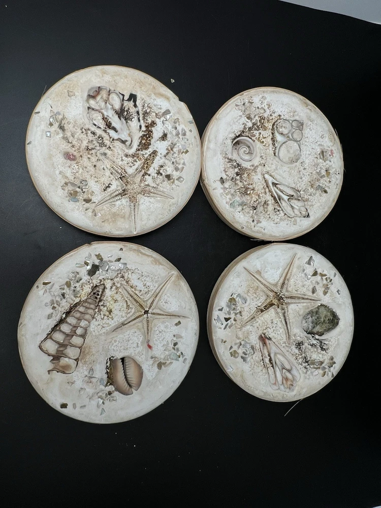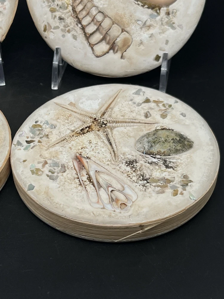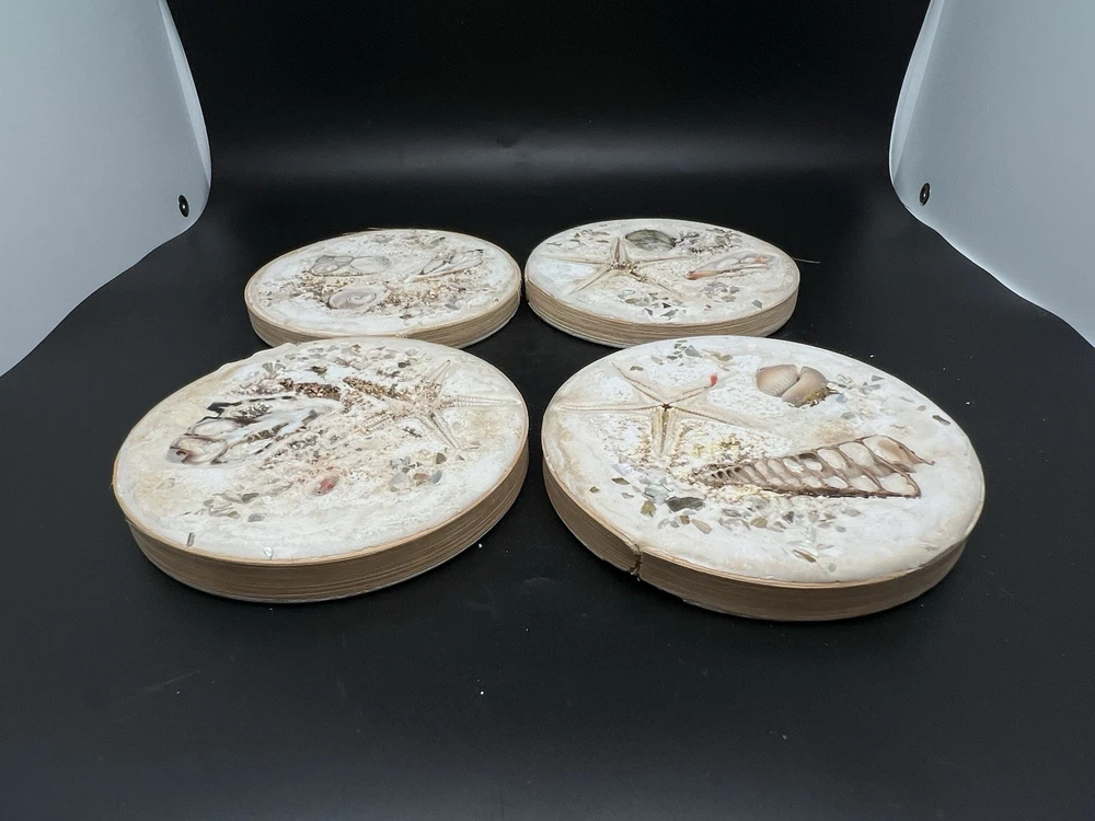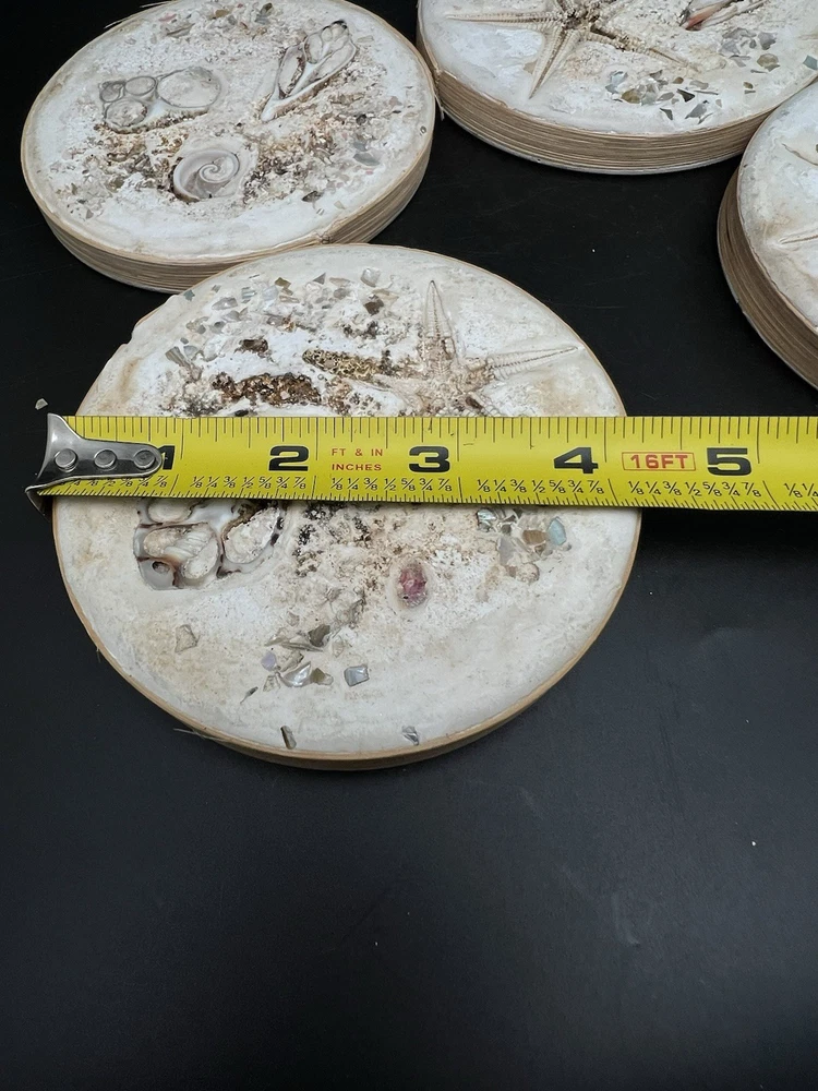 Pattern: All-Over Shape: Round Type: Coaster Set Country/Region of Manufacture: Unknown Occasion: All Occasions Theme: Beach Features: Stackable, Lightweight, Hand Wash Only Personalize: No Item Diameter: 4.25” Brand: Unbranded Color: Beige UPC: Does not apply Style: Nautical Material: Bamboo, Resin, Seashells Number of Items in Set: 4 gtin13: Does not apply