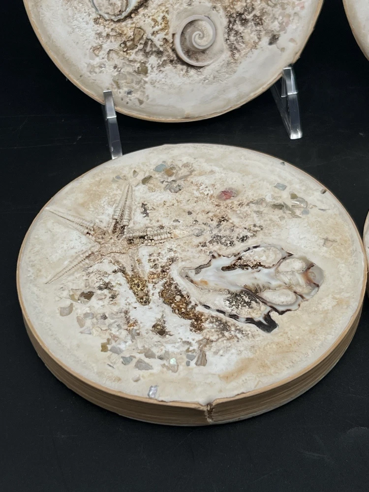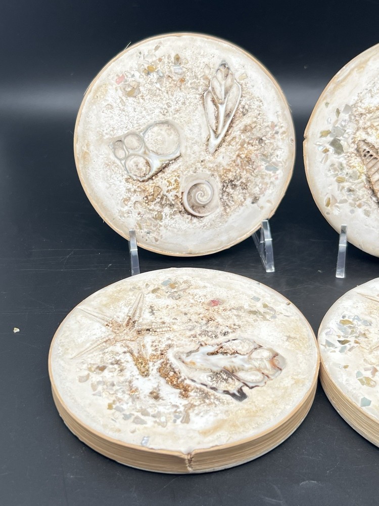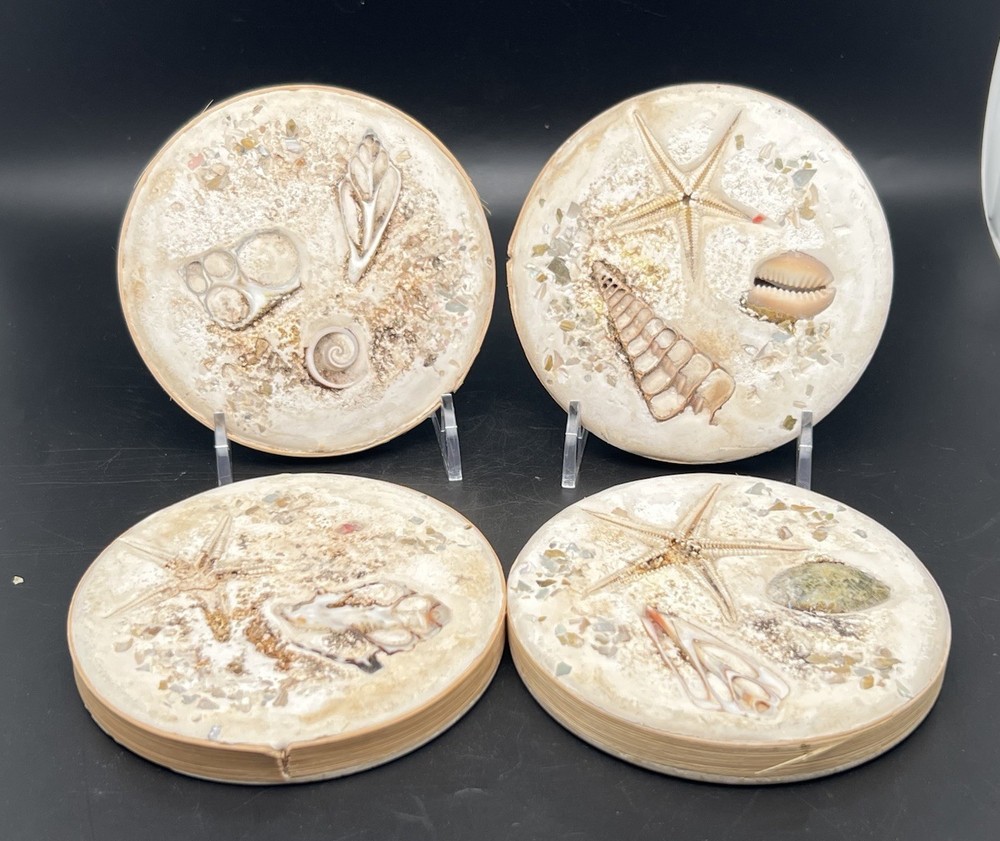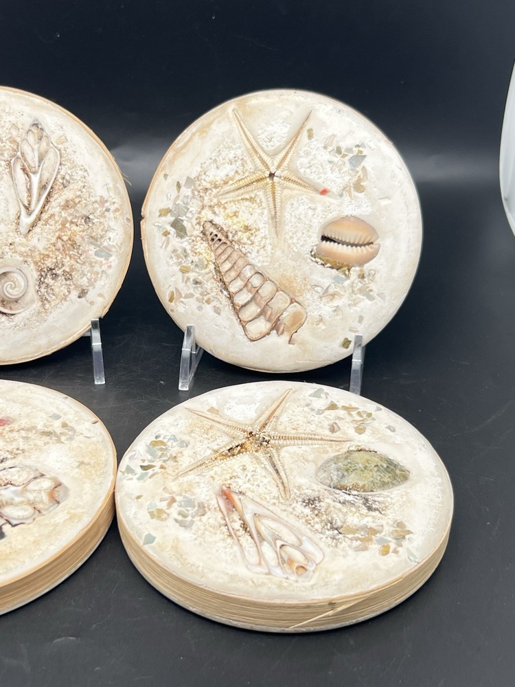 Resin-Coated Seashell Coasters Set of 4 with Starfish and Bamboo Trim