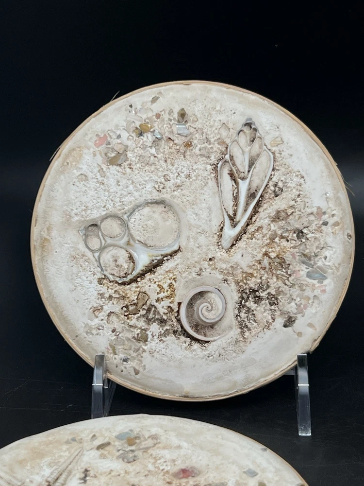 In good condition. I believe these pretty seashells are set in resin, as they are very lightweight. And I believe it’s bamboo around each coaster. Super pretty! We pack safely and ship quickly. Please let me know if you have any questions and thank you for shopping with me!🌼