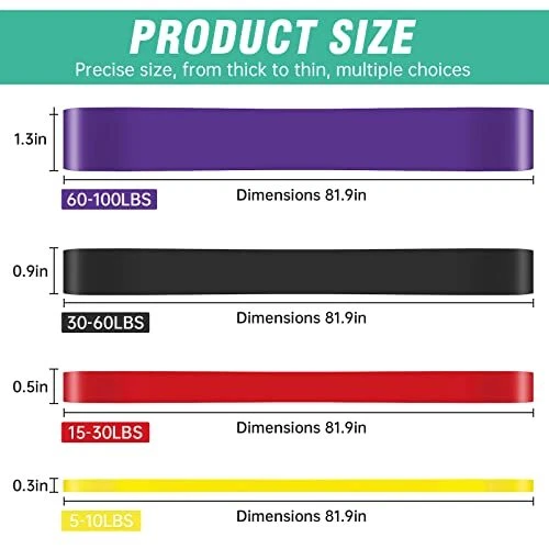 Pull up Bands High Quality Material: Resistance bands made from 100% high-grade natural rubber to prevents bands snapping and provide longer durability. Different Color & 4 Pull Up bands levels: Set of 4 pcs Pull up assist bands correspond to different colors, Yellow(5-10 lbs), Red(15-30 lbs), Black(30-60 lbs), Purple (60-100 lbs), 81 inches in length and can be used alone or combine multiple workout bands to increase the challenge. Suitable for Variety of Exercise & Multifunctional: Resistance bands offers effective training, suitable for a variety of exercise to Calorie Burning, Muscle Building and Fat Shredding Workout Program to work out your arms, shoulders, chest, gluteus, legs etc. Lightweight and portable: The resistant bands set is portable and come with a waterproof bag for you to carry it anywhere, so you can use this resistance bands set to exercise, be it to your home, gym or even as you travel therefor you can continue with your work-out routine anywhere you go. Great idea for a gift-It can meet your workout need for anyone looking to expand a home gym, build a fitness regimen, exercise on the go, or physical therapy whether you are a beginner or not.