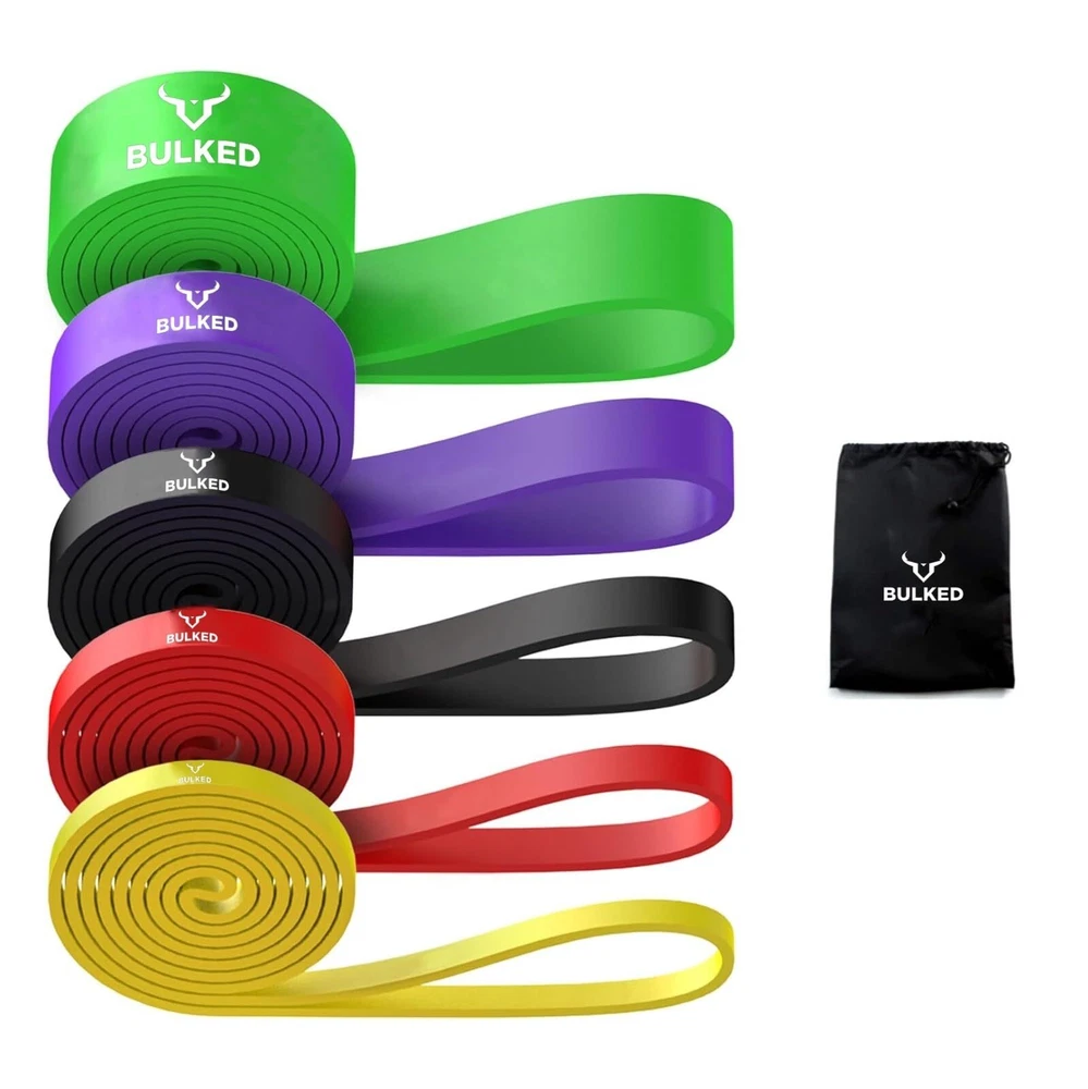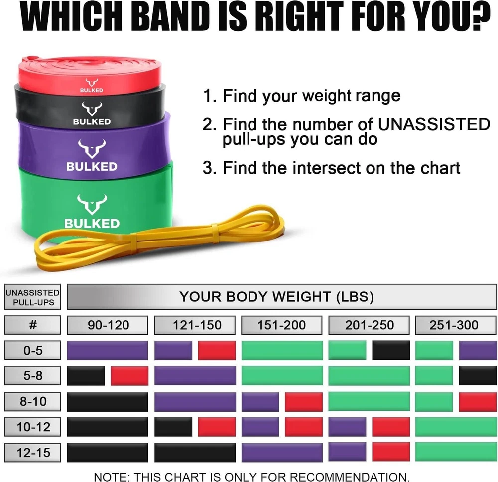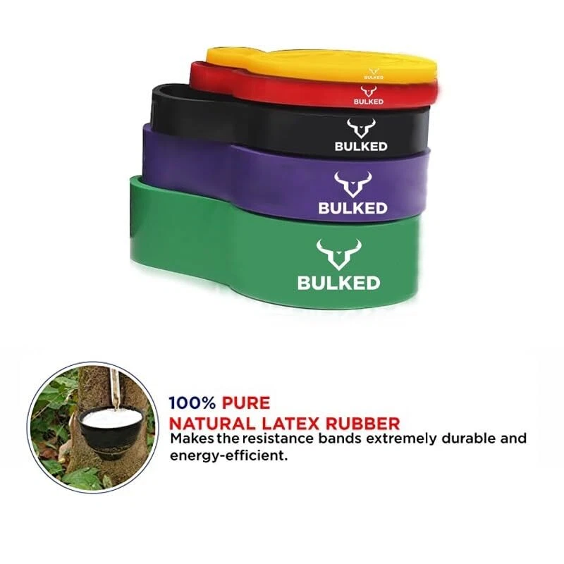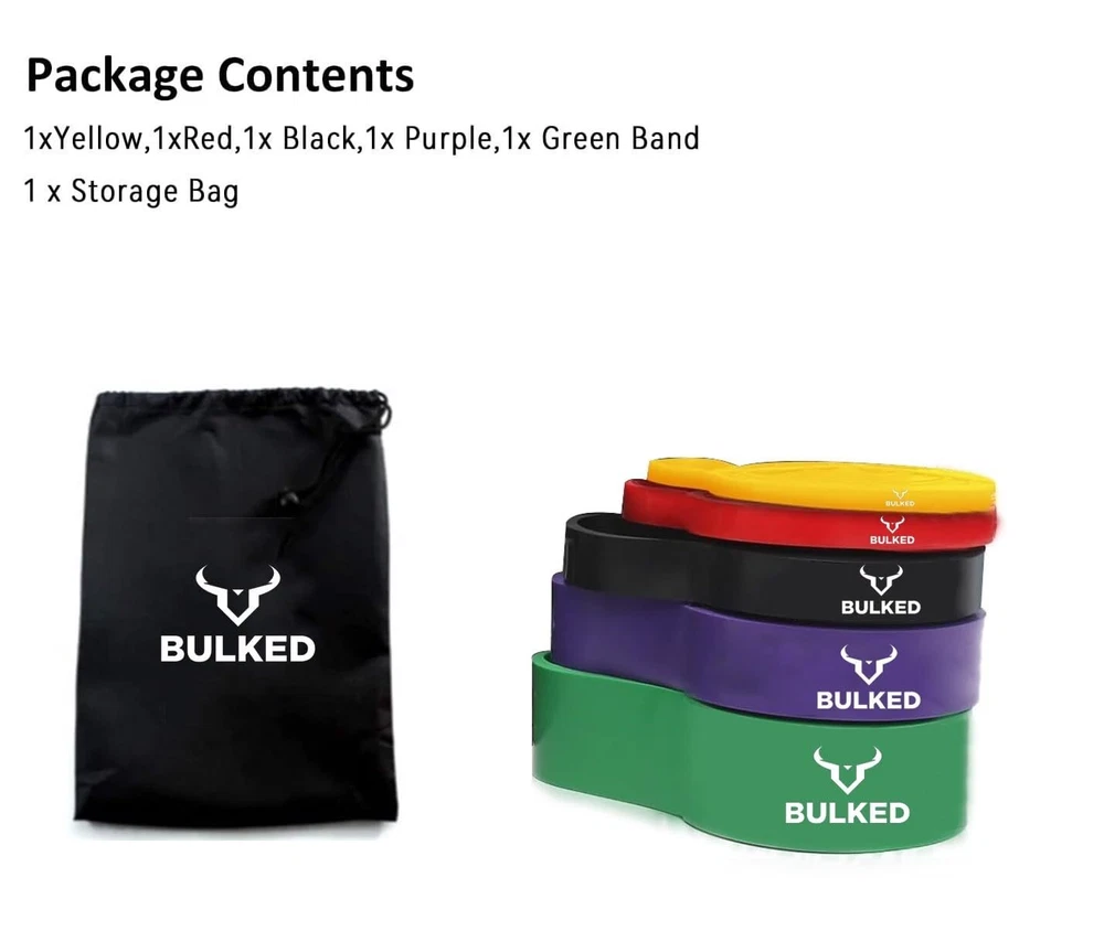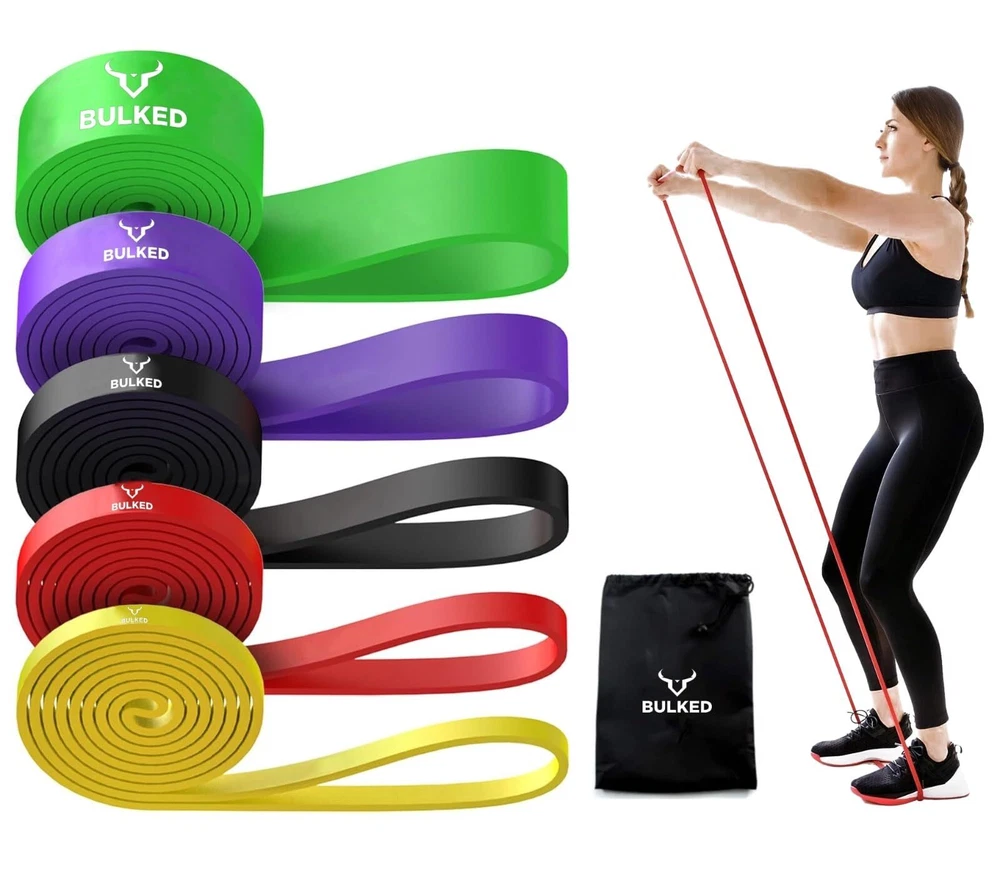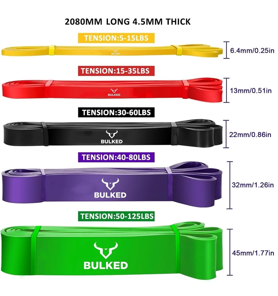 Resistance Band Set, Pull Up Assist Bands - Stretch Resistance Band Exercise Bands - Mobility Band Powerlifting Bands for Men and Woman Resistance Training, Physical Therapy,Home Workouts and Carry Bag Durable and Quality Pull-up Bands: Resistance bands are made of natural latex material , which is strong wear resistance and can withstand extreme tensile force. You can train without any worries of tear or wear. Suitable for Any Workout: Our pull up assistance bands offer effective training. Workout your arms, back, legs, and butt all at once with mobility band, perfect for body resistance training and physical therapy to help strengthen torn ligaments or muscles. Different bands are perfect for learning pull ups, Pilates, Mobility, Powerlifting, Chin ups, Yoga, Stretching, Gymnastics, physical therapy, push-ups, etc. 5 Resistance Bands Levels: Pull up assist bands come in 5 resistance levels, and each color is different resistance and width for different purposes. Yellow Band (5 - 15 lbs) ; Red Band (15 - 35 lbs); Black Band (30 - 60 lbs);Purple Band (40-80lbs); Green Band (50-125 lbs). Durable & Environmental: Our assistance bands are 100% natural latex and are over 99.9% free of soluble proteins (latex allergens). It is more strong and can be used for a longer time than other competitors in the market.