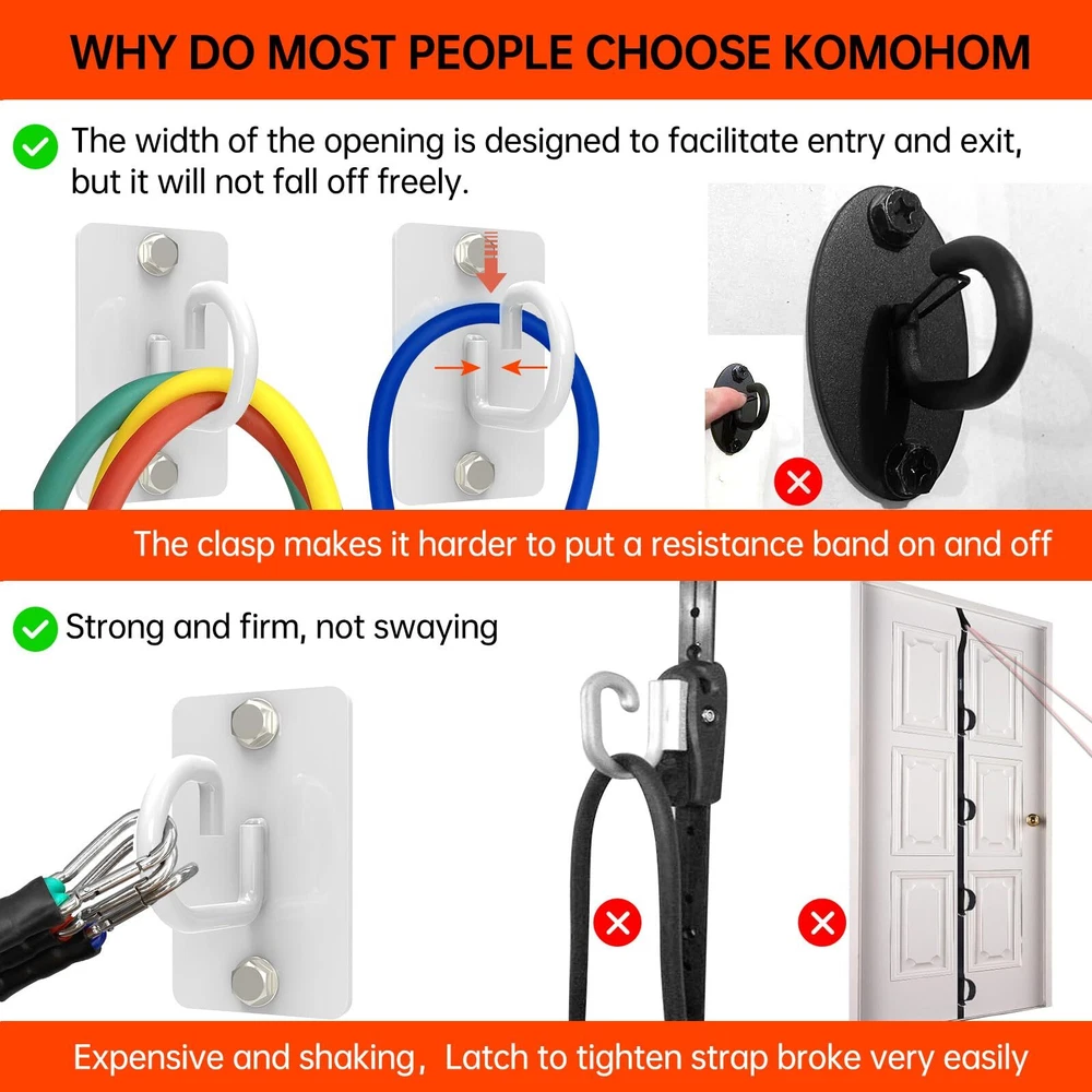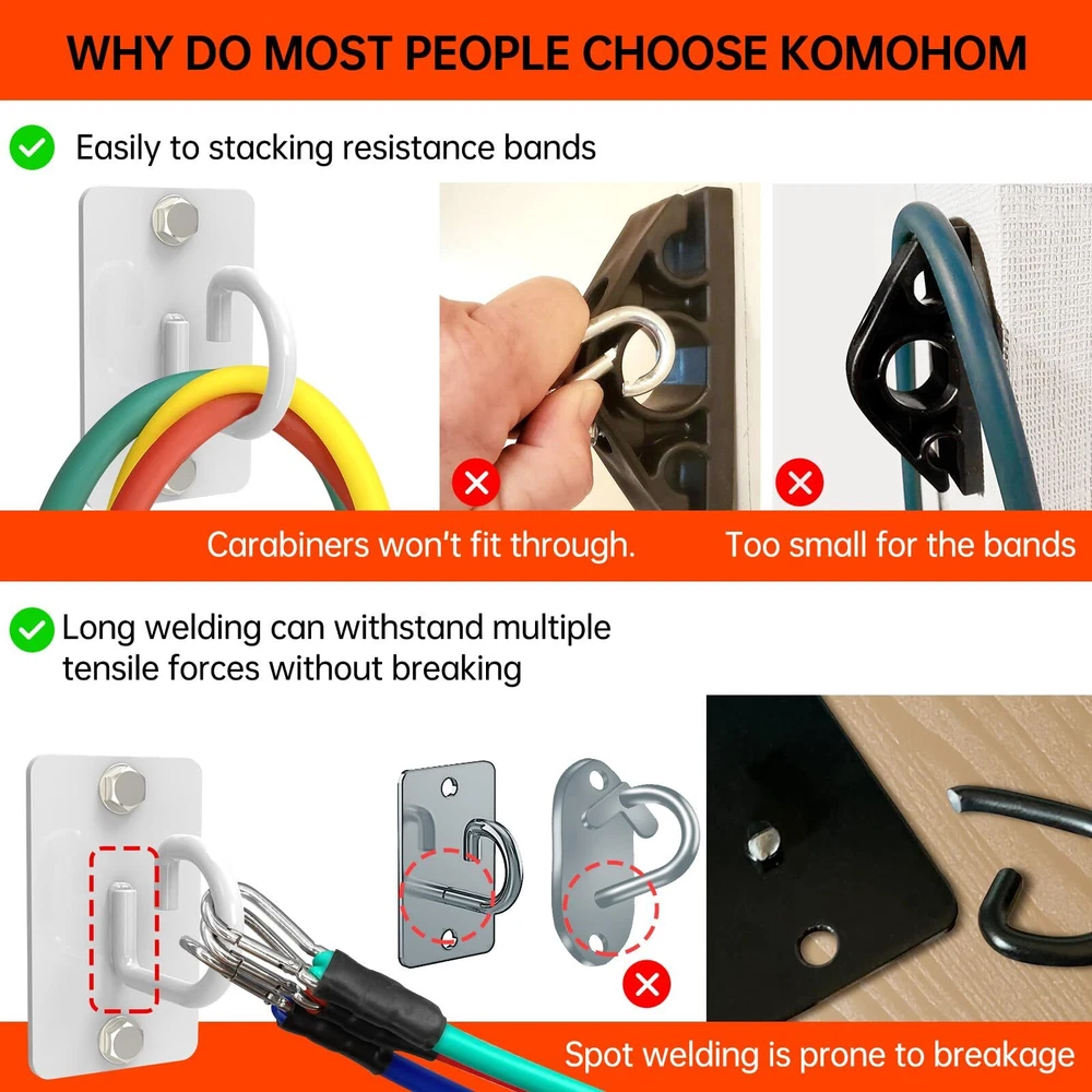 Versatile: Our workout band anchors allow for a wide range of exercises and angles, targeting multiple muscle groups including legs, abdominals, chest, back, shoulders, and arms. Durable Material:Made from thickened stainless steel, our resistance band hooks are resistant to rust and corrosion, providing long-lasting use.The whole Resistance Band Wall Anchor is made of high-quality steel, and the thickness of the bottom plate reaches 3 mm.The G hook and the base plate are welded into a strip, and the welding area is three times that of other brands, so the product is more solid and reliable.which can safely fix various resistance bands, suspension training straps, elast Superior Strength:Each exercise band wall mount is capable of accommodating a pull force of up to 400 pounds, ensuring durability and safety during intense workouts. No falling off or slipping off: The unique G-shaped opening design of the resistance band wall anchor can prevent the resistance band from slipping off during use. and The Wall Mount Workout Anchors is quite easy to quickly put these bands in or take them out, which is suitable for most resistance bands in the market. Easy Installation: Equipped with large lag bolts, our resistance band anchor ensures a secure and sturdy attachment to walls, allowing for convenient home workouts. Perfect for Home Gym: With our resistance band wall mount, you can transform any space into a fully functional exercise area with exercise equipment accessories, enjoying a variety of exercises and stretches right from the comfort of your home.