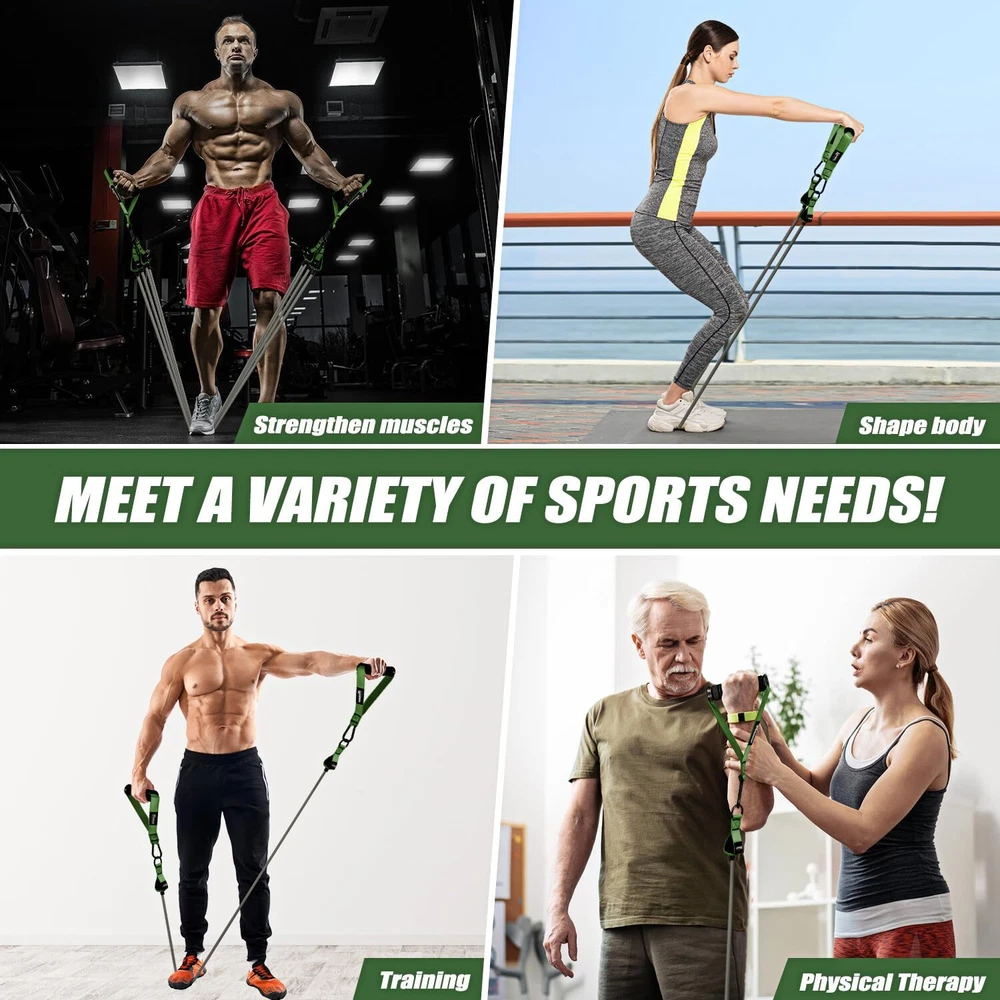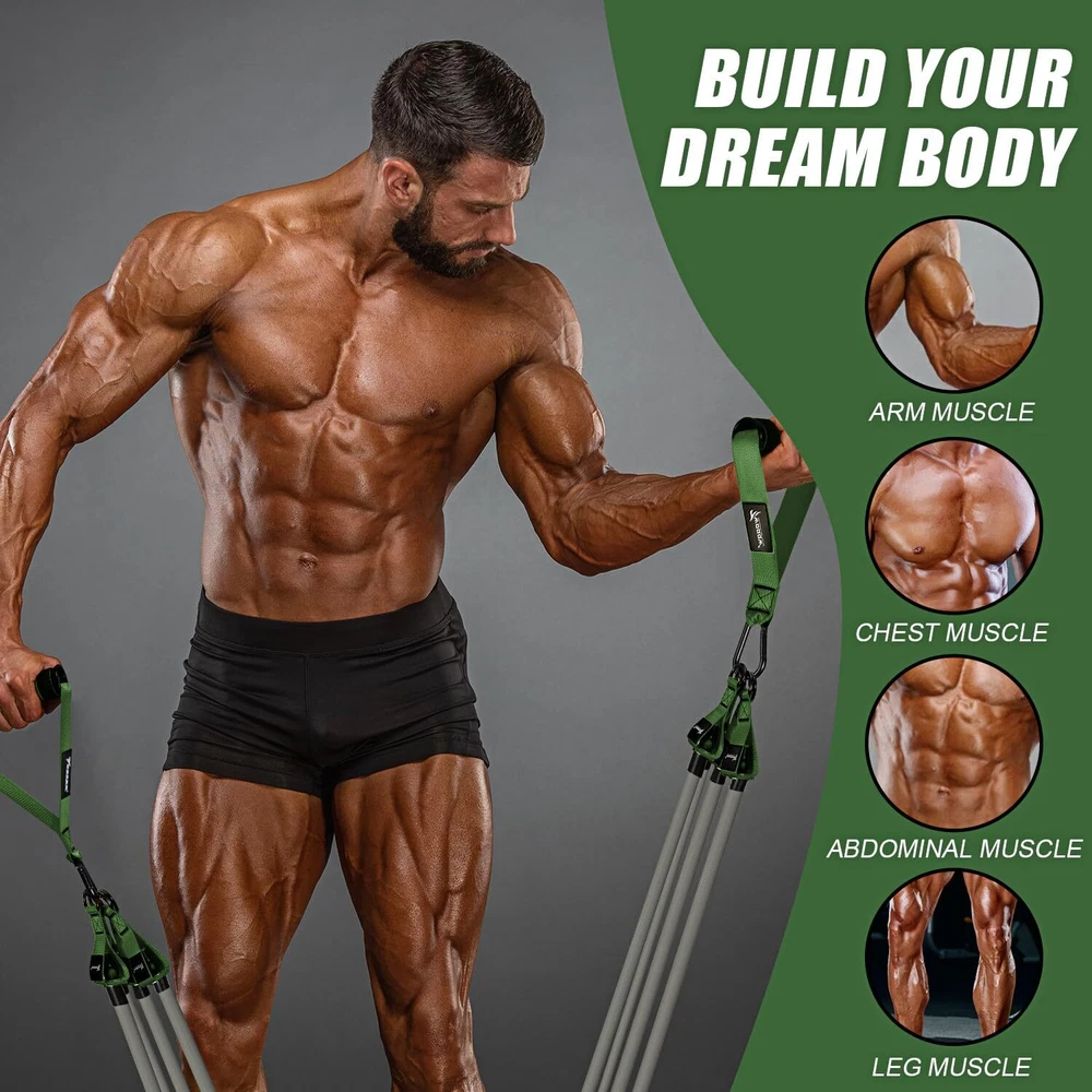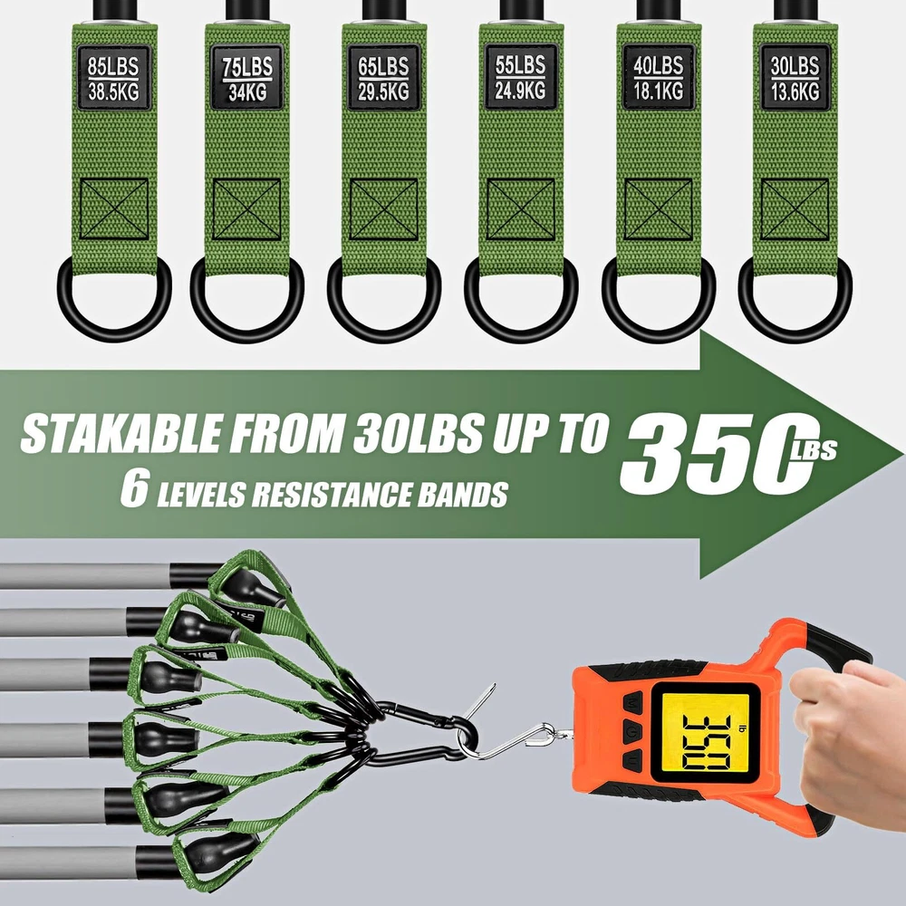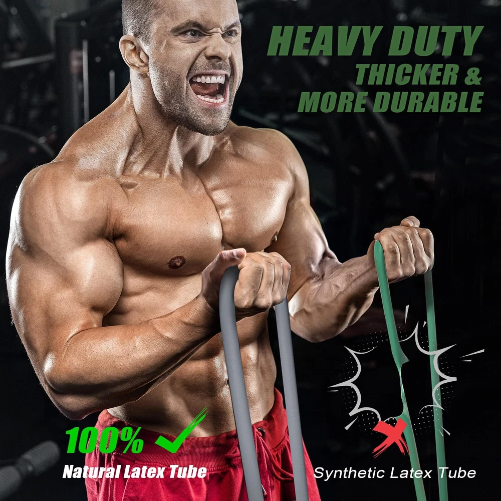 【World's First 350 lb Heavy Duty Resistance Bands】We understand that everyone's fitness journey is unique, and each individual's pursuit of muscle and strength varies. That's why we've crafted this high-quality heavy-duty resistance bands set, made from 100% natural latex for enhanced durability, resilience, and extended lifespan. A real man's resistance band suit, it's here, do you dare to challenge it? 【Adjustable Resistance Band Set】6 resistance levels, 30/40/55/65/75/85 lbs, can be used alone or stacked in any combination, you can adjust the resistance from 30 lbs to 350 lbs, the maximum weight is 350 pound. Whether you are a fitness enthusiast or a beginner, this set of high-quality resistance bands can meet your workout needs and give you a lot of room for improvement 【Build Perfect Healthy Body Shape】Resistance training is an effective way to burn fat and build muscle strength, which can improve your coordination, endurance, flexibility and balance. It works different muscle groups such as shoulders, arms, abs, legs and buttocks. Build perfect pecs and abs with our resistance band set, and shape your perfect healthy curves. They are the perfect gym equipment for both men and women 【Resistance Bands with Handles】resistance bands feature ultra-heavy-duty exercise handles made from military-grade ABS material, thick premium sponge padding, and reinforced braided nylon straps. With an impressive weight tolerance of up to 1200 lbs, they ensure a secure and comfortable workout. The durable high-quality sponge material is breathable, sweat-absorbent, and non-slip. The super-wide design fits all hand sizes, enhancing your fitness experience 【Portable Private Gym】This resistance band with adjustable ankle strap and door anchors works seamlessly with all exercise programsm, whether you're at home, in the gym, outdoors, or traveling. You only need to bring this lightweight resistance band set, without the need for bulky equipment, to perform a variety of effective exercises and work out different muscle groups. The included high-quality cushioned door anchor protects the resistance band from wear and tear during use 【True Lifetime Satisfaction】At , we believe in creating durable and long-lasting fitness products that support every rep, every workout, and every goal. That's why we offer a full refund or replacement guarantee on every product we provide. If you're looking for real resistance instead of those cheap and flimsy 150-pound bands, treat yourself to a set of high-quality resistance bands today!