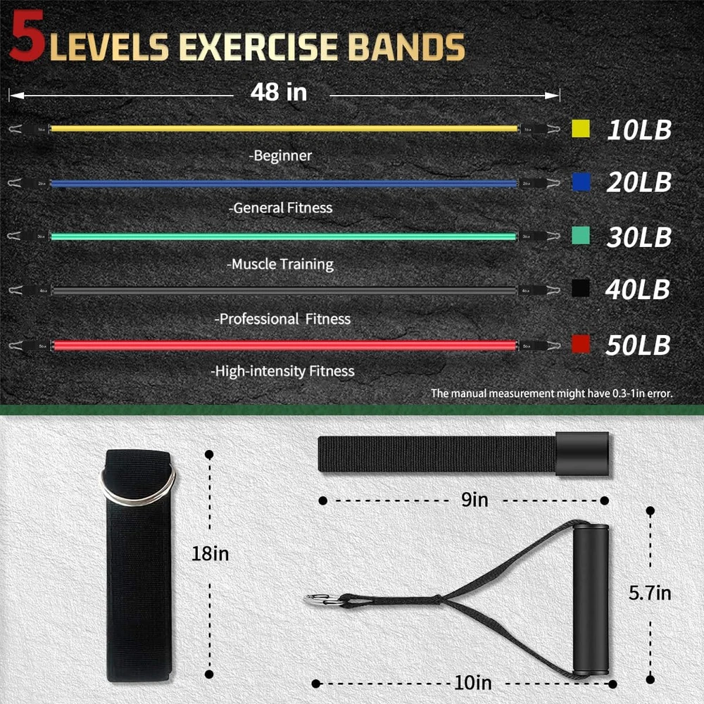 Natural Latex Imported Adjustable Resistance Bands - Maximum equivalent of 150 lbs, come as a set of 5, 48-inch long colored exercise bands: Yellow(10 lbs), Blue(20 lbs), Green(30 lbs), Black(40 lbs), Red(50 lbs). You can use the bands independently or in any combination with a maximum resistance level of 150 lbs Multifunctional for Workout - VEICK resistance band set is great with any workout like Yoga, Pilates and Fitness. Or use them for general exercise, stretching, training, weights programs Mobile Gym to Build Muscles - You can use the resistance bands with ankle straps and door attachment to exercise at home or outside.You can do exercise anytime and anywhere to burn fat and improve balance, mobility, gait function Portable & Easy to Store - These bands are so lightweight and this resistance kit comes with a cloth pouch. It is very convenient to carry and store What are included: 5 Tube Resistance Bands, 2 Soft Cushioned Handles, 2 Ankle Straps,1 Door Anchor,1 Exercise Guidance, 1 Carrying Bag Product Description VEICK Resistance Bands Set The video showcases the product in use. The video guides you through product setup. The video compares multiple products. The video shows the product being unpacked. Keep Fit Anywhere With a storage bag, you can easily put them in your suitcase or pocket and carry them to anywhere. Combine multiple fitness bands The clip resistance bands will work fine for resistance strength training Suitable for all ages to do aerobic exercise Suitable for men and women to do weight lifting and athletics motion High-quality details Resistance tubes are made of natural latex,stronger and stretch further; 1 Keep Fit Anywhere 2 Combine fitness bands 3 Suitable for exercise 4 High-quality details More Options Add to Cart Add to Cart Add to Cart Add to Cart Add to Cart Add to Cart Add to Cart Customer Reviews 4.5 out of 5 stars 298 3.8 out of 5 stars 18 4.3 out of 5 stars 80 4.5 out of 5 stars 233 4.5 out of 5 stars 86 4.6 out of 5 stars 21,135 4.6 out of 5 stars 21,135 Price $39.99 $ 39 . 99 $64.99 $ 64 . 99 $129.99 $ 129 . 99 $5.99 $ 5 . 99 $32.99 $ 32 . 99 $39.99 $ 39 . 99 $39.99 $ 39 . 99 Quantity 18 pcs 1 pc 2 pcs 5 pcs 13 pcs 16 pcs 16 pcs Material Latex Iron Iron Latex Latex Latex Latex Occasion Gym, Home, Outdoor Gym, Home, Outdoor Gym, Home, Outdoor Gym, Home, Outdoor Gym, Home, Outdoor Gym, Home, Outdoor Gym, Home, Outdoor Features Build your muscle Build your muscle Build your muscle Build your muscle Build your muscle Build your muscle Build your muscle Users Men & Women Men & Women Men & Women Men & Women Men & Women Men & Women Men & Women
