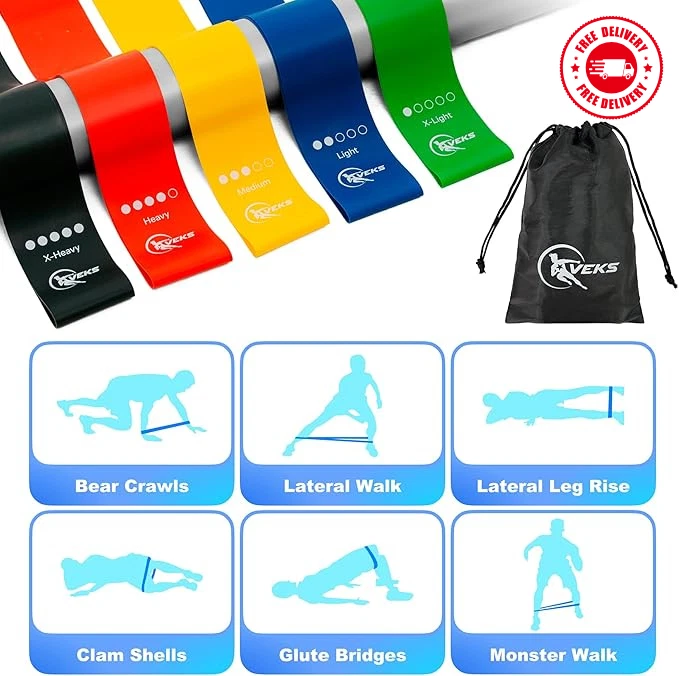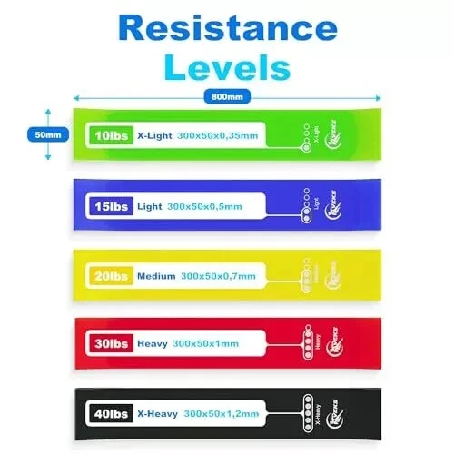 About this item Natural latex material: Made of strong and durable raw material to withstand pressure over time and to last for years. Superior Quality. All Our Exercise Resistance Bands Are Thoroughly Tested Before We Ship Them Out To You. This Ensures Your Bands Are Easy On Skin And Will Provide You With A Worry-Free Experience. Resistance bands 5-pack: This workout set for women includes 5 resistance bands for stretching and strength training. Everyone can find a suitable one for Yoga, physical therapy, and pilates. The bands allow you to mix and match to get your desired weight level—from 10 lbs up to 115 lbs when combined, suitable for someone just starting out or an experienced gym-goer. Pocket-sized portability: Training with bands has achieved the same results as free weights but with portability and low joint stress. Our set of resistance bands allows you to perform over 150 different exercises with a wide range of resistance/weight, allowing you to work any muscle group in your body in countless ways. Multi-purpose: Ideal for physical therapy, rehabilitation, pull-ups, stretching, strength training, powerlifting, and more. What you get: Five exercise bands with color-coded resistance levels, a portable travel carry bag, and an instruction guide.