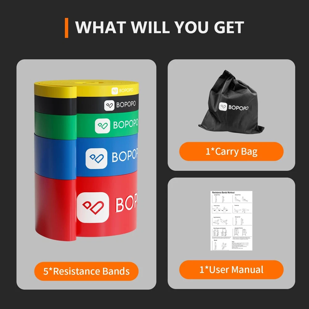 【2024 Neues Upgrade-Material】After much research and testing, we use the latest material - silicone. Compared with the latex and ETP materials on the market, resistance bands are more wear-resistant and durable. Even if you cut a slit in the workout bands, it will not break easily. What's more the odour is smaller and softer. is committed to bringing customers a more perfect sports experience. 【Different Levels Of Resistance Bands】pull up resistance bands with 5 different Levels for different workouts at different weights. Yellow(5-30 lbs), Best for speed barbell training and shoulder mobility. Black(15-50 lbs), Prefect beginning bands for resistance training. Green(35-115 lbs), Medium tension for resistance training. Blue(50-135 lbs), High tension for resistance and advanced banded barbell training. Red(60-170 lbs), Ideal for pull up assist training,Powerlifting andstretching. 【Comprehensive Full-Body Training】This resistance bands for working out offers different levels of resistance for squats, bench press, pull-ups, push-ups, rows, yoga, stretching, gymnastics, physiotherapy, weight lifting, barbell and dumbbell assistance and more. Can strengthen your shoulder, legs, back, arms, buttocks, or abs, for a full-body workout. 【Your Mobile GYM】This workout resistance bands with a storage bag, you can easily put them in your suitcase or pocket and carry them to anywhere. Whether you're travelling, in a hotel, or at the gym, it's always possible to keep up the fitness habit and enjoy a workout. elastic bands are also an excellent addition to your home gym. 【Best Alternative To Barbells】The five resistance levels provide options for every stage of weight training, offering a fantastic alternative to dumbbells and barbells. Exercise bands give you a full workout without wear and tear on joints, bones and tissues. This is a perfect option for long term fitness friends. 【The Best Gift For Your Loved Ones】No gift is more precious than a healthy body.This heavy resistance bands would makes a perfect gift for a husband, wife, dad, mom, friends on Christmas, Mother's Day, Father's Day, birthdays and Valentine's Day.