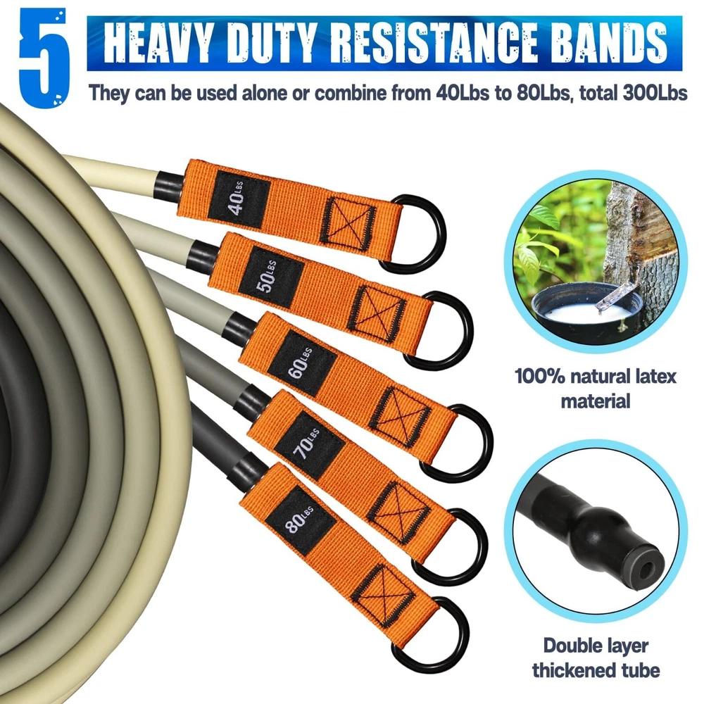 Ready to elevate your workout to new heights? Are you up for the challenge? You don't need to spend much money to buy expensive gym fitness equipment. Our strength bands set is just what you need for an improved training routine. MULTIPURPOSE EXERCISE BANDS – Create a perfect peach butt, groom leg lines, raise the hip curve, and local shaping loss of fat, arms, chest, abdomen, glutes, and legs thanks to these durable workout bands, perfect for activating your muscles before any heavy lifting. Designed for individuals ready to embrace the intensity and redefine their fitness limits, these resistance bands with handles are designed specifically for those who dare to push their limits, with five levels ranging from 40 lbs to 80 lbs. FOR MAXIMUM RESULTS– When it comes to activating your muscles, these exercise resistance bands can be a perfect alternative to lifting weights to stimulate your muscle growth without putting strain on your joints the way heavy weights can do. It is ideal for assisting with heavy resistance training, physiotherapy, muscle training, yoga, and Beach Body workouts. FOR BETTER LOWER BODY WORKOUTS -Not just heavy resistance bands, our gym workout set also comes with two ankle straps with door anchor which are easy to connect to your ankles with a pull cord on the D-ring. Now you can try some new exercises like enhancing ankle strength, leg thrusts, hip abduction & adduction, inner & outer thigh contractions, walking side steps, leg press, and have more fun than before! PACKAGE INCLUDES: 5 x Latex Resistance Bands for Customizable Intensity 2 x Ergonomic Handles for a Comfortable Grip 1 x Door Anchor for Versatile Exercise Options 2 x Ankle Straps for Targeted Muscle Engagement 1 x Portable Carrying Bag for on-the-go Fitness DON’T WAIT AND GET YOUR STRENGTH TRAINING EQUIPMENT SET TODAY! 💪 300LBS RESISTANCE BANDS SET – This isn't your average resistant bands for exercise, it's the new and improved 300lbs resistance band set, with a maximum tension of 300lbs and five distinct resistance levels, ranging from 40lbs to an impressive 80lbs, making them adaptable for users of all strength levels of weight band set. 💪 HIGH-QUALITY GYM ACCESSORIES - The perfect home gym exercise equipment for those seeking an unparalleled challenge in their workout routine. Compared with regular workout bands, our resistance bands for working out are made from 100% latex, making them more elastic, safe and reliable to withstand intense daily exercise sessions. 💪 HEAVY-DUTY RESISTANCE HANDLES - Each workout set includes two durable handles made of thickened foam material, reinforced stitching and steel D-ring, that provide a comfortable grip for various exercises, that can withstand over 300 pounds, ensuring a seamless and effective workout experience. Empower your men and women training with our versatile exercise band set, tailored for training needs and boasting a remarkable 300lbs resistance band suit. Elevate your workouts to new heights 💪 BUILD YOUR LOWER BODY MUSCLES -Transform your door into personal gym with the door anchor and 2 ankle straps. Just fasten the gym ankle straps to your legs, connect them on the door anchor, and start improving your range of motion and balance, calf, leg and lower body, 💪 IMPROVED FULL BODY EXERCISES –Workout your upper and lower body and perform different types of exercise, like toning your glutes, abs, biceps, triceps, legs and knees, with the exercising bands for strength training which are lightweight and easy to packed into the carrying bag, so you can take them anywhere you go!