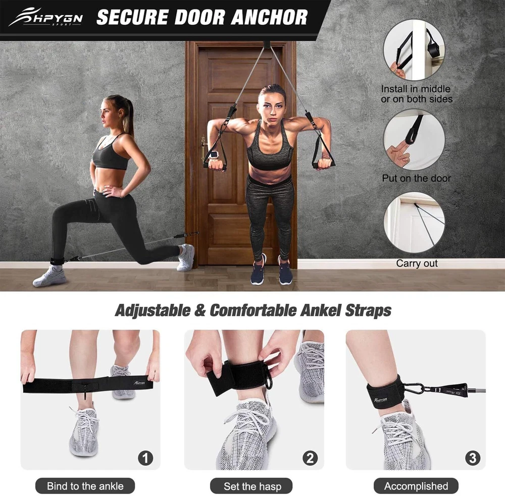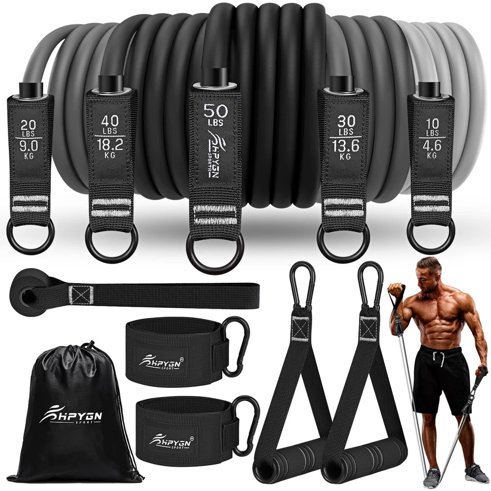 đŸ’ȘThe Resistance Bands Set are ideal for Strength training Physical therapy Home workouts Body shaping Weight loss. ❀YOUR PERSONAL HOME GYM – Got no time to head down to your local gym every day? With this set of resistance bands, you can enjoy a full body workout without even stepping out of your home. ❀TRAIN DIFFERENT MUSCLE GROUPS – Use these fitness bands to perform rows, pulls, raises, and fly workout sets to exercise your arms, back, hips, legs, chest, and abdominal region. You can use resistance bands to replace dumbbells or weights. ▶New upgrade Strong rubber bands provide consistent resistance for every movement and give you enough flexibility to do hundreds of different exercises from beginner level through advanced. Virtually guarantees you'll never grow bored of your workouts. ▶The Resistance Bands Set can be integrated seamlessly to improve your muscular endurance, strength, balance, flexibility, body awareness and co-ordination. ▶Apart from body building and fat burning, the fitness set is also useful for injury rehabilitation, perfect for beginners to experts. ▶The foam handles are made of anti-slip, sweat absorbing material for a comfortable frip. The door anchor turns your door into your own gym in seconds. ▶At compact package size and light weight, the workout set will surely be a convenience and guarantee a much more interesting trip. ❀100% Satisfaction! ✅ Insanity Resistance Bands are built to last with high-quality materials and attention to detail and safety that exceeds market standards. Should your bands ever break, we’ll replace them for you at no cost to you. 【NEW Upgraded Resistance Bands 】 We have completely optimized this fitness band based on customers’ feedback, improved the traditional production process and adopted a new type of latex material to make the tension rope more durable and elastic, and to longer the life of product; and harmless to our health! We optimized all of the selective accessories, regardless of cost. 【Natural Latex bands】Exercise bands Set are made from 100% natural latex, extra thick high-grade silicon that will not snap, or deform. strong fabric and steel D buckles, With sweatproof and skidproof handles, Each band is double layered and carefully constructed to provide maximum resistance. 【For Every Kind Of Workout 】 Use workout band to intensify your muscles and build that perfect beach body.The resistance band set can be great with any popular workout like Yoga, Pilates and more. Or use them for general exercise, stretching, strength training, power weight programs. 【5 Different Levels】The resistance bands come with 5 different resistance level 10lbs, 20lbs, 30lbs, 40lbs and 50lbs in 5 different colors. You can use the bands independently or in any combination with a maximum resistance level of 150lbs.It comes with 5 latex resistance bands, 2 hand grips, 2 ankle straps, 1 door anchor, 1 workout poster, a carry bag. 【Please rest assured to buy】We are very confident in our products, if you like our products, please add them to your shopping cart, if you have any confusion, please contact us in time, we will provide you with a satisfactory solution, or If you have better suggestions for our products during use, please contact us, we can improve the products and provide consumers with better products.